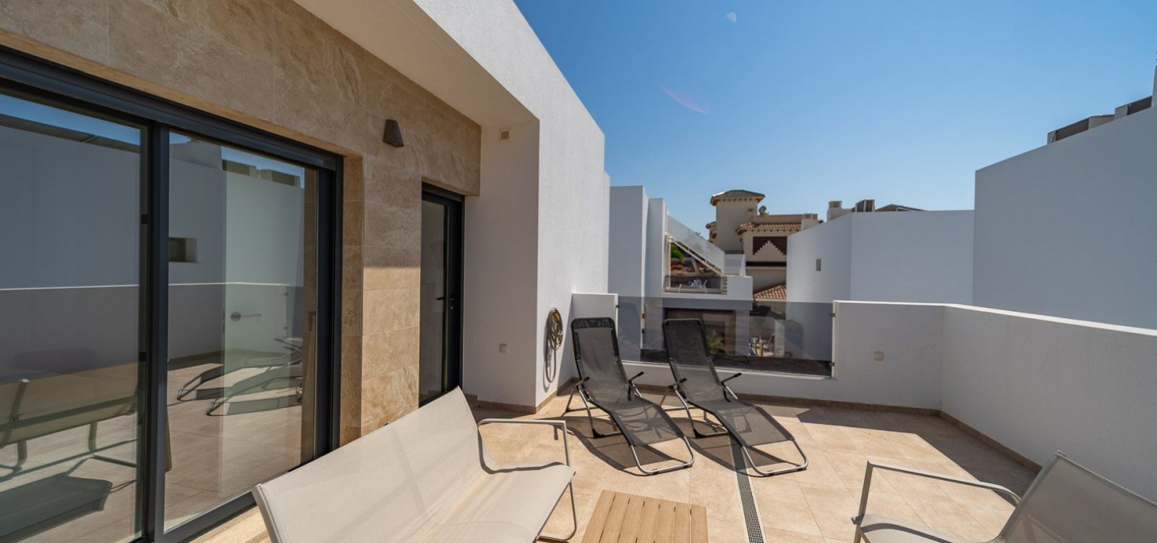 Op de begane grond bevinden zich een ruime woon-/eetkamer met open keuken , een gastentoilet en een hoofdslaapkamer met en-suite badkamer . Boven vindt u twee extra slaapkamers, een complete badkamer en toegang tot een zonnig terras .