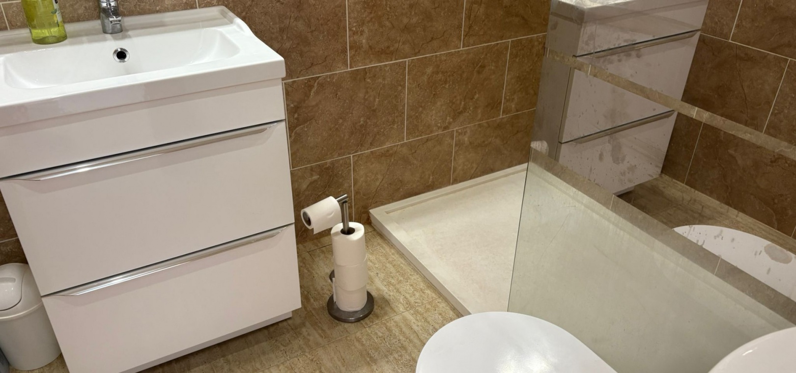 Er zijn twee tweepersoonsslaapkamers , elk met ingebouwde kasten , en een moderne doucheruimte .