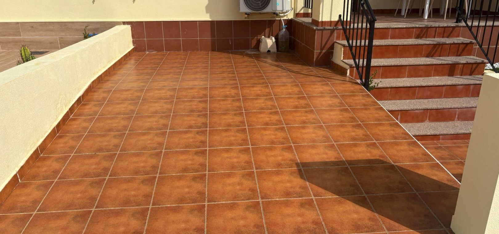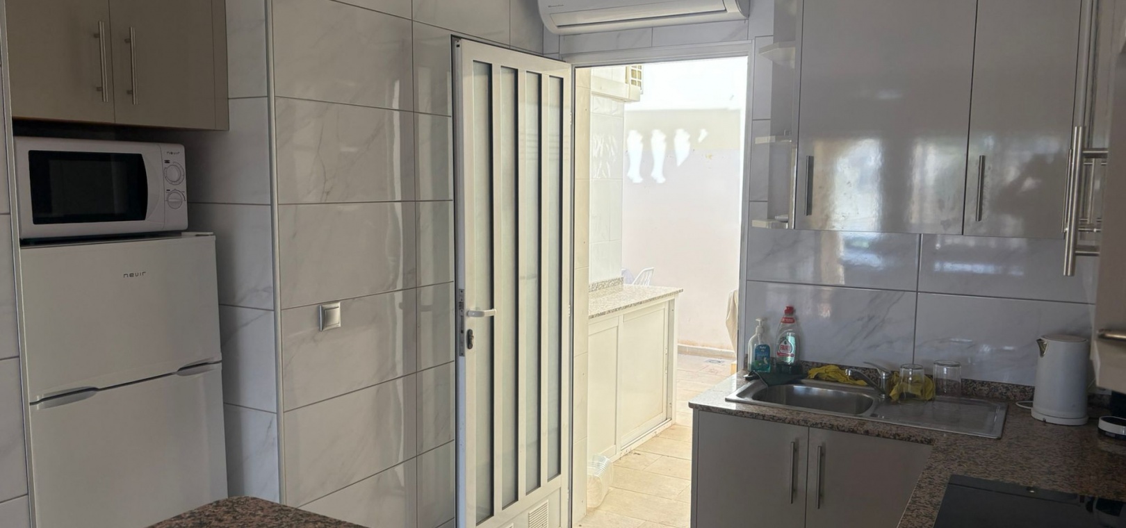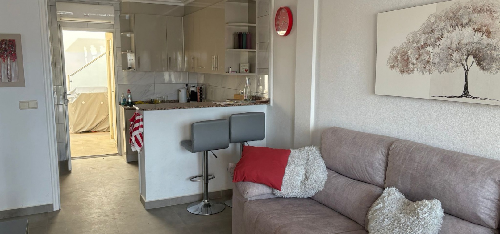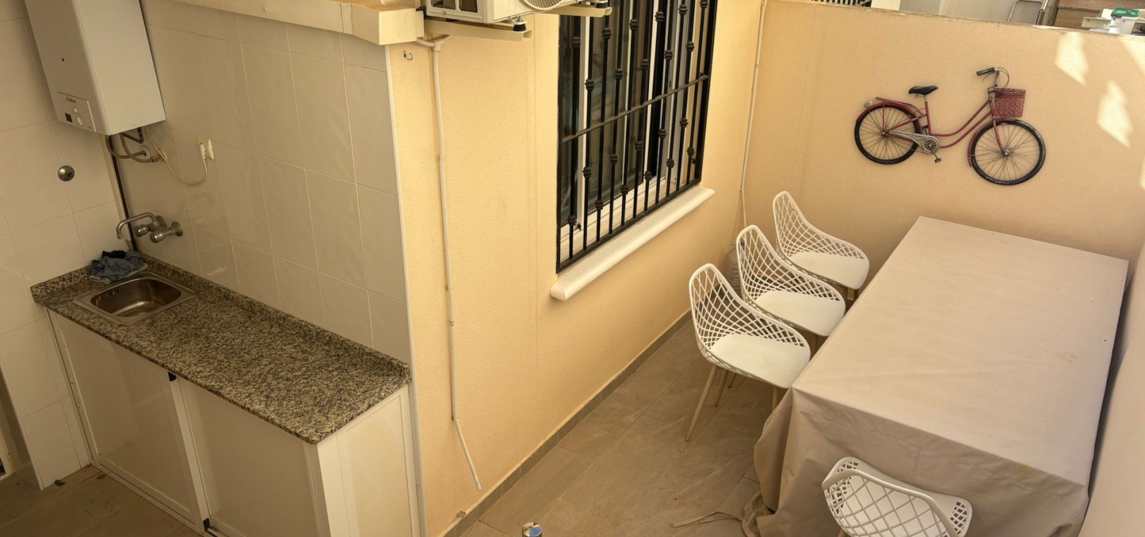 Binnen is de indeling licht en praktisch, met een ruime woon-/eetkamer en een open keuken, compleet met alle apparatuur. De keuken heeft ook een handige achterdeur die leidt naar een bijkeuken en een trap naar het dakterras.