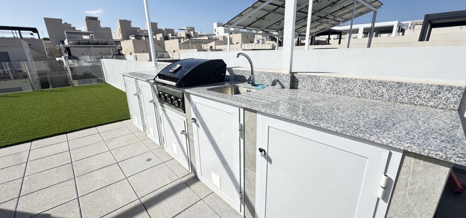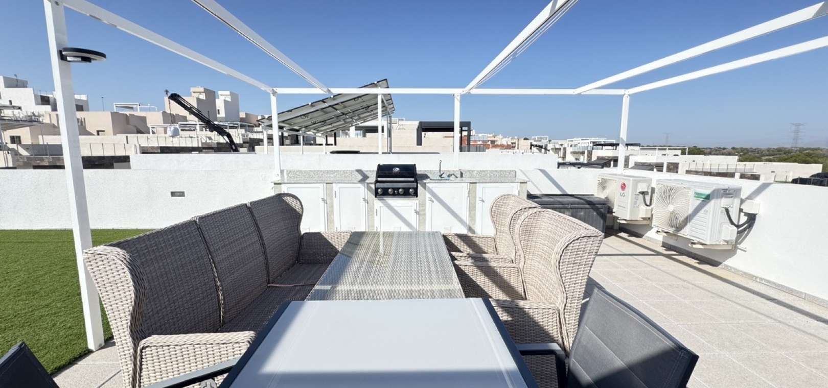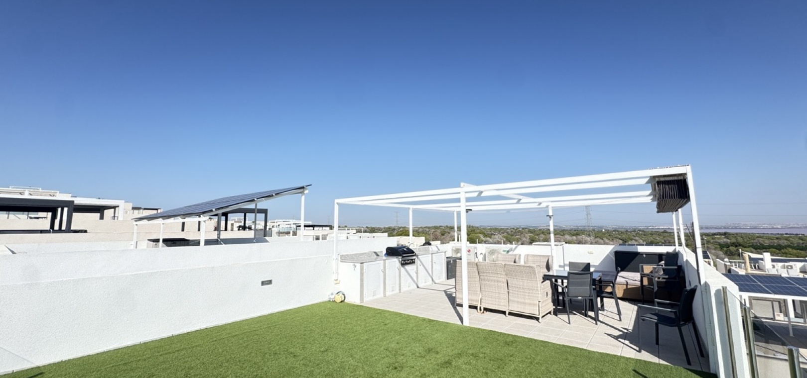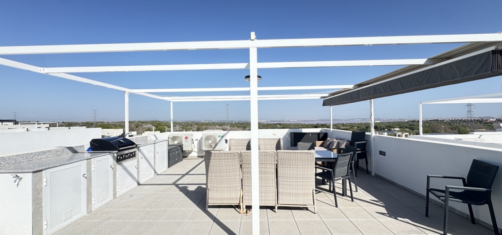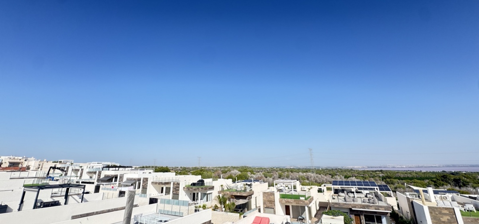 Ruime onderbouw – Inclusief 2 slaapkamers, 2 badkamers, een woonkamer en een bijkeuken – ideaal voor gasten, familie of om een eigen suite te creëren. Privézwembad en tuinen – Geniet van zonnige dagen en ontspan bij uw zwembad, omringd door prachtig aangelegde tuinen. Groot dakterras – Geniet van het adembenemende panoramische uitzicht op de roze meren van Torrevieja , een werkelijk unieke natuurlijke omgeving. Buitenkeuken en barbecueplek – Ideaal om gasten te ontvangen en te genieten van het buitenleven. Licht en luchtig ontwerp – Overvloedig natuurlijk licht vult elke hoek van dit moderne huis. Open woonkamer – Een ruime woonkamer en eetkamer sluiten naadloos aan op een strakke, volledig uitgeruste moderne keuken.