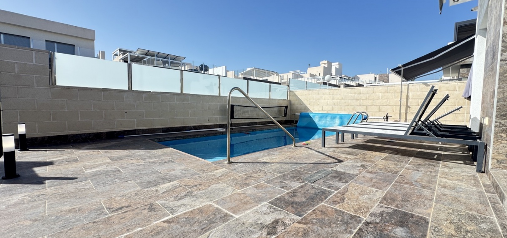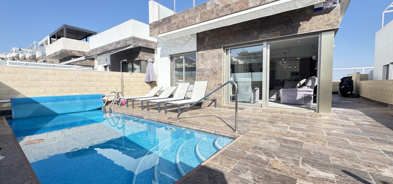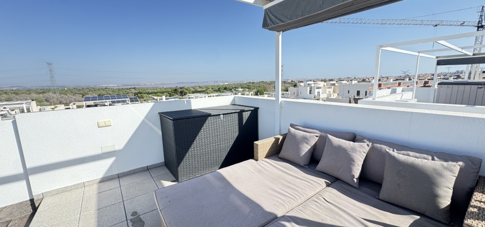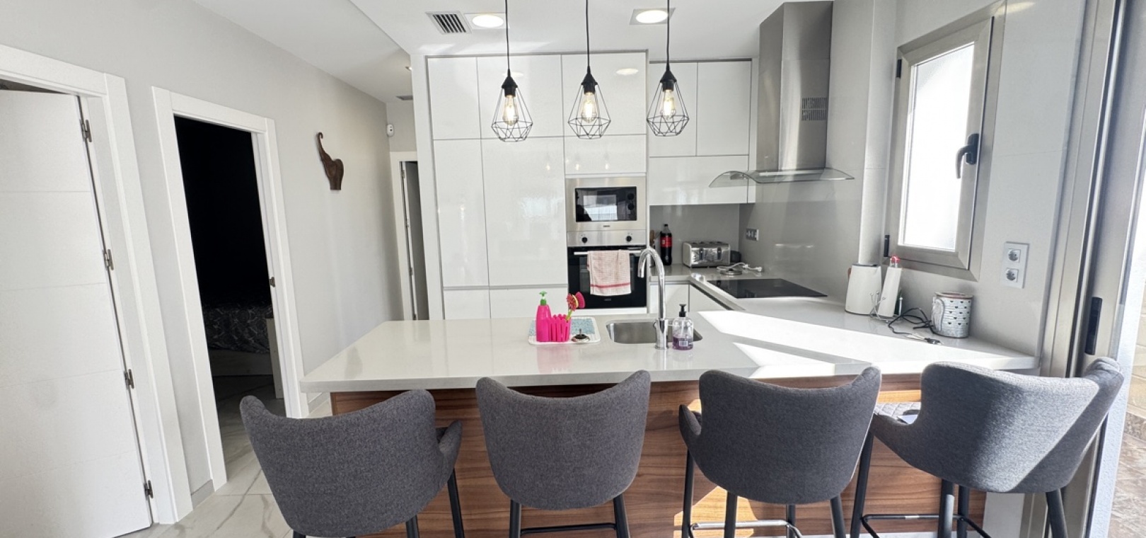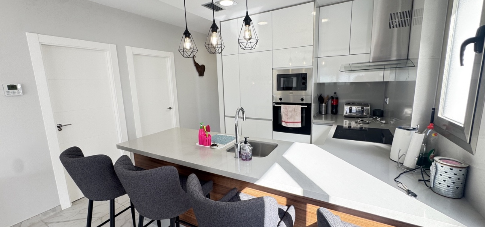 Ruime onderbouw – Inclusief 2 slaapkamers, 2 badkamers, een woonkamer en een bijkeuken – ideaal voor gasten, familie of om een eigen suite te creëren. Privézwembad en tuinen – Geniet van zonnige dagen en ontspan bij uw zwembad, omringd door prachtig aangelegde tuinen. Groot dakterras – Geniet van het adembenemende panoramische uitzicht op de roze meren van Torrevieja , een werkelijk unieke natuurlijke omgeving. Buitenkeuken en barbecueplek – Ideaal om gasten te ontvangen en te genieten van het buitenleven. Licht en luchtig ontwerp – Overvloedig natuurlijk licht vult elke hoek van dit moderne huis. Open woonkamer – Een ruime woonkamer en eetkamer sluiten naadloos aan op een strakke, volledig uitgeruste moderne keuken.