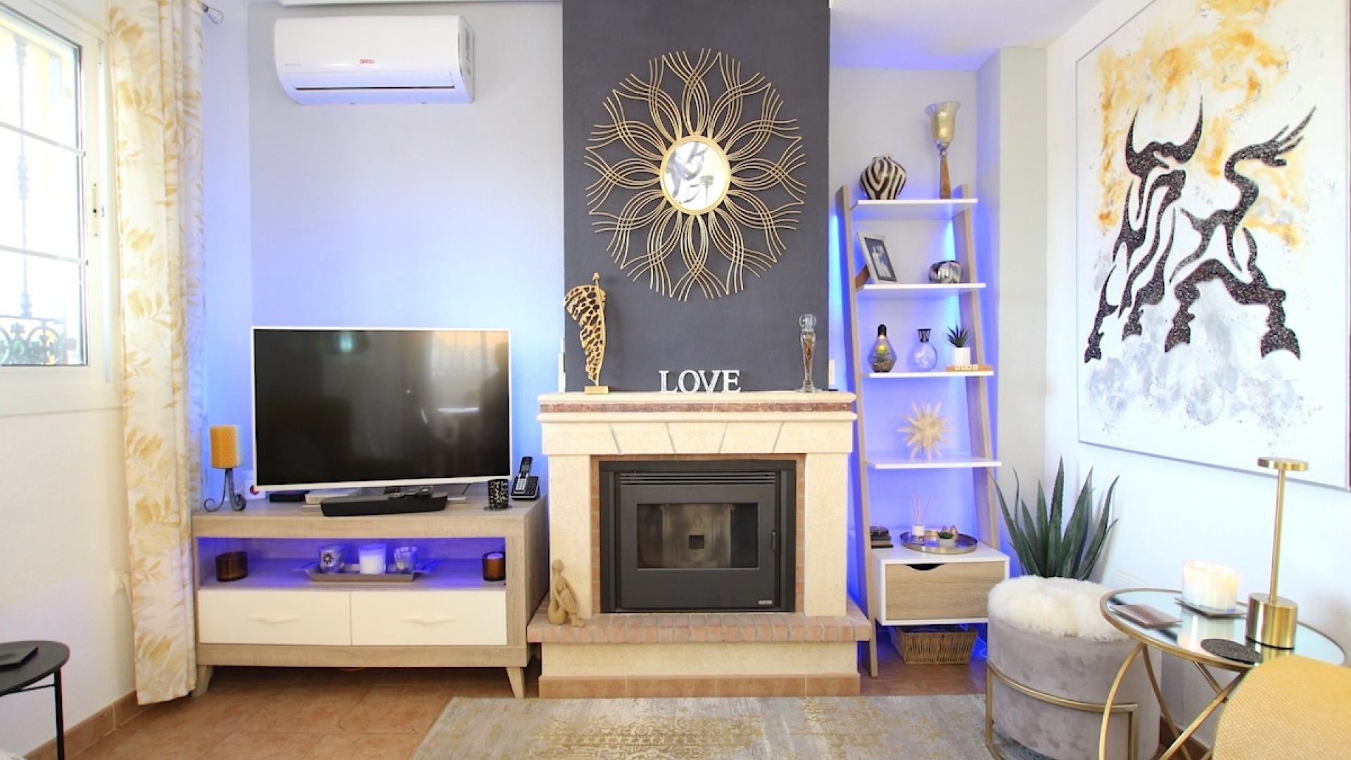Binnen vindt u een lichte en luchtige open woon- en eetkamer , gevuld met natuurlijk licht. De leefruimte is voorzien van warme en koude airconditioning en een hoogwaardige pelletkachel , die het hele jaar door comfort garandeert.