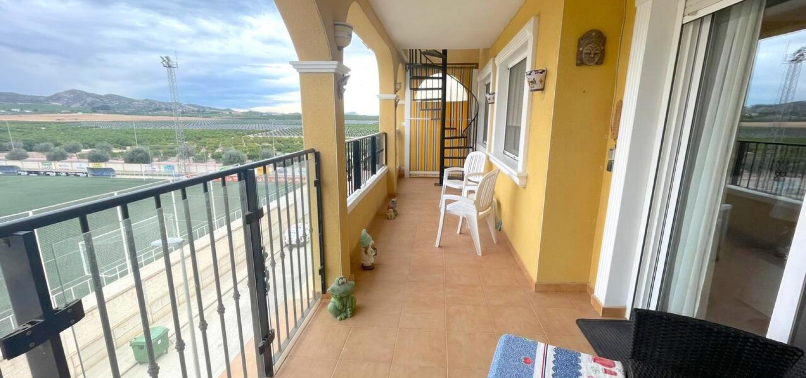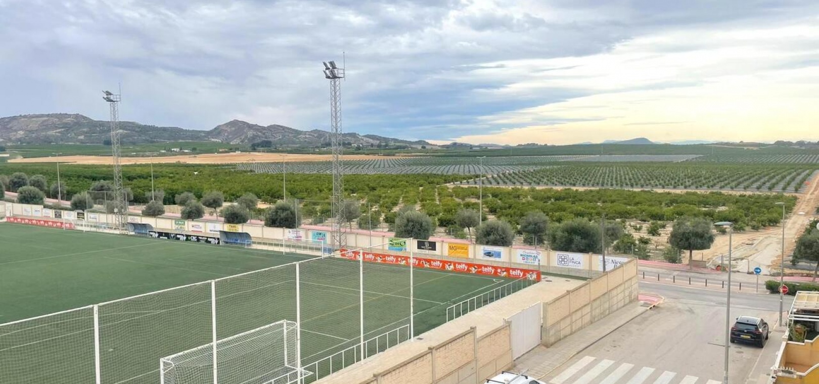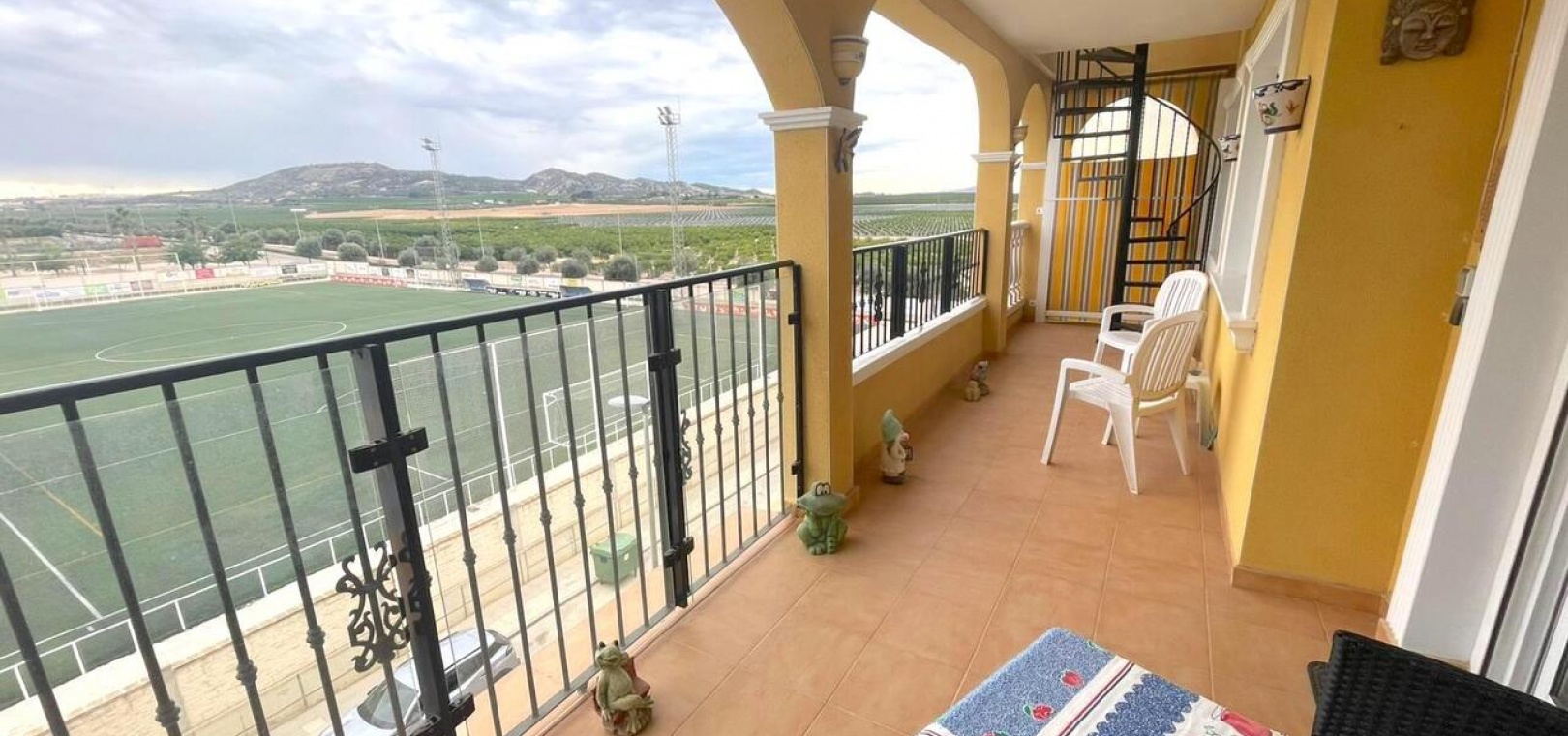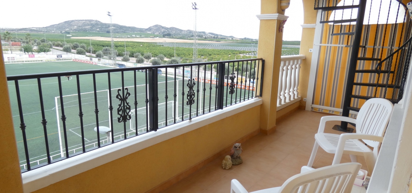 Een van de absolute hoogtepunten is het grote, privésolarium met panoramisch uitzicht over het omliggende landbouwlandschap, inclusief uitgestrekte sinaasappel- en citroenboomgaarden, en een direct zicht op het sportcentrum en het voetbalveld. Het solarium is op het zuiden gericht en geniet daardoor de hele dag van de zon, ideaal om te ontspannen of gasten te ontvangen.
