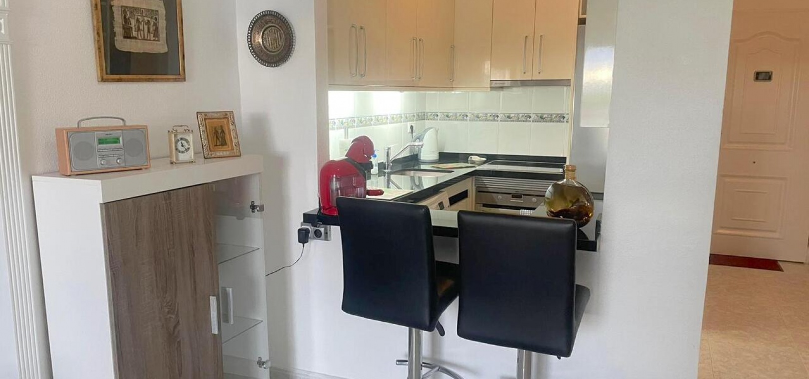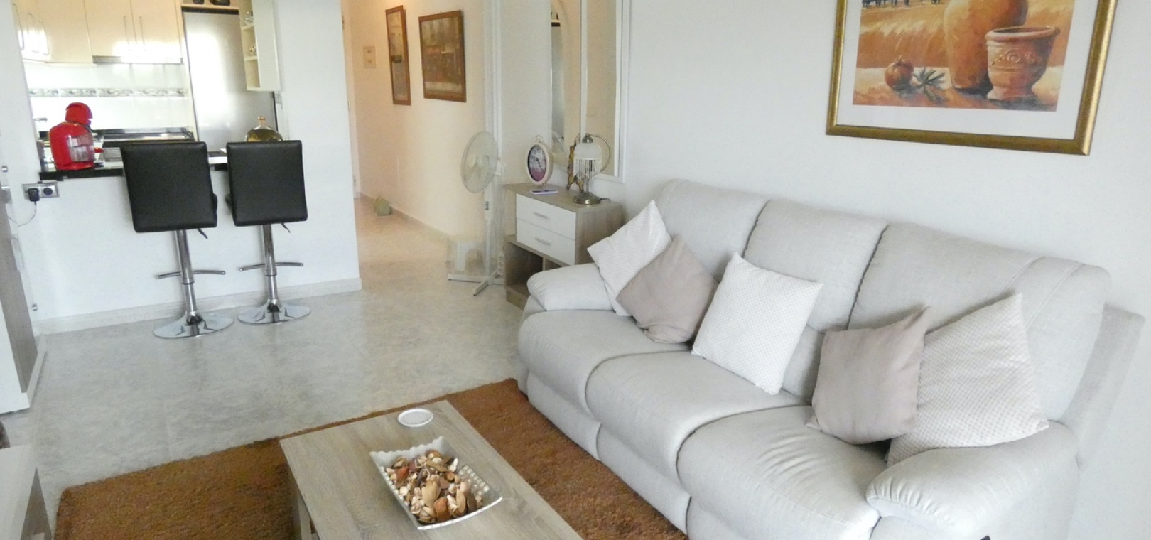 Het interieur beschikt over een lichte woonruimte met een nieuw geïnstalleerd centraal airconditioningsysteem voor comfort het hele jaar door, een gerenoveerde keuken met een aparte bijkeuken en een stijlvolle, moderne badkamer met een inloopdouche.
