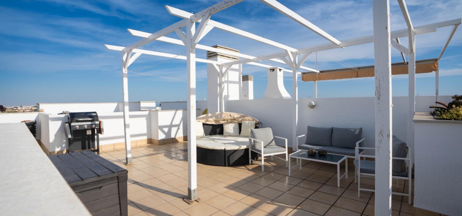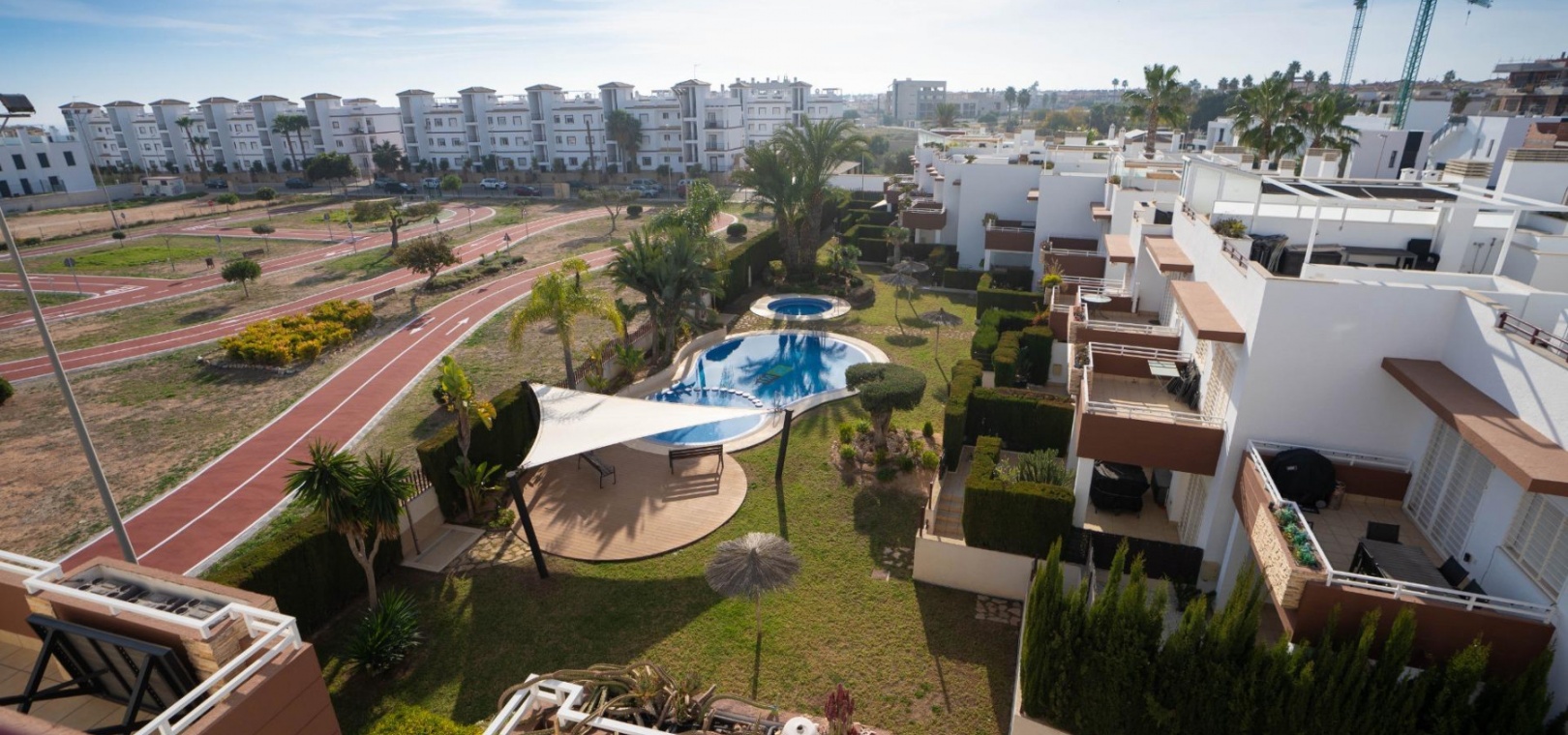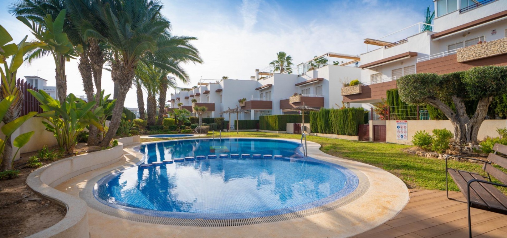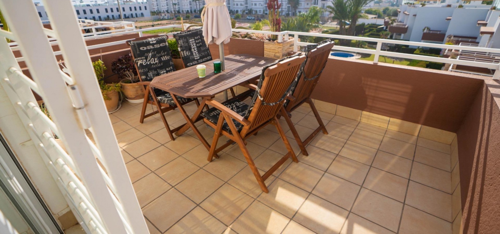 Het penthouse beschikt over een zonneterras op het zuidoosten en een groot solarium met direct uitzicht op het gemeenschappelijke zwembad en de weelderige tuinen. Er is een eigen parkeerplaats in de gemeenschappelijke parkeergarage.