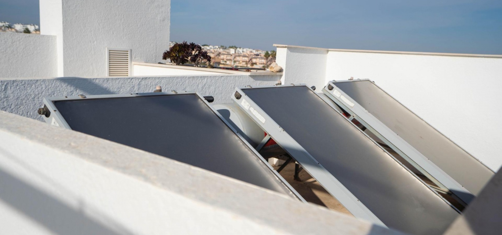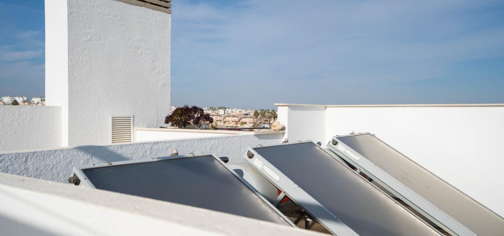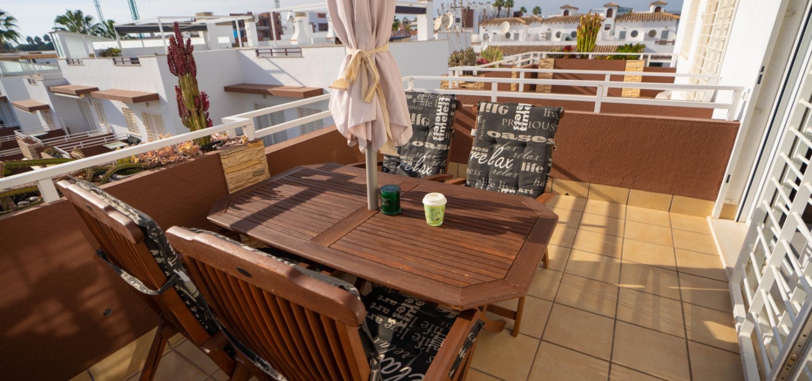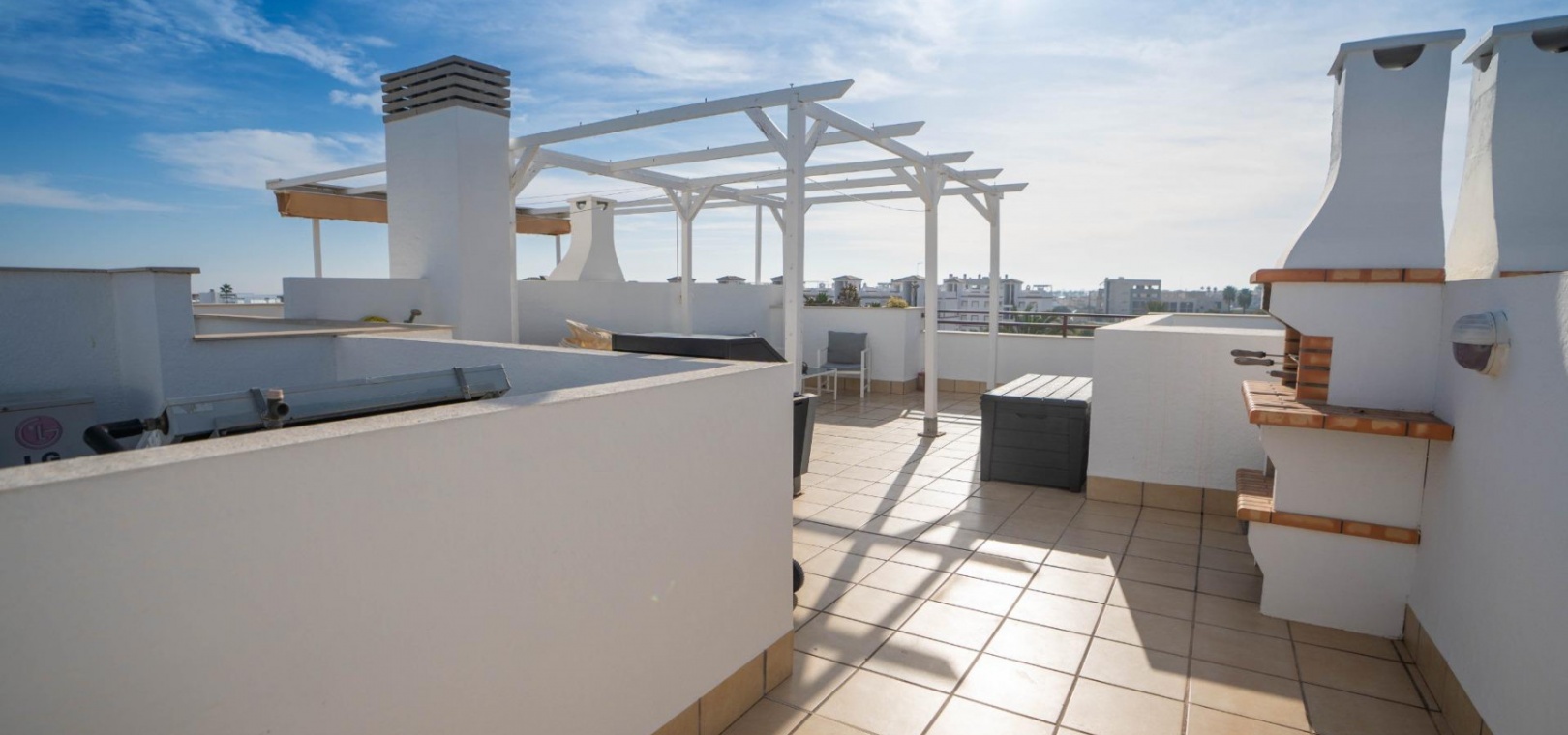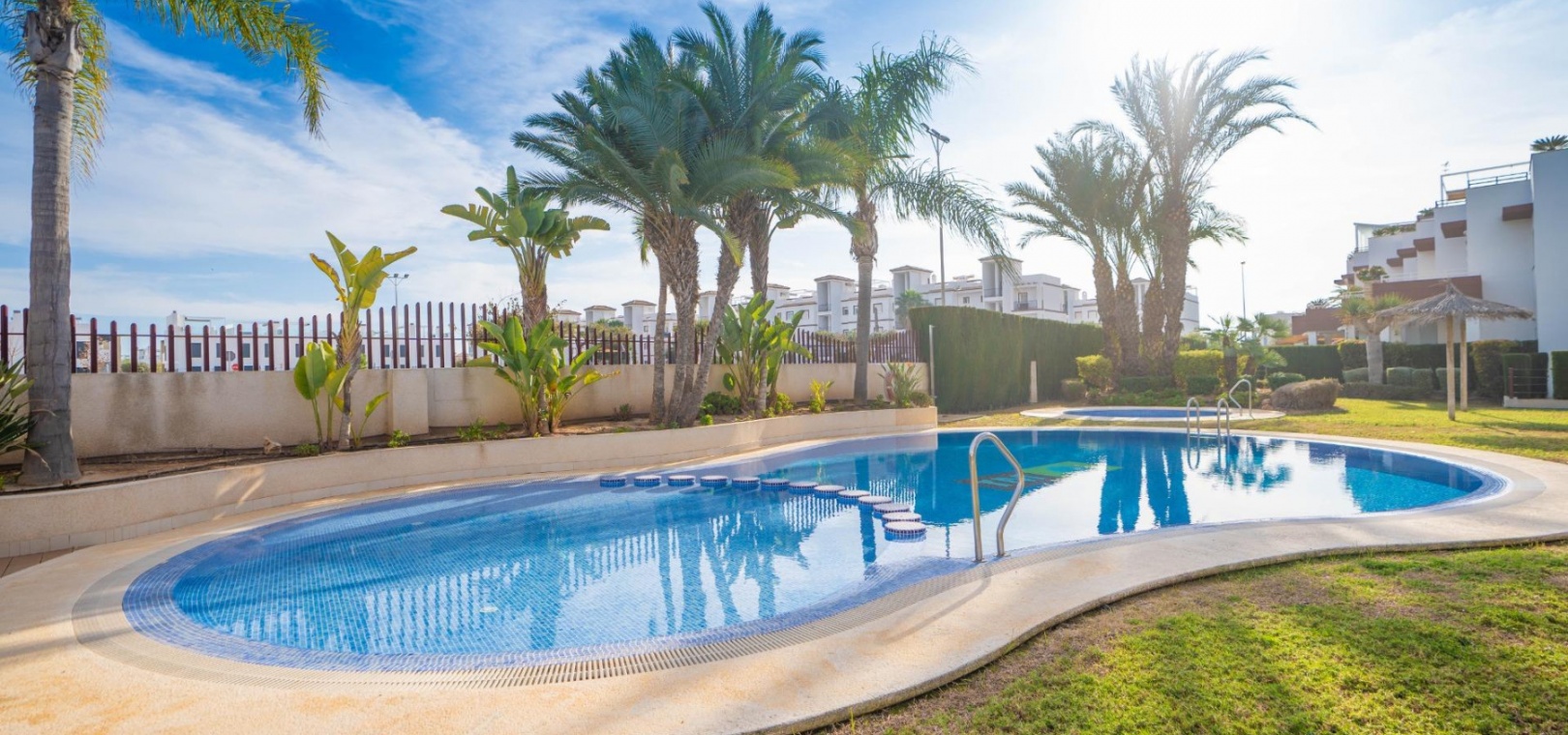 Het penthouse beschikt over een zonneterras op het zuidoosten en een groot solarium met direct uitzicht op het gemeenschappelijke zwembad en de weelderige tuinen. Er is een eigen parkeerplaats in de gemeenschappelijke parkeergarage.