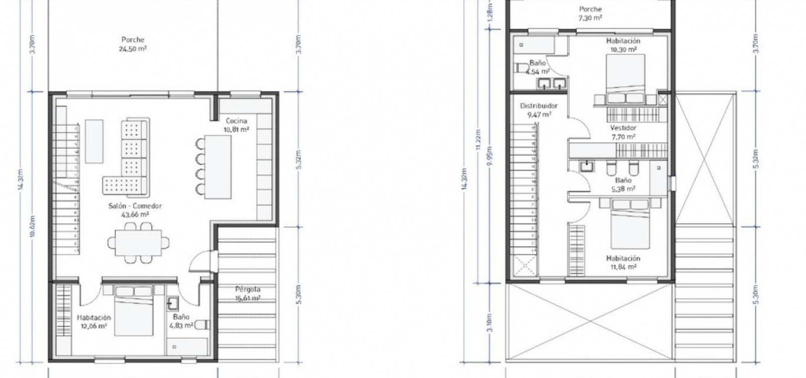 Grote terrassen en een dubbel balkonsysteem breiden de leefruimtes uit naar buiten, waardoor de verbinding tussen de binnenruimtes en de mediterrane omgeving wordt versterkt.