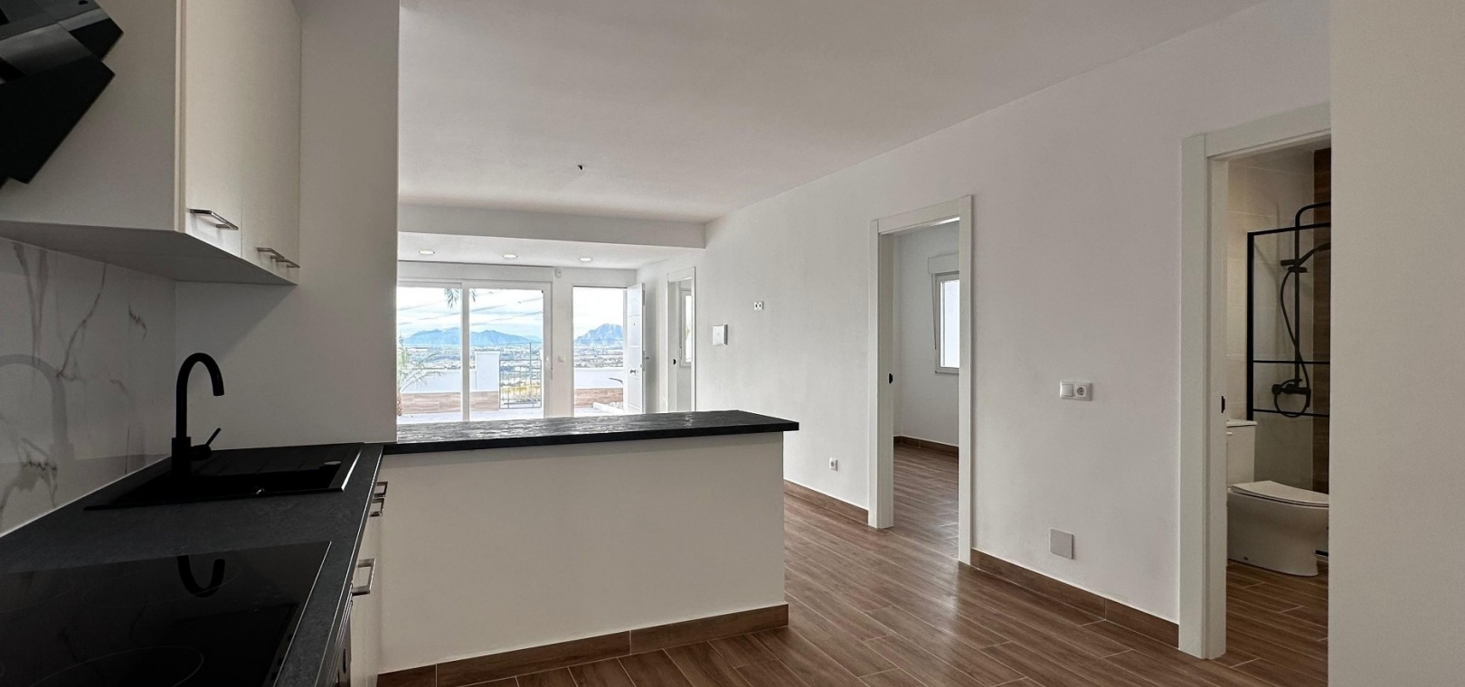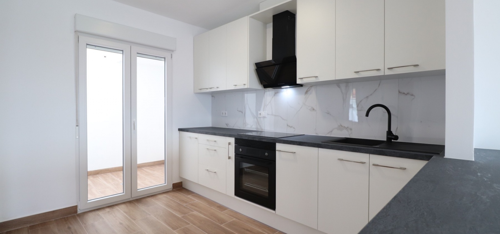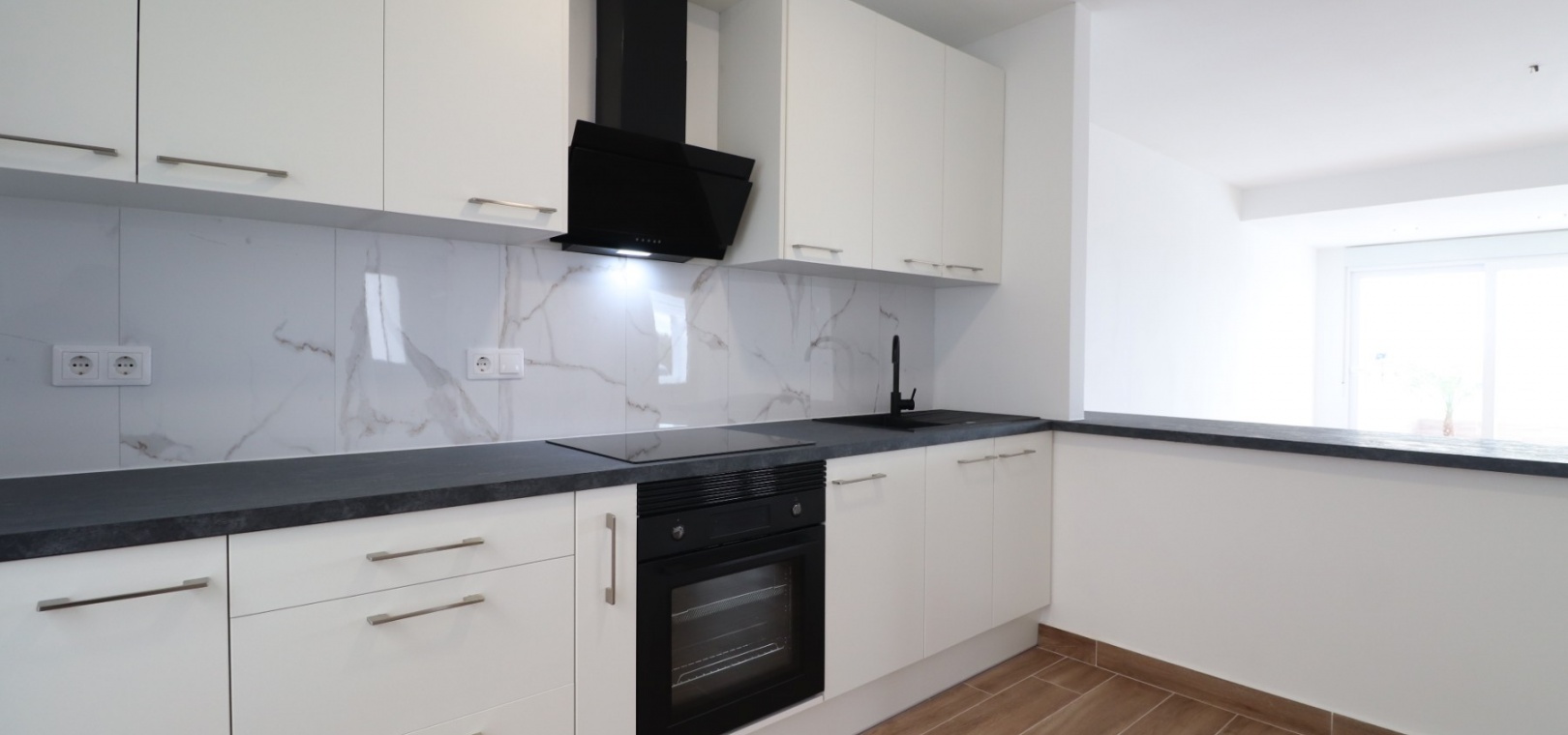 De open keuken is voorzien van een ontbijtbar en biedt directe toegang tot een terras met een praktische bijkeuken.