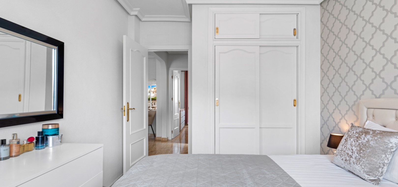 De woning heeft een lichte, open indeling met een volledig uitgeruste keuken en een comfortabele woonkamer. Vanuit de woonkamer geven openslaande deuren toegang tot een ruim balkon van 12 m² – perfect om te ontspannen of buiten te dineren, compleet met zonneschermen voor schaduw en voldoende zitruimte.