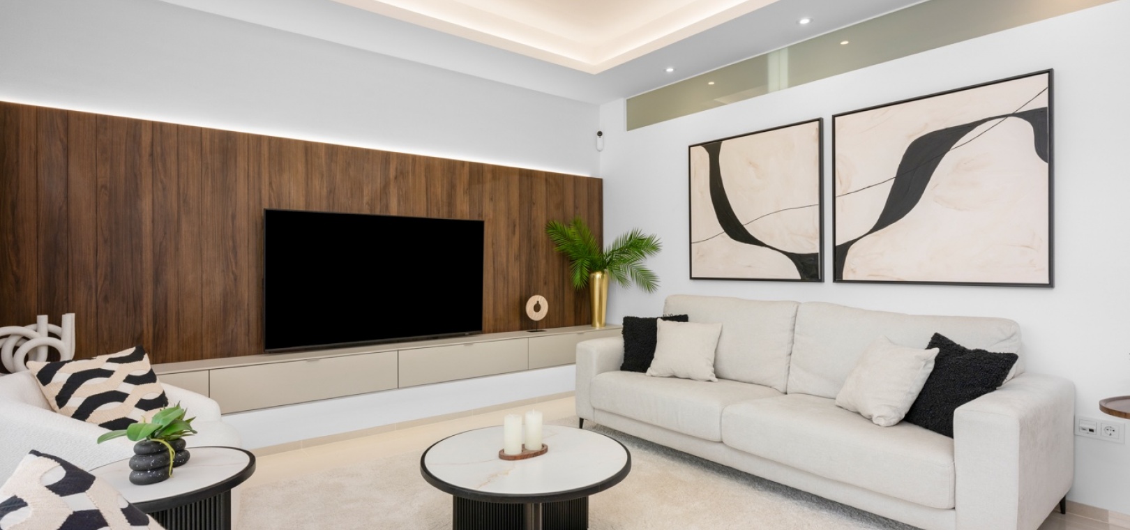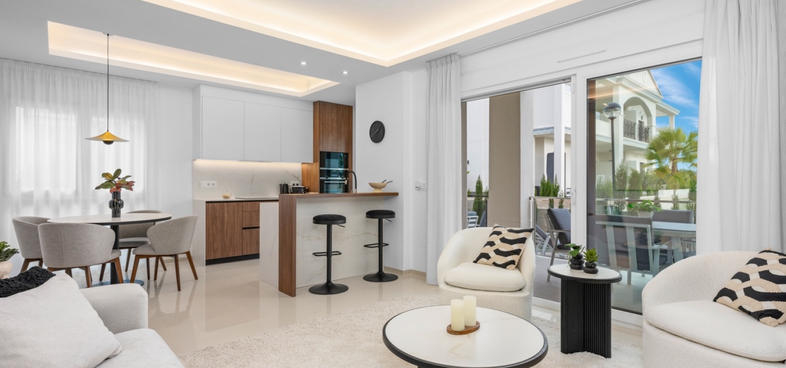 De uitnodigende woonkamer is ontworpen als een lichte, open ruimte die naadloos overgaat in de volledig uitgeruste, moderne keuken met hoogwaardige apparatuur. Grote deuren verbinden de woonkamer direct met het hoofdterras, waardoor het interieur baadt in natuurlijk licht en een perfecte overgang tussen binnen en buiten ontstaat.