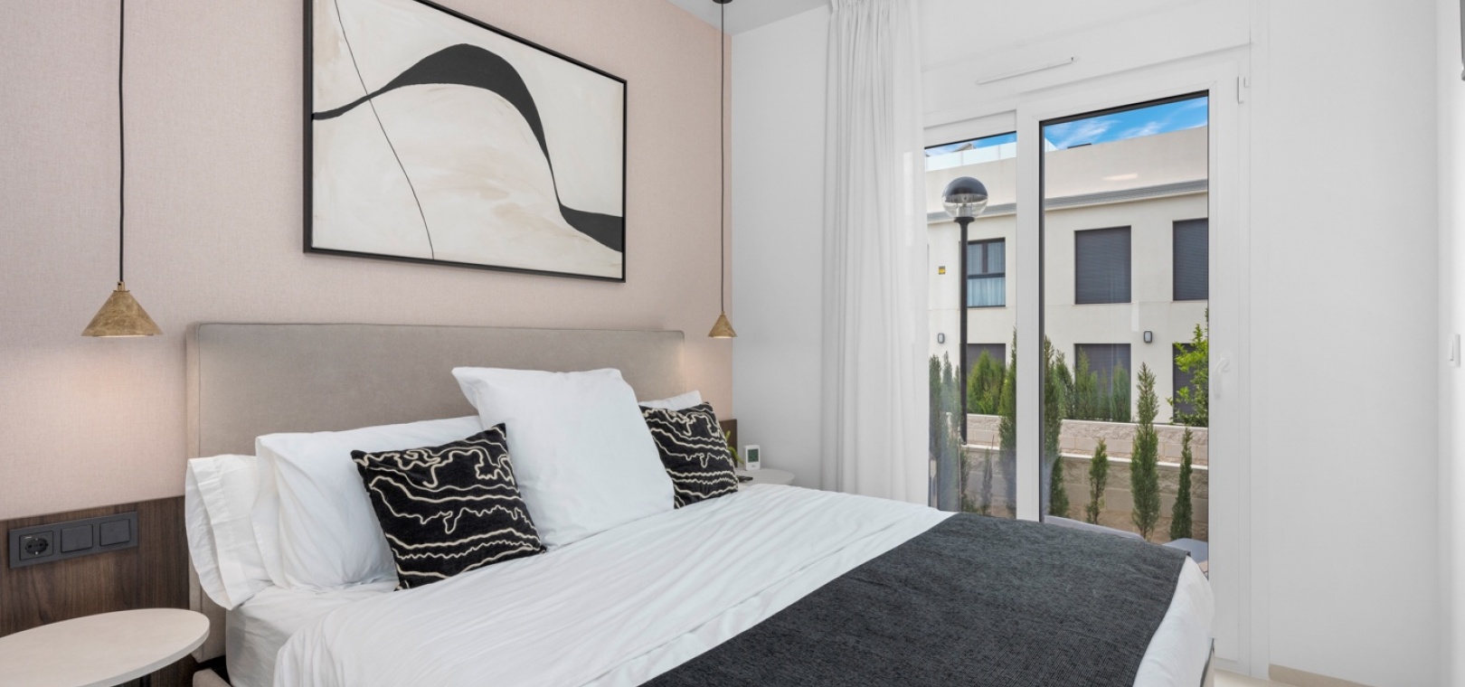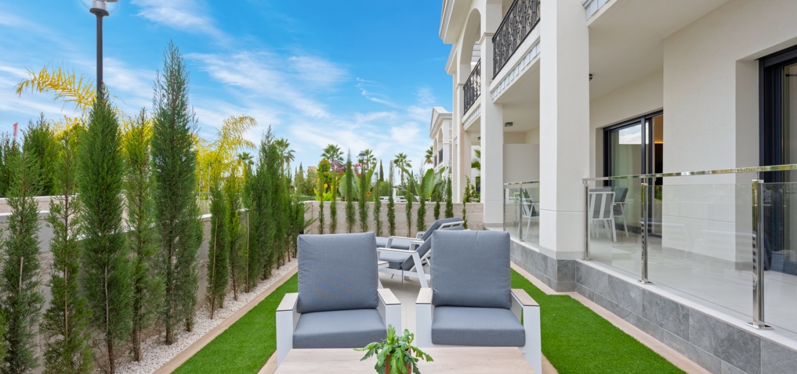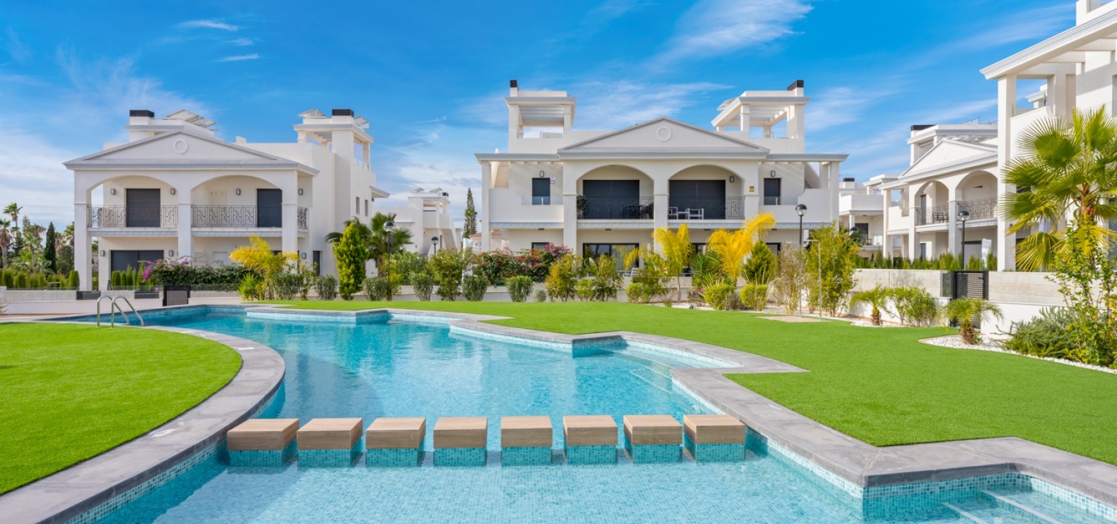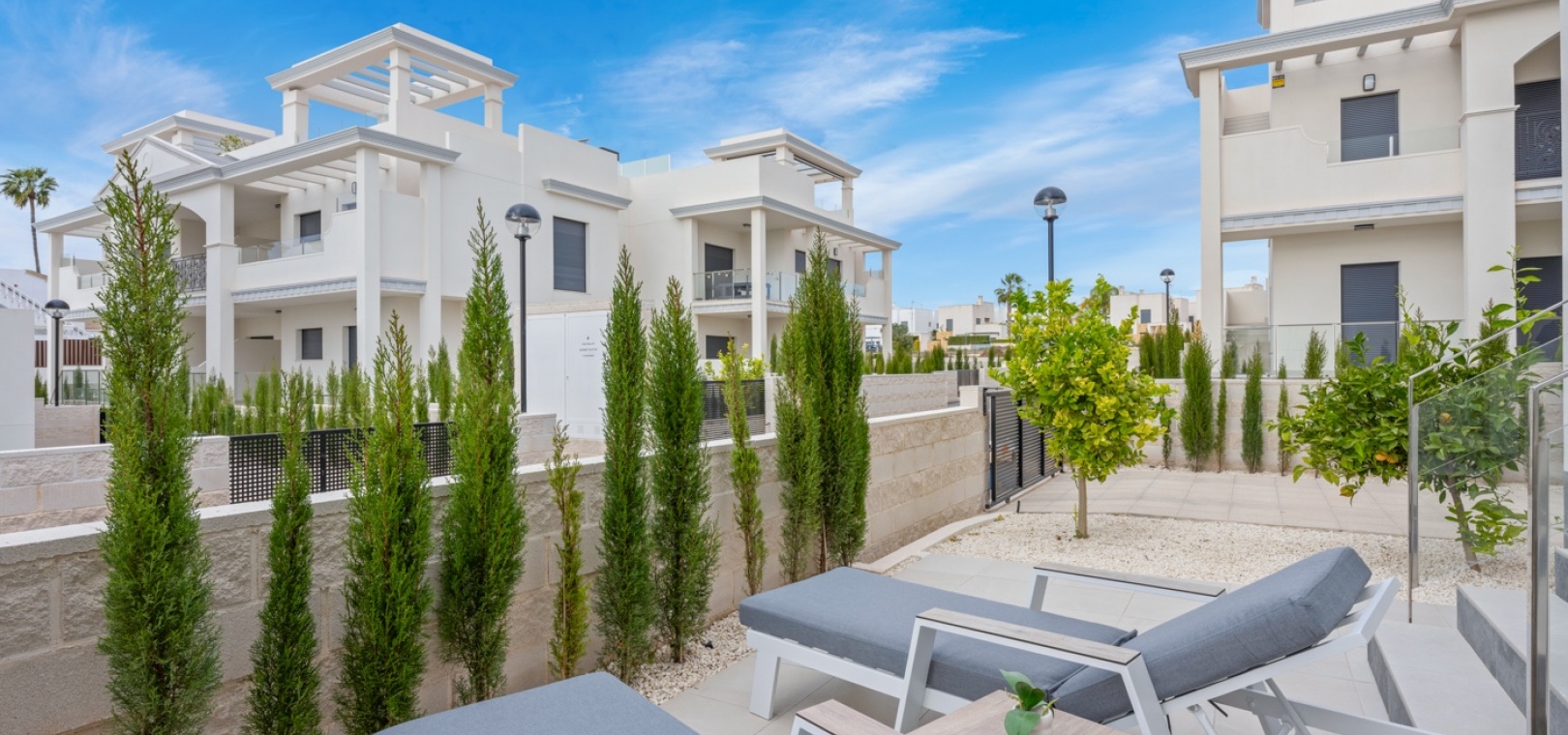 Bewoners genieten van prachtig onderhouden terreinen en toegang tot twee gemeenschappelijke zwembaden – een aan de voorzijde van het complex en een aan de achterzijde – beide omgeven door ruime zonneterrassen en ontspanningsruimtes.