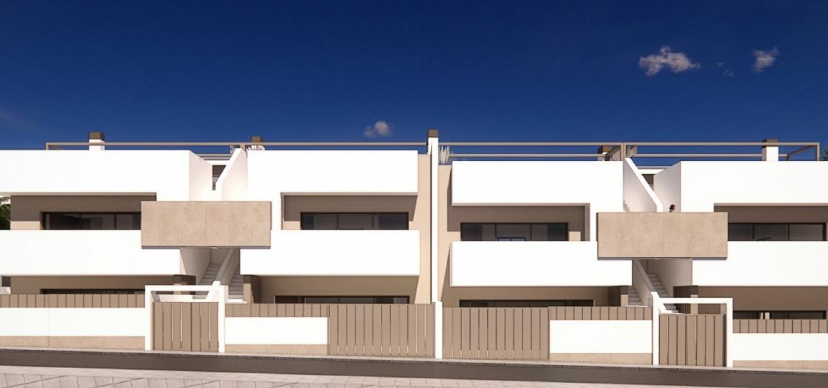 De bungalows op de bovenste verdieping hebben een ruim terras en een privé-solarium op het dak. Het solarium is voorzien van een zomerkeuken en biedt de mogelijkheid om tegen meerprijs een privézwembad of jacuzzi toe te voegen, waardoor het een ideale ruimte is om te ontspannen terwijl u geniet van het warme mediterrane klimaat en het weidse uitzicht.