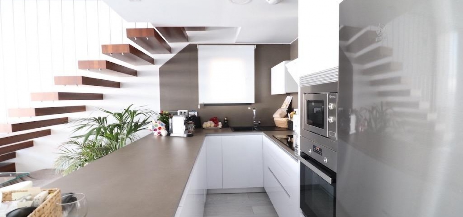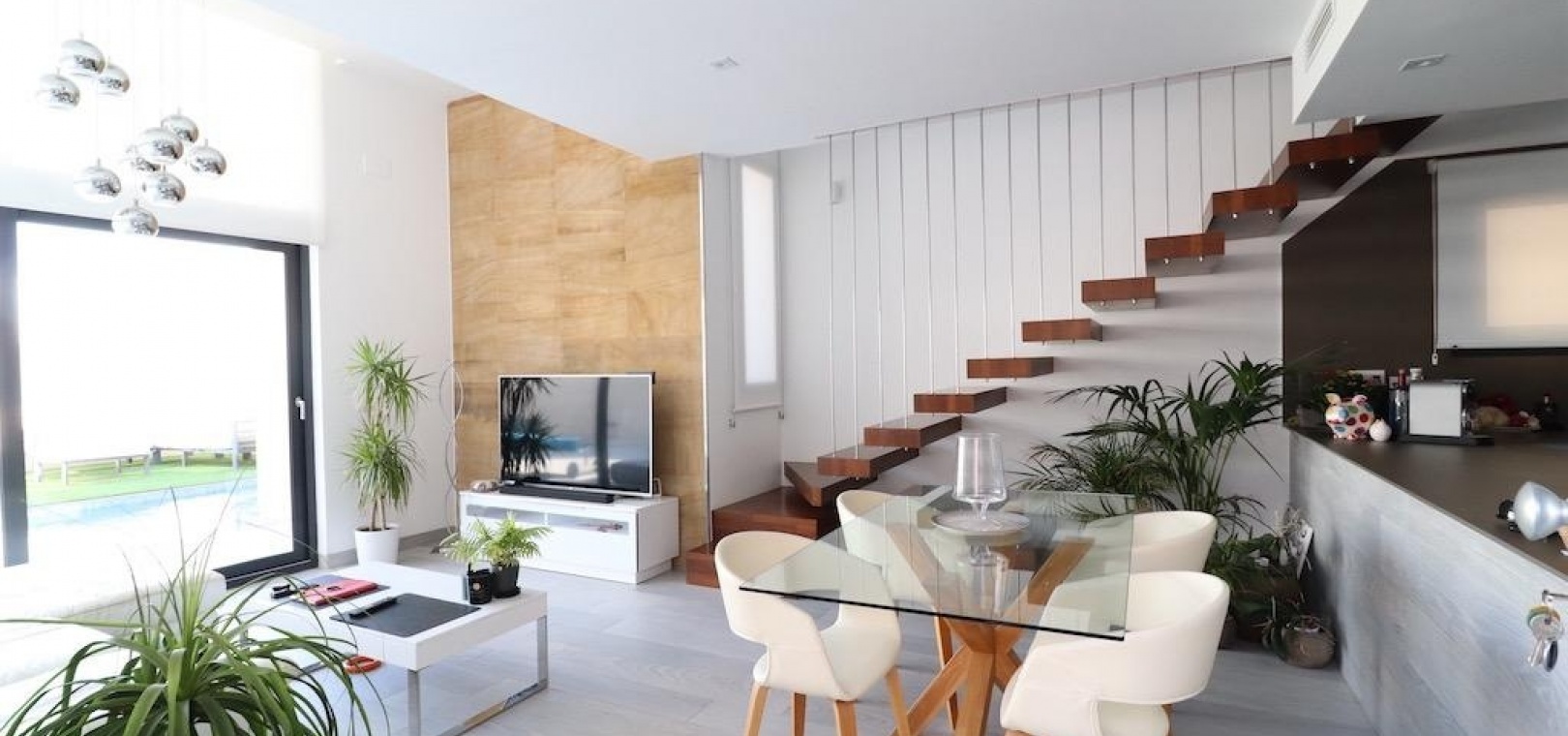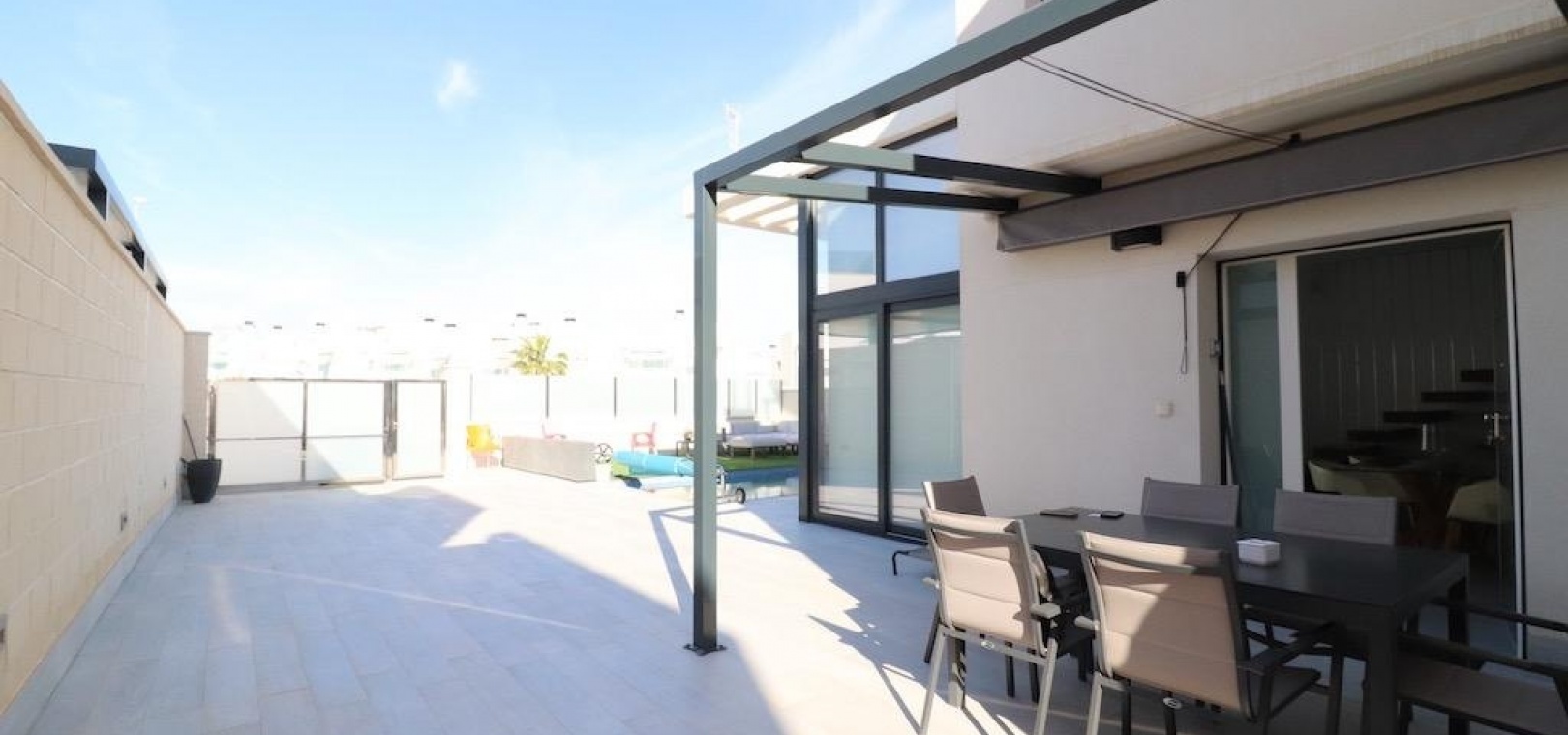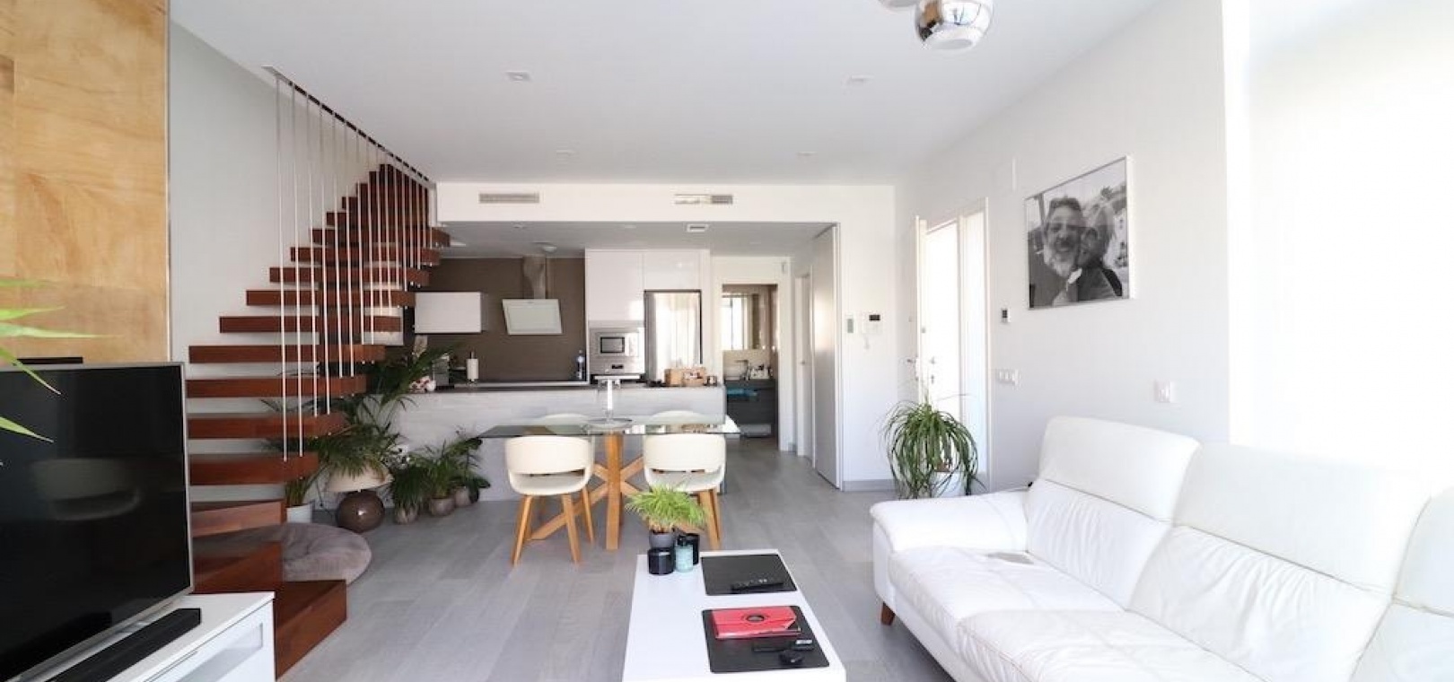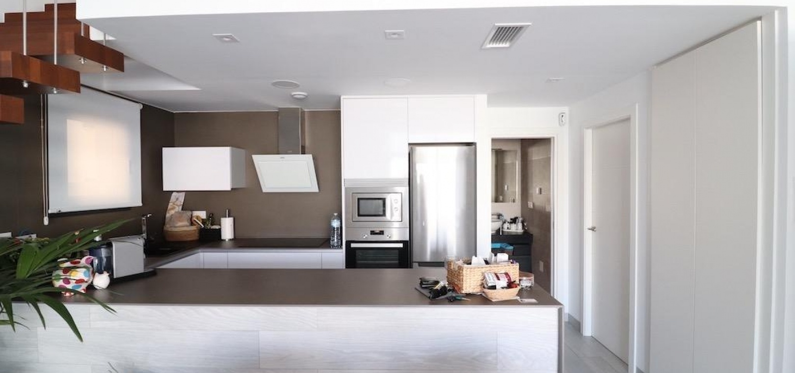 De ruime open woonruimte integreert naadloos de woonkamer en keuken, waardoor een lichte en uitnodigende ruimte ontstaat voor gezinsleven en het ontvangen van gasten. Stap naar buiten en geniet van een privé verwarmd zwembad, een zonovergoten terras en een groot solarium met een prachtig uitzicht op zee, perfect om te ontspannen of buiten te dineren.