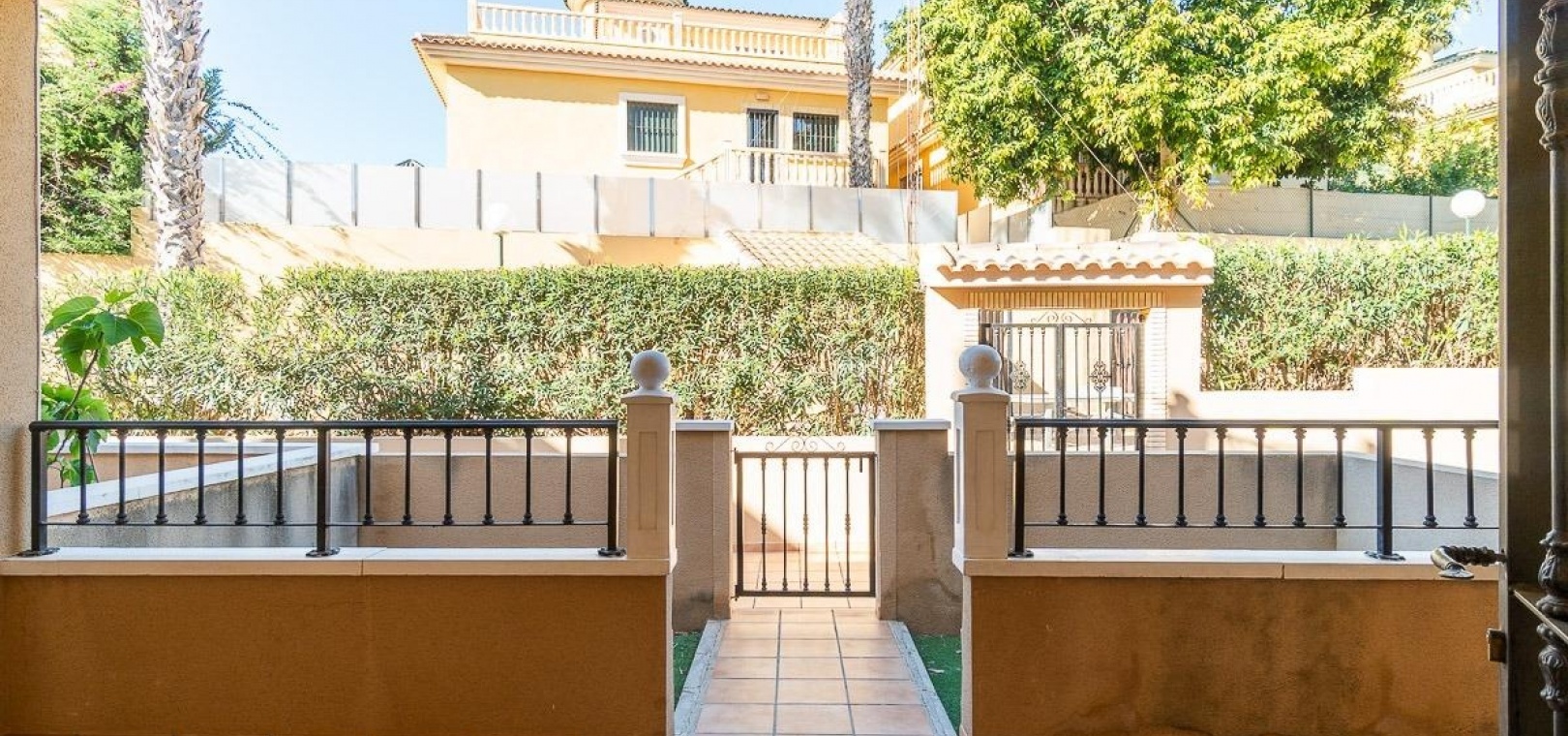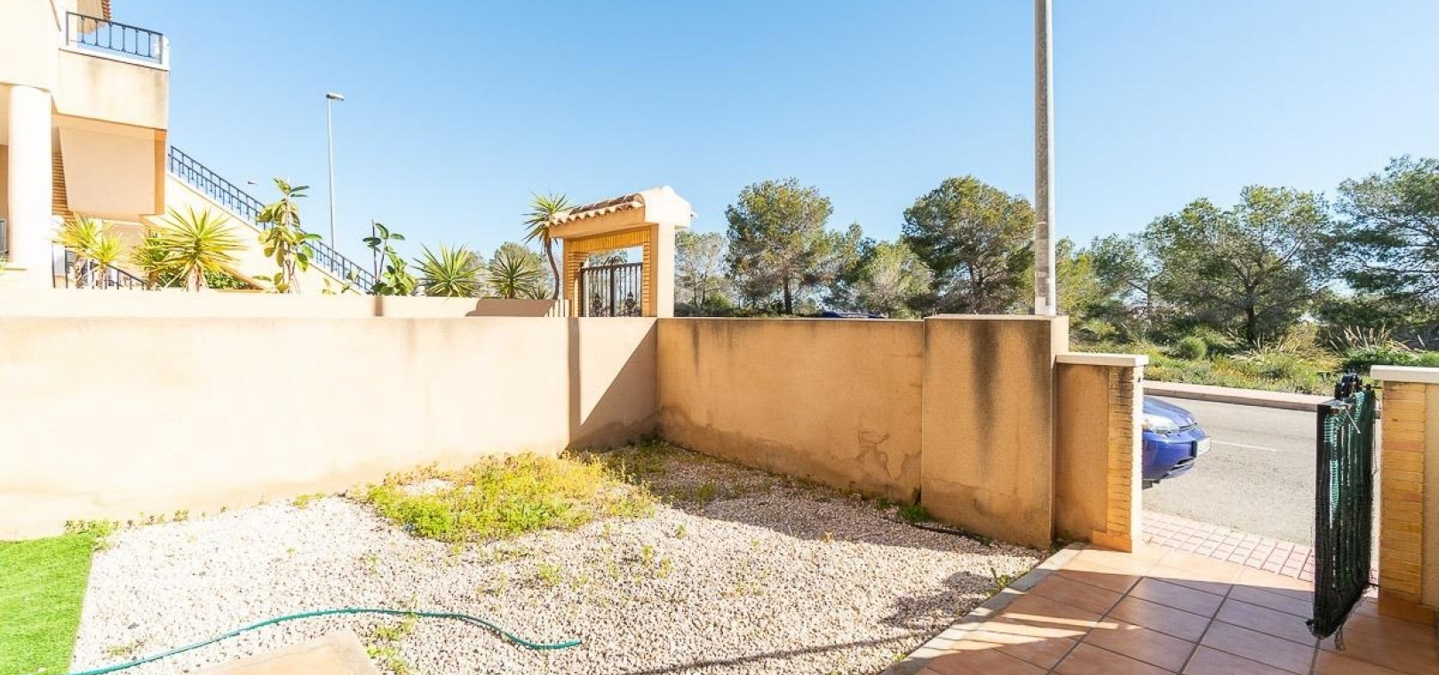 Aan de voorzijde bevindt zich een privétuin met directe toegang tot de woning, ideaal voor buitengebruik. Aan de achterzijde biedt een groot terras op het zuiden extra buitenruimte met directe toegang tot het gemeenschappelijke zwembad in een fraai aangelegd wooncomplex.