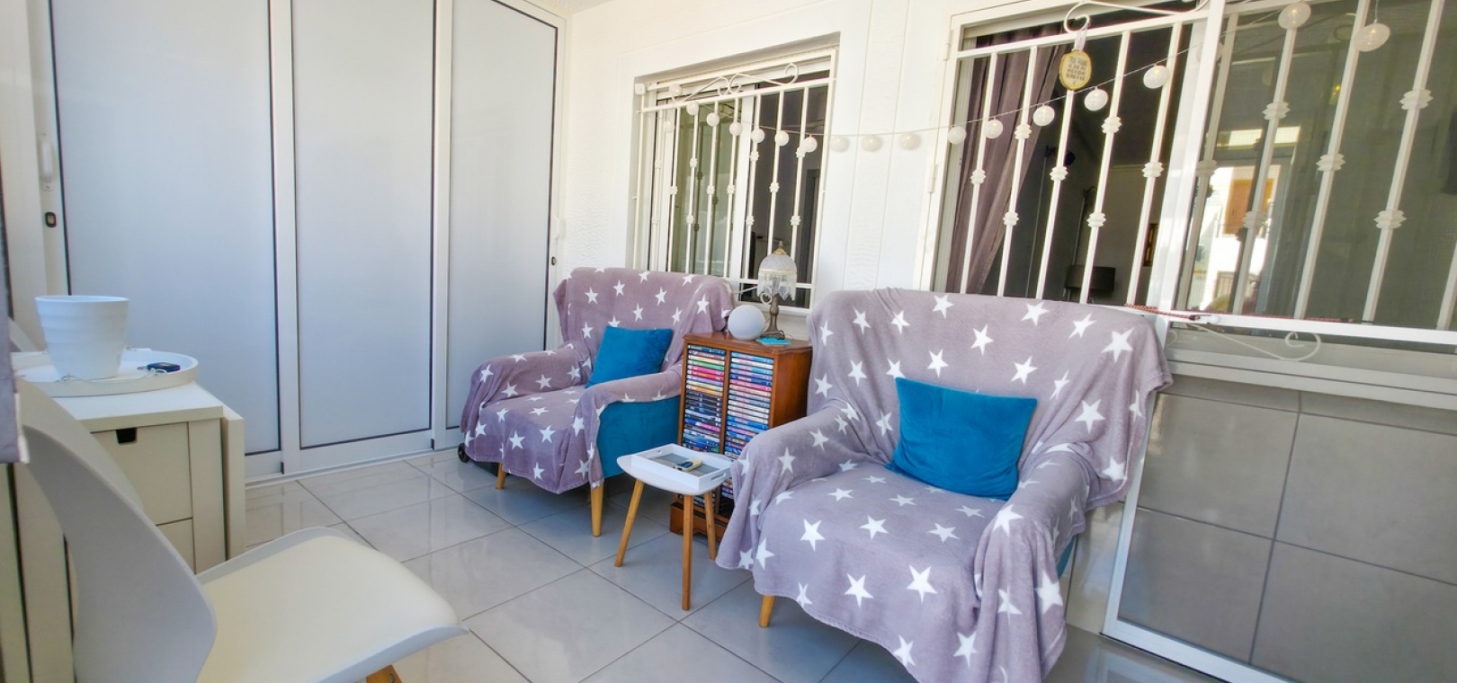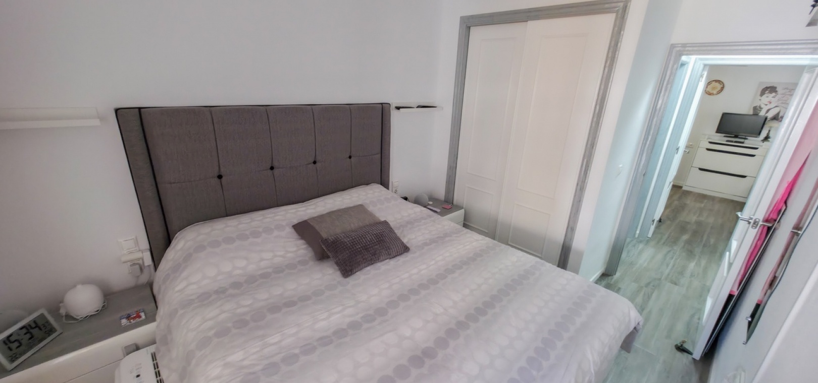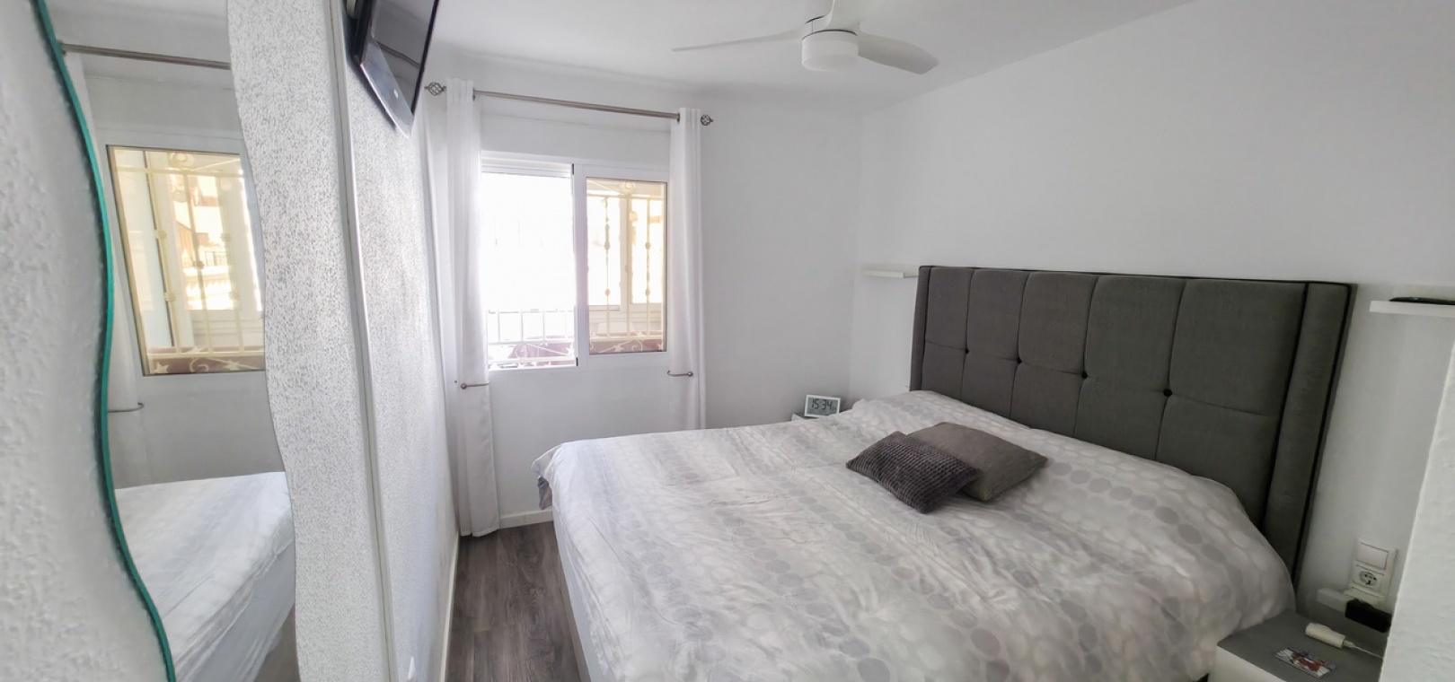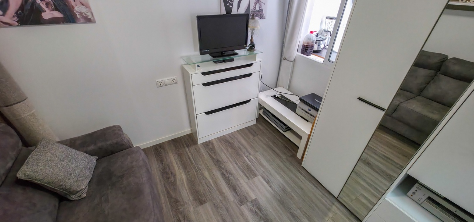 Het appartement beschikt over twee ruime tweepersoonsslaapkamers en een stijlvolle, moderne badkamer met inloopdouche. Extra voorzieningen zijn onder andere airconditioning in de woonkamer, verbeterde isolatie voor comfort het hele jaar door, een beveiligingscamerasysteem en gedeeltelijke meubilering voor direct gebruik.