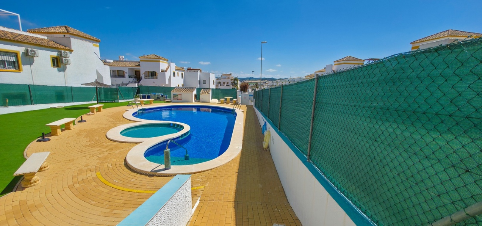 Bewoners hebben toegang tot een rustig gemeenschappelijk zwembad en aangelegde tuinen op korte loopafstand, wat een vredige omgeving biedt om te ontspannen.