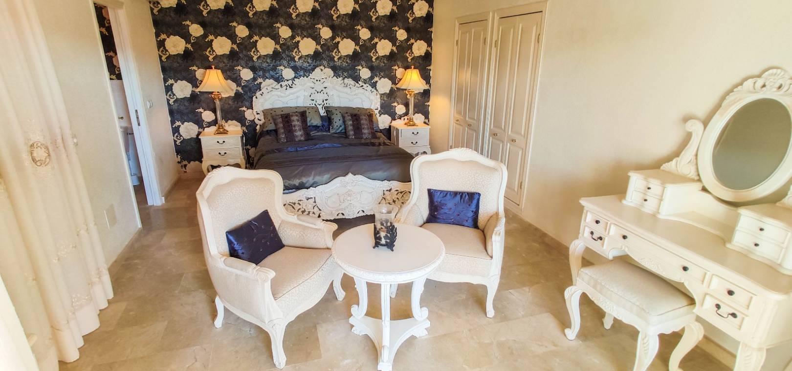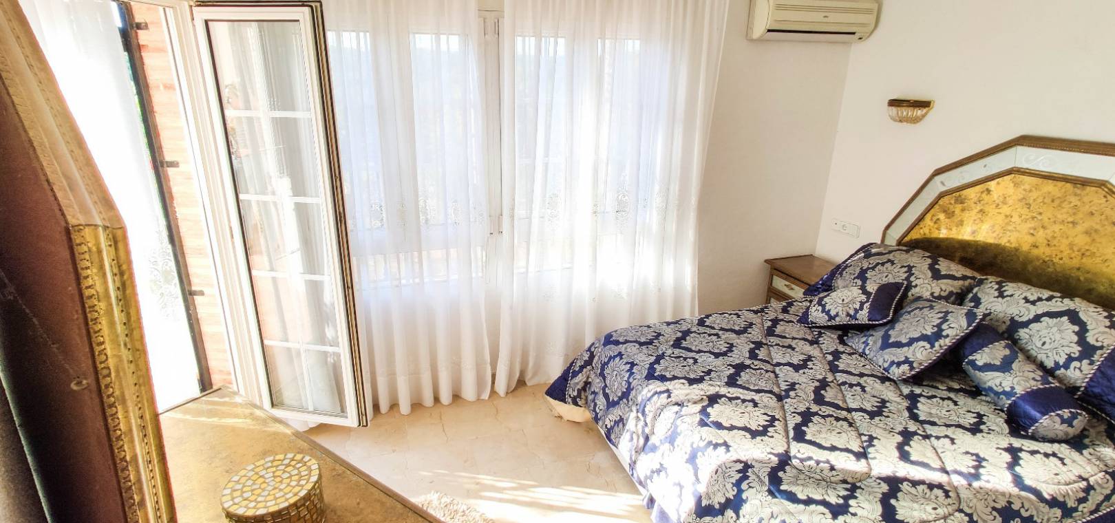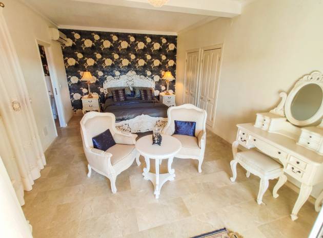 Grote woonkamer met open haard, aparte eetkamer met deuren naar een klein balkon dit is de 4e slaapkamer, open keuken, 3 x tweepersoons slaapkamers allemaal met inbouwkast en warme en koude airconditioning en twee van de slaapkamers hebben deuren op 2 x terrassen en twee van de slaapkamers hebben een eigen badkamer en er is ook een gastenbadkamer.
