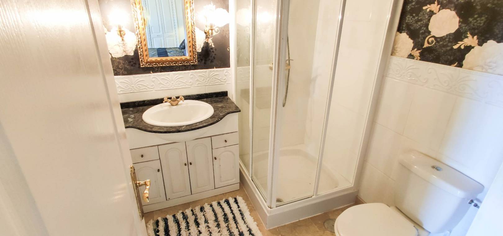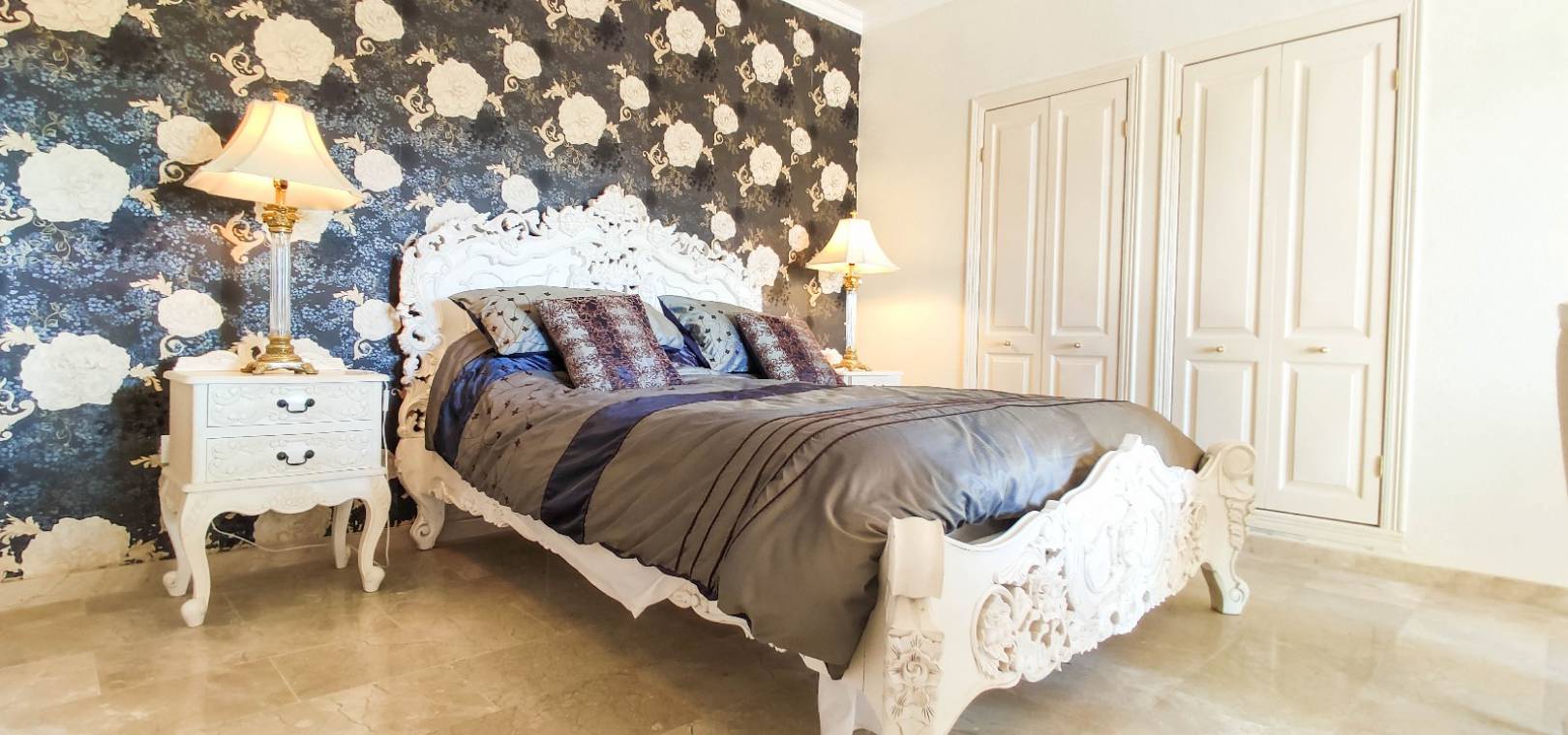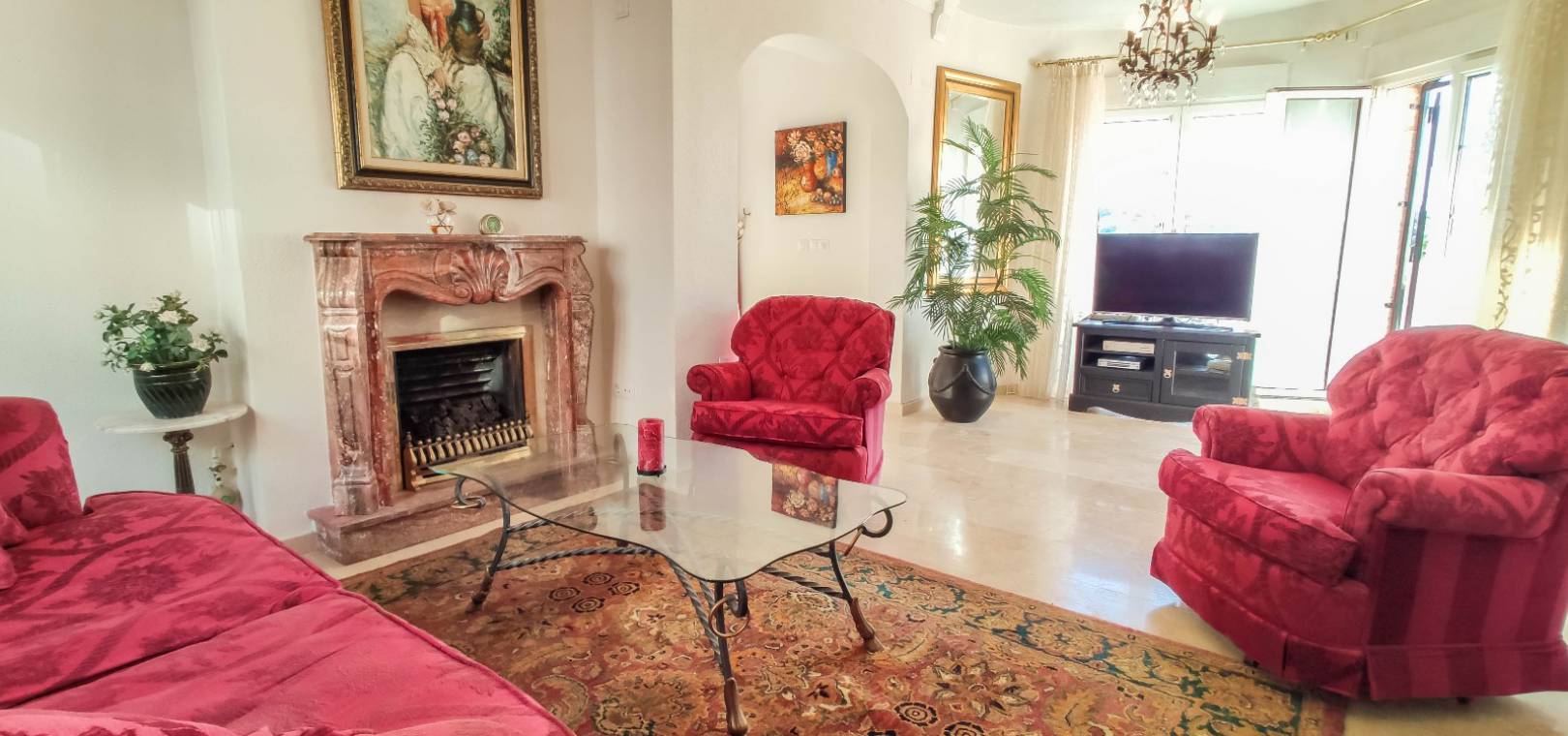 Grote woonkamer met open haard, aparte eetkamer met deuren naar een klein balkon dit is de 4e slaapkamer, open keuken, 3 x tweepersoons slaapkamers allemaal met inbouwkast en warme en koude airconditioning en twee van de slaapkamers hebben deuren op 2 x terrassen en twee van de slaapkamers hebben een eigen badkamer en er is ook een gastenbadkamer.