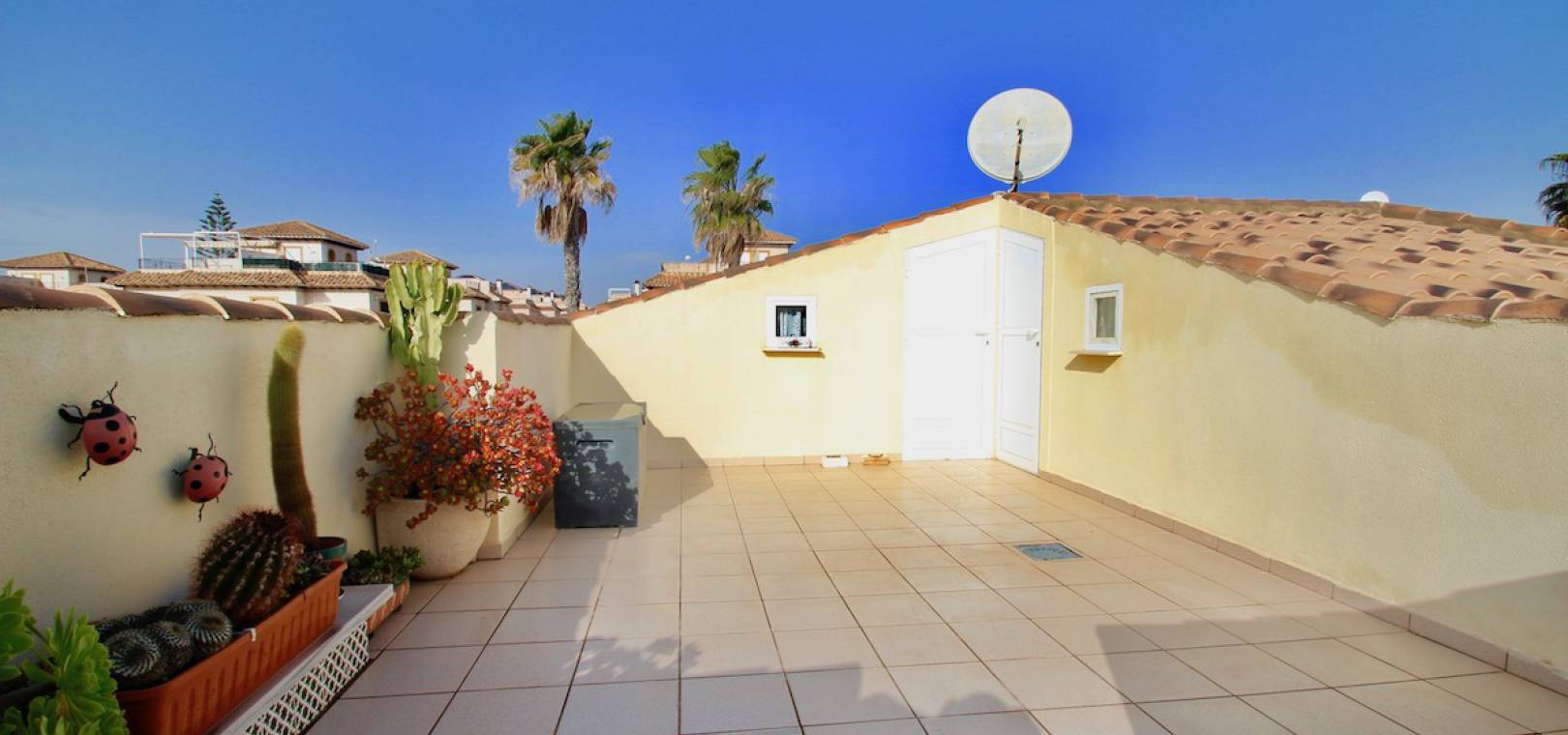 Woon / eetkamer met warme en koude A / C, een open volledig ingerichte keuken met een aparte overdekte bijkeuken / opslagruimte, 2 x slaapkamers beide met inbouwkasten, 1 x doucheruimte, geglazuurd voor terras met trap naar de dak solarium met 2 x opbergkasten waarvan er momenteel een wordt gebruikt als een kleine tv-kamer en berging, voor-en zijtuin met een oprit voor off rod parkeren, mooi gemeenschappelijk zwembad en nog veel meer.