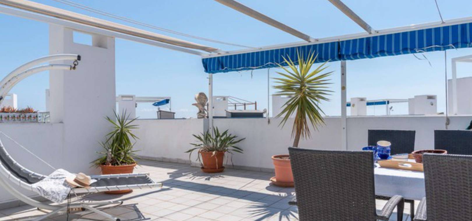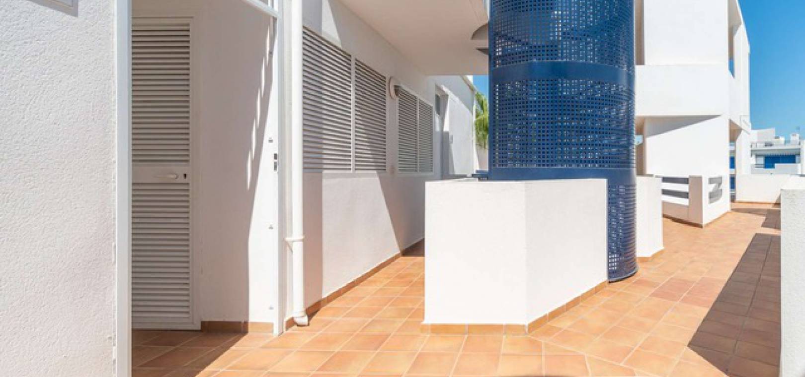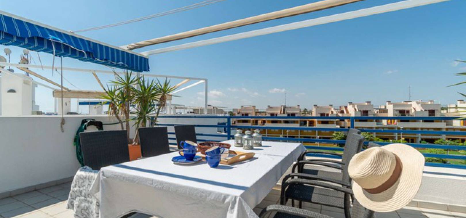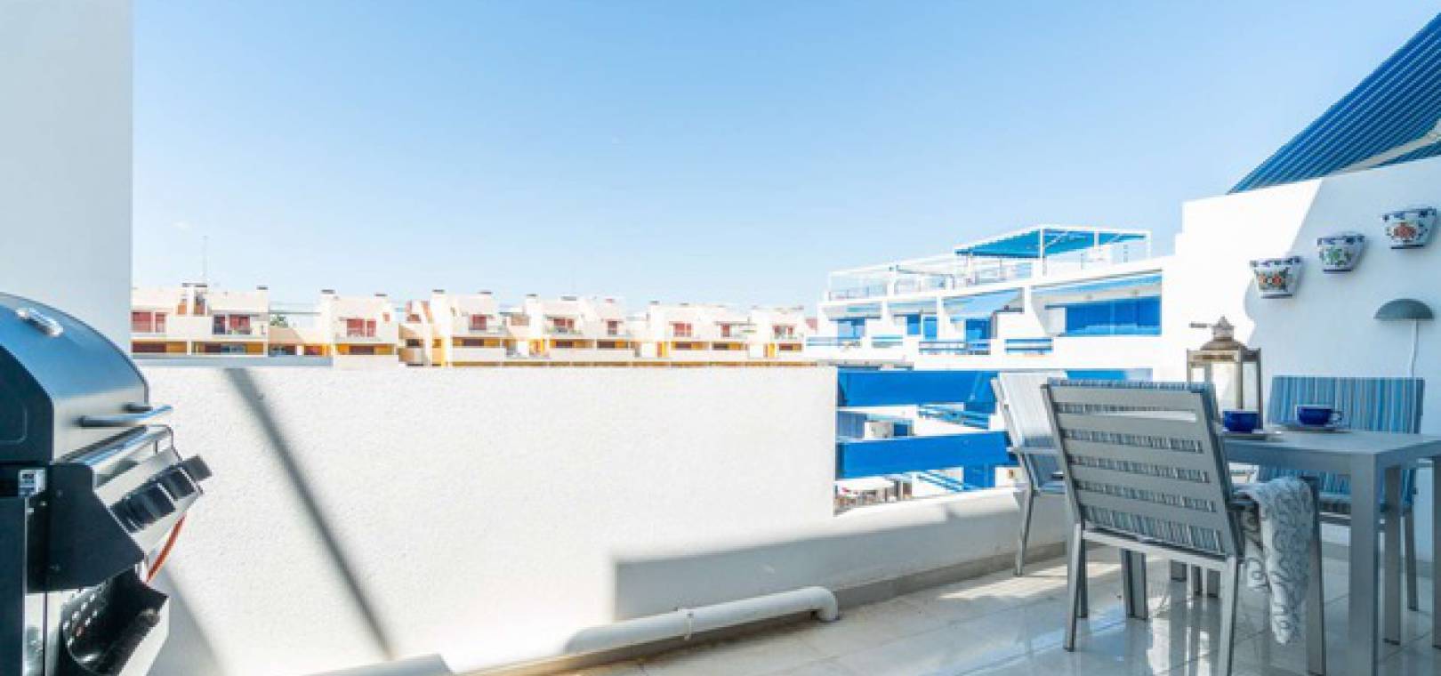 A South West facing 2 bed 2 bath top floor apartment with a private rooftop solarium just 500m from the sea located in the modern secure gated complex of Las Terrazas, Playa Flamenca, Costa Blanca.