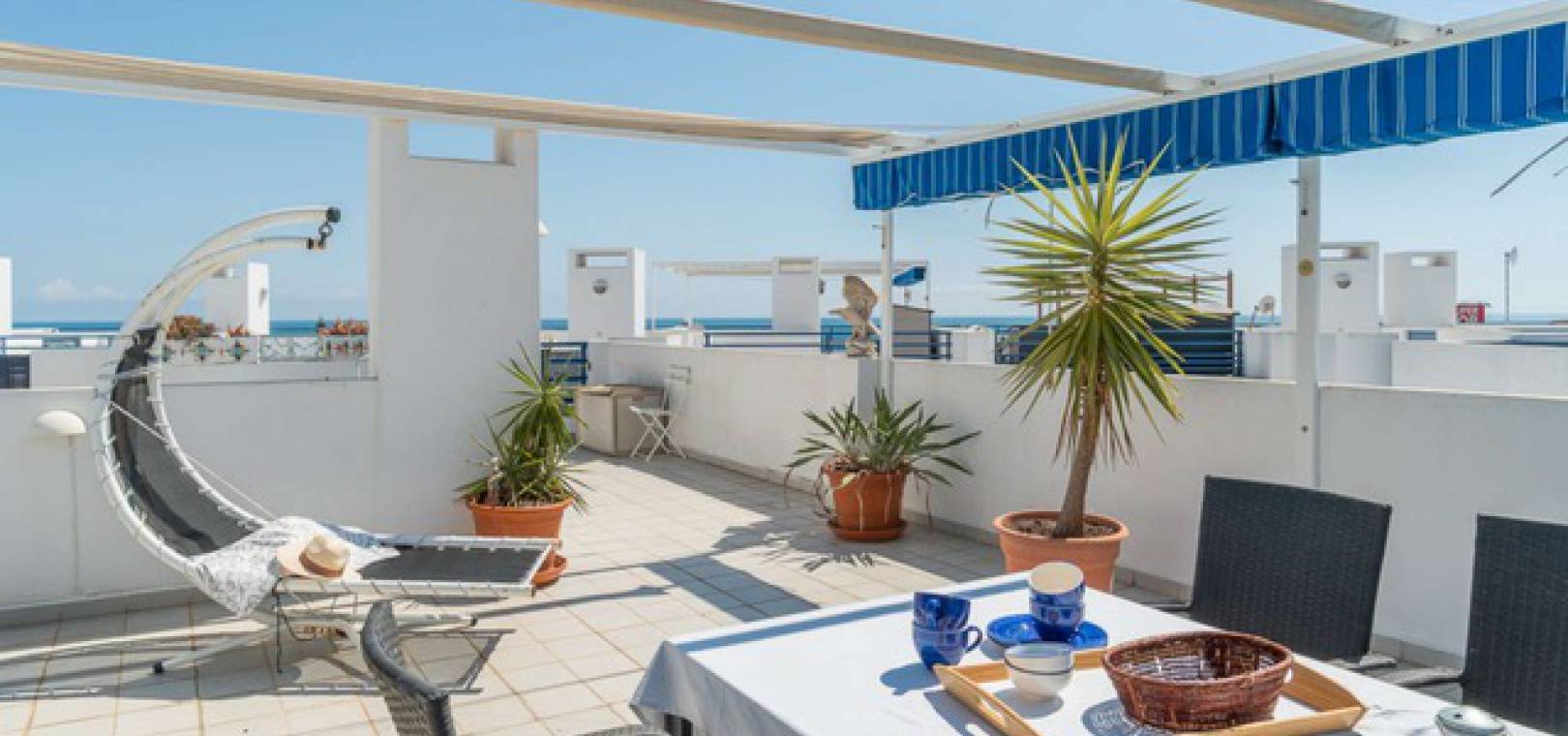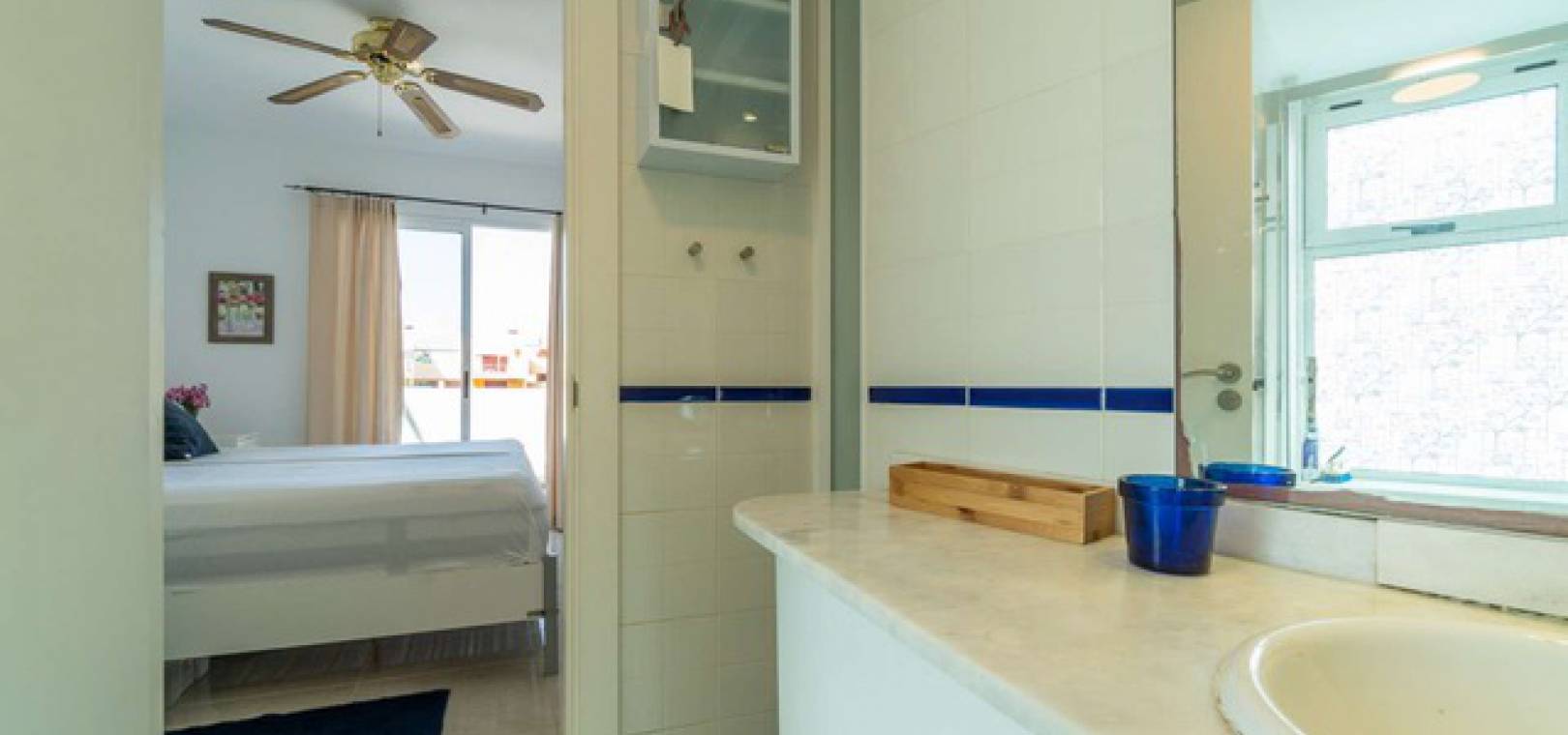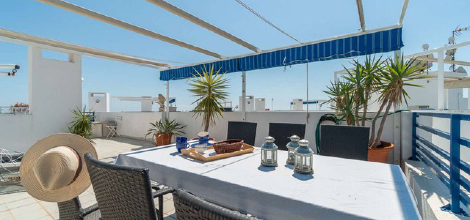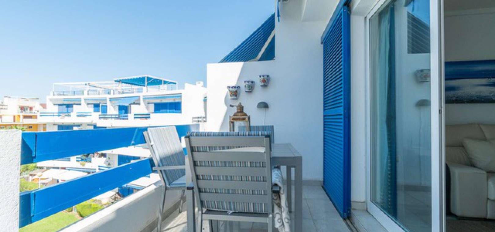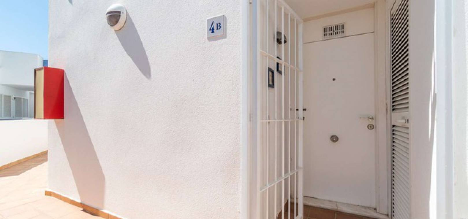 A South West facing 2 bed 2 bath top floor apartment with a private rooftop solarium just 500m from the sea located in the modern secure gated complex of Las Terrazas, Playa Flamenca, Costa Blanca.
