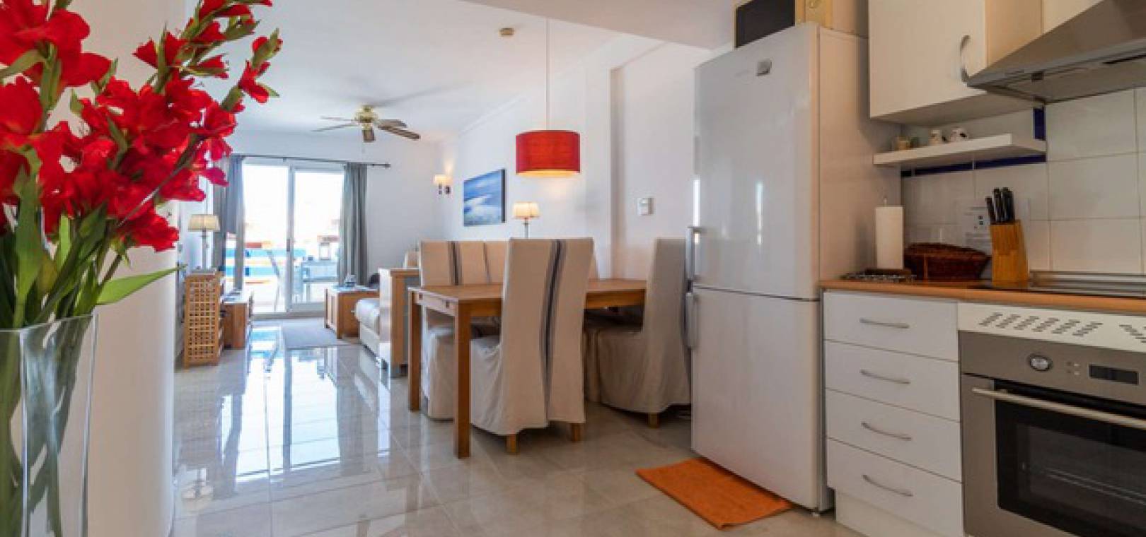 On entering the apartment there is an open plan kitchen leading to a lounge / dining room with patio doors out on to the large balcony over looking the communal swimming pool, 2 x double bedrooms both with fitted wardrobes and en-suite bathrooms with underfloor heating, a separate utility area & a private rooftop solarium.