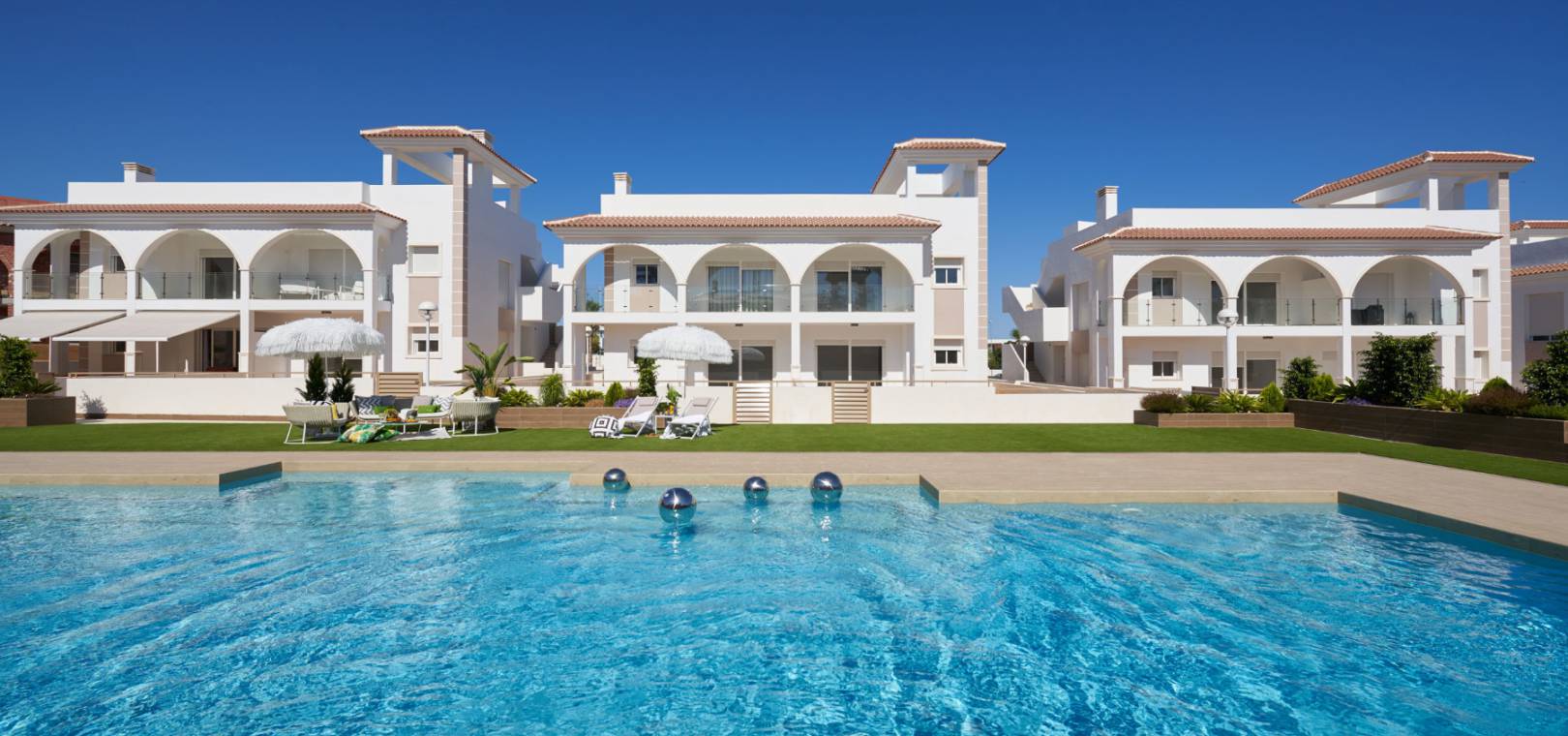 2 top floor apartments & 2 ground floor apartments. They all overlook the communal swimming pool.