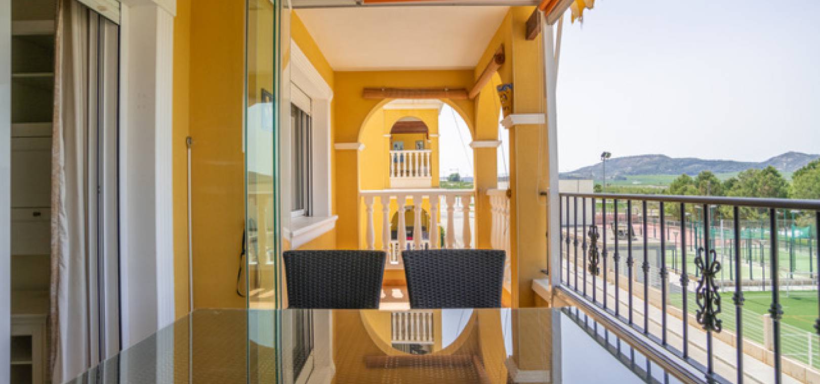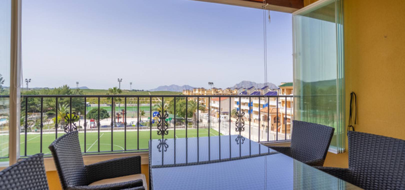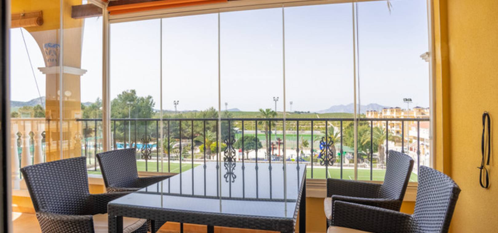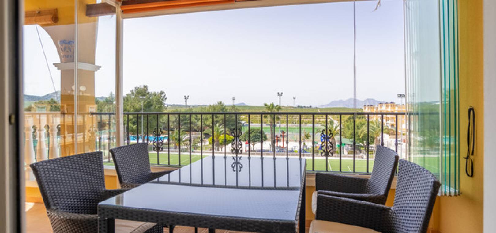 Lounge/diner with a ceiling fan & doors onto the glazed in balcony with open views, open plan kitchen, separate utility room, 2 x double bedroom both with fitted wardrobes & ceiling fans, 1 x family bathroom with a window as this is a end property, communal swimming pool, underground parking space with direct access by lift to the block, secure gated community & much much more.