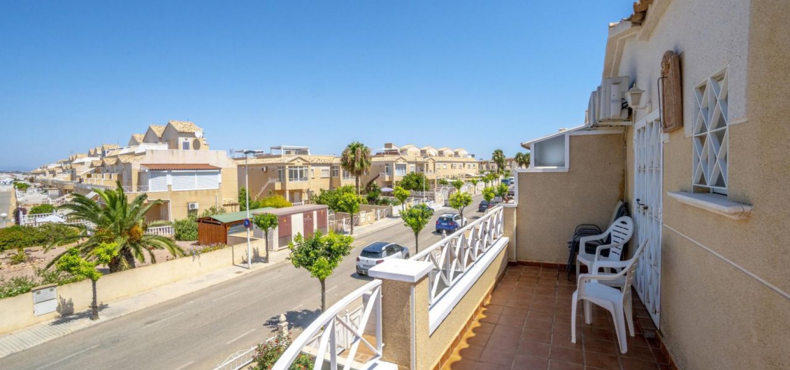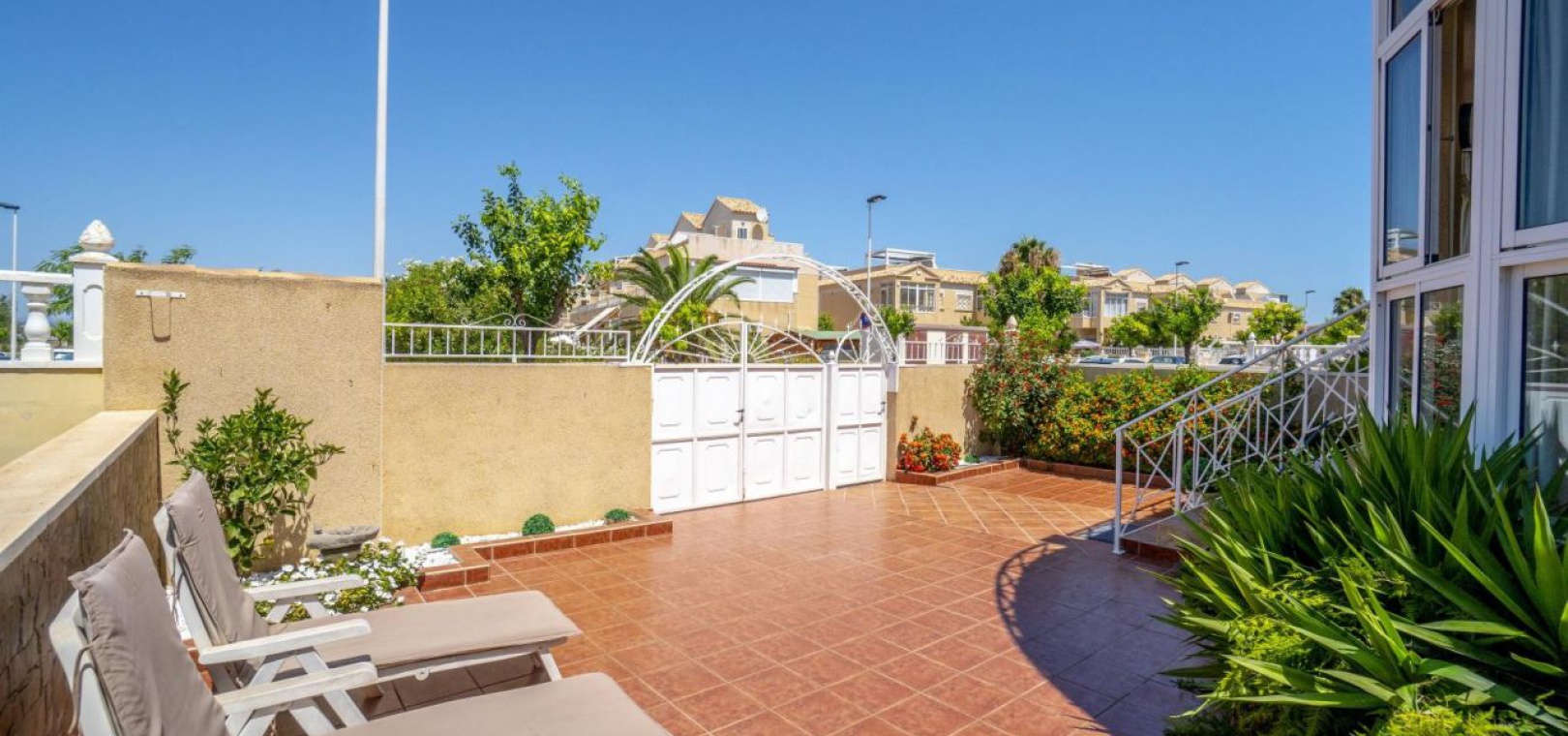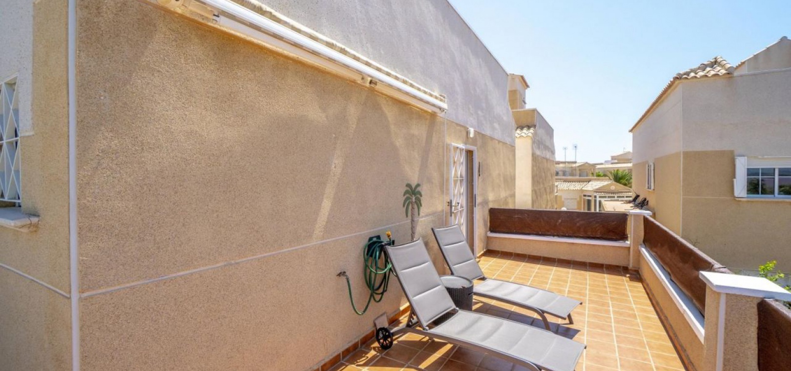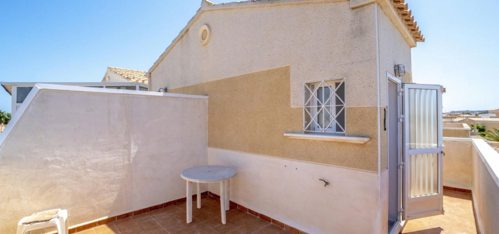 A West facing 3 bed 1.5 bath corner townhouse with a private rooftop solarium located in Baños de Europa, La Torreta, Torrevieja, Costa Blanca.
