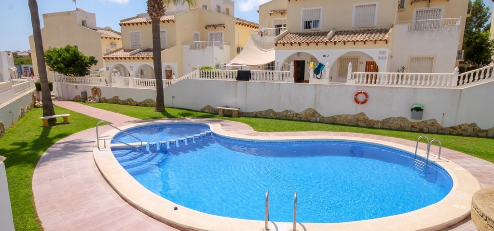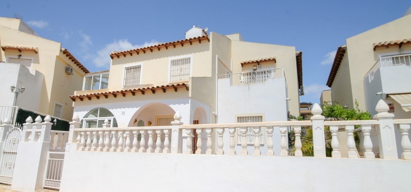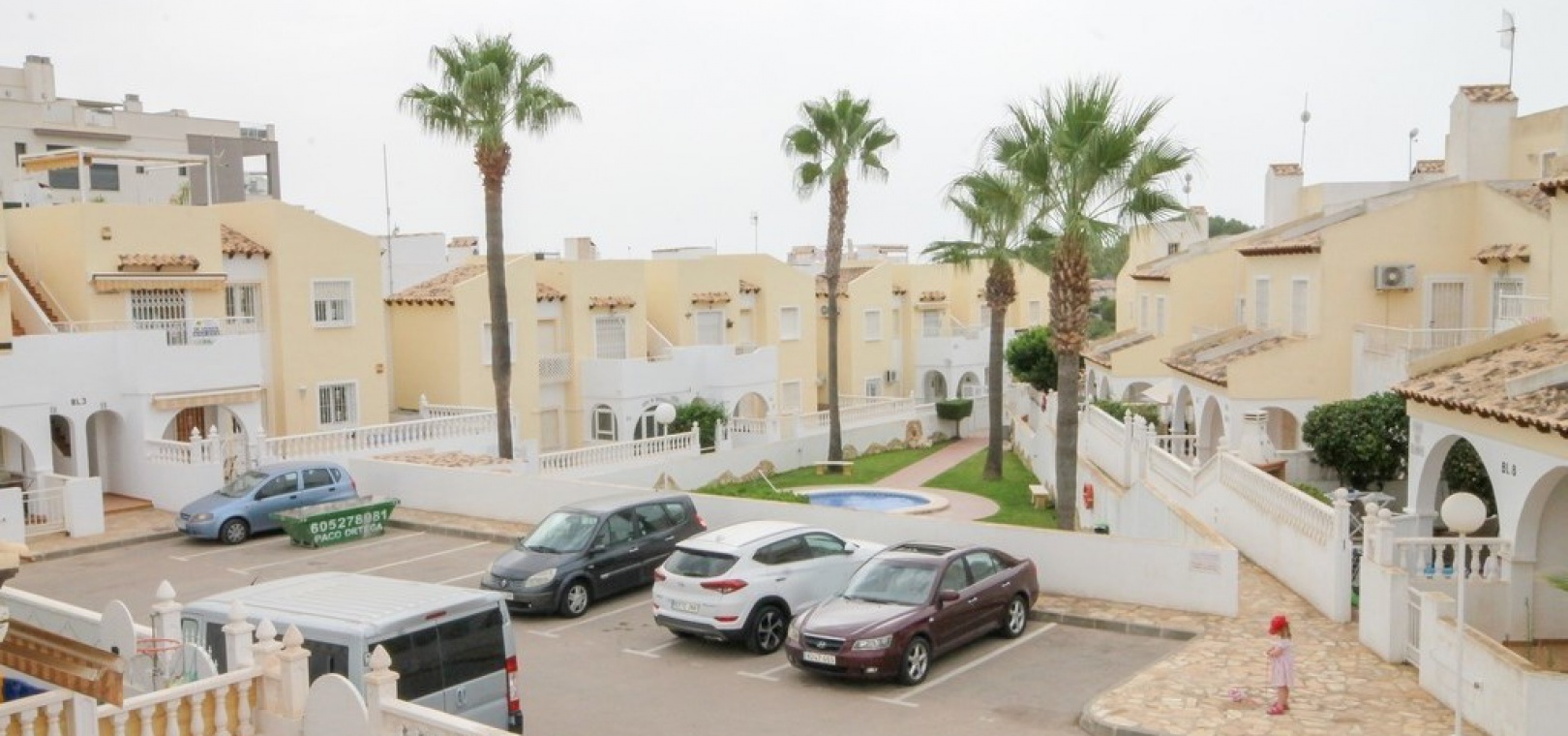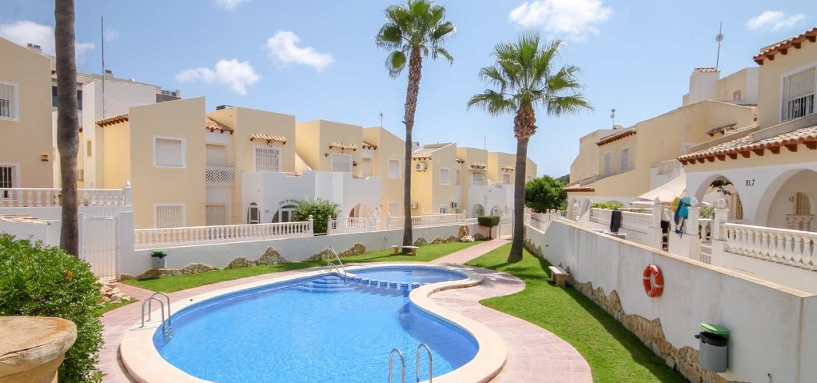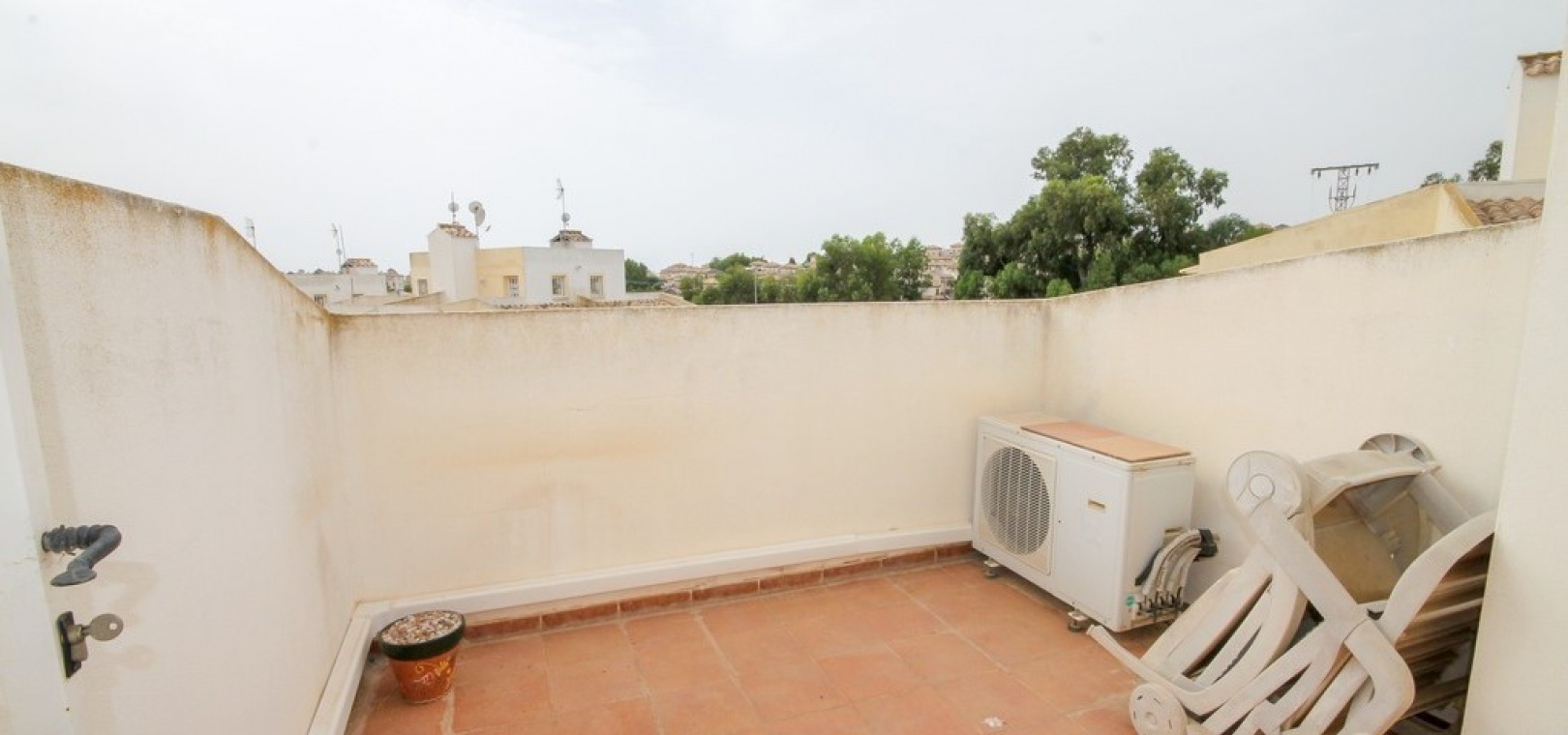 A South facing 3 bed 2 bath quad house with a private rooftop solarium with views to the communal swimming pool located in Panorama Golf, Villamartin, Costa Blanca.