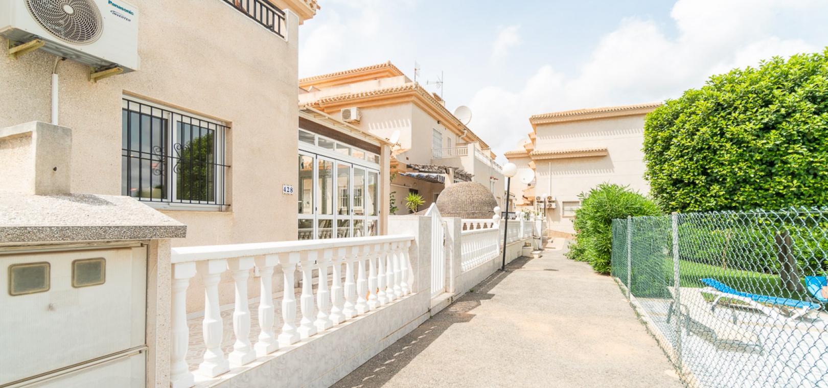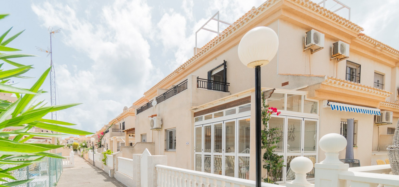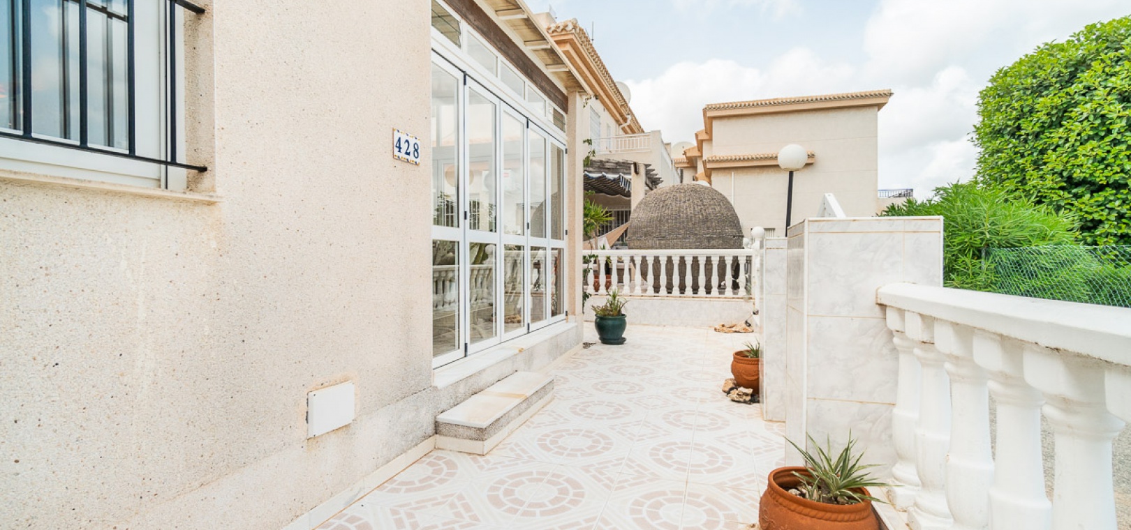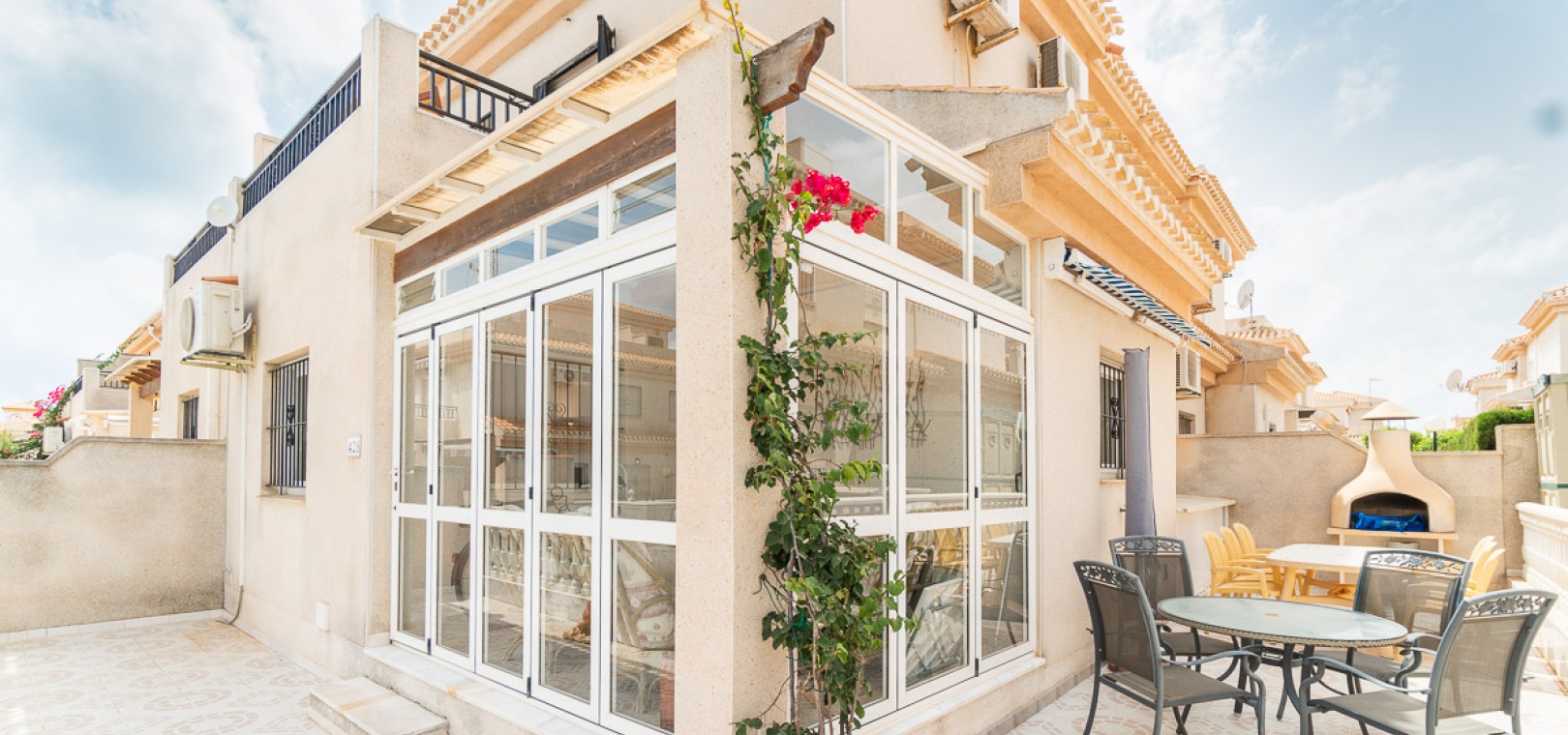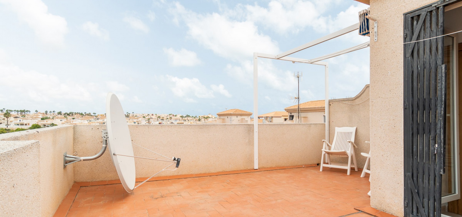 Internal stairs take up you to the private rooftop solarium with views over the communal swimming pool. There is a front and side garden with a BBQ area, a glazed in front terrace with a sun awning & a communal swimming pool just infront of the property.