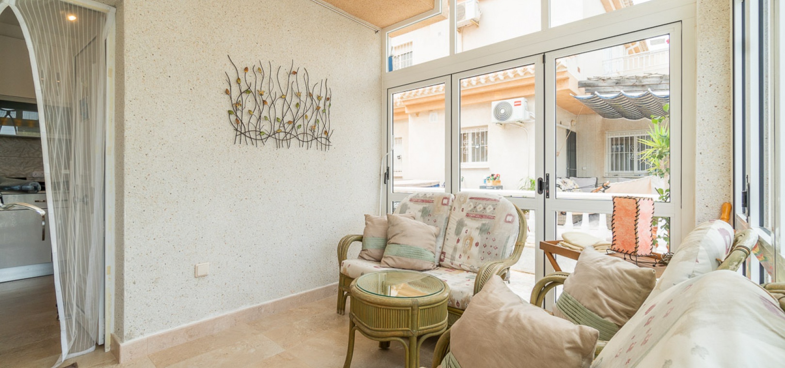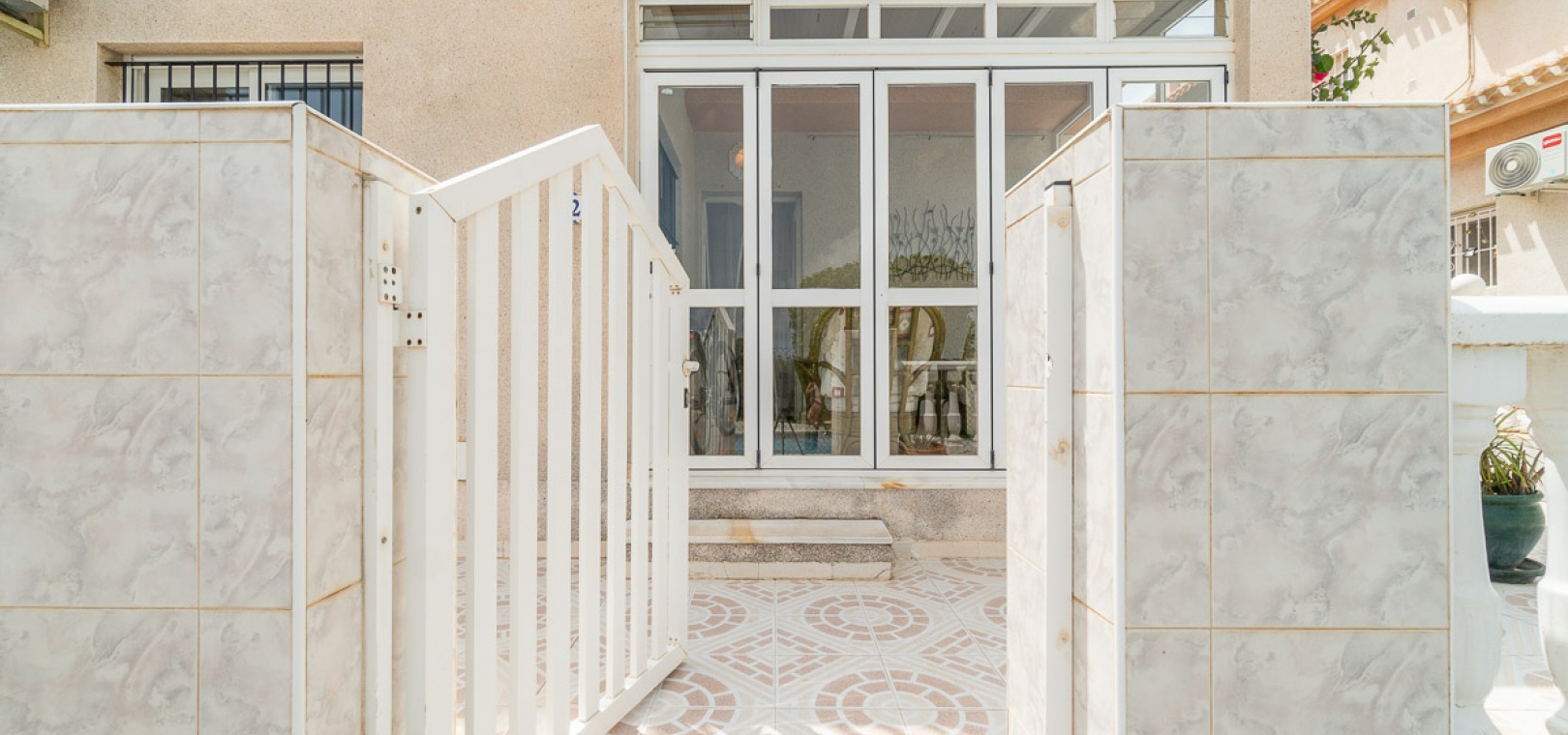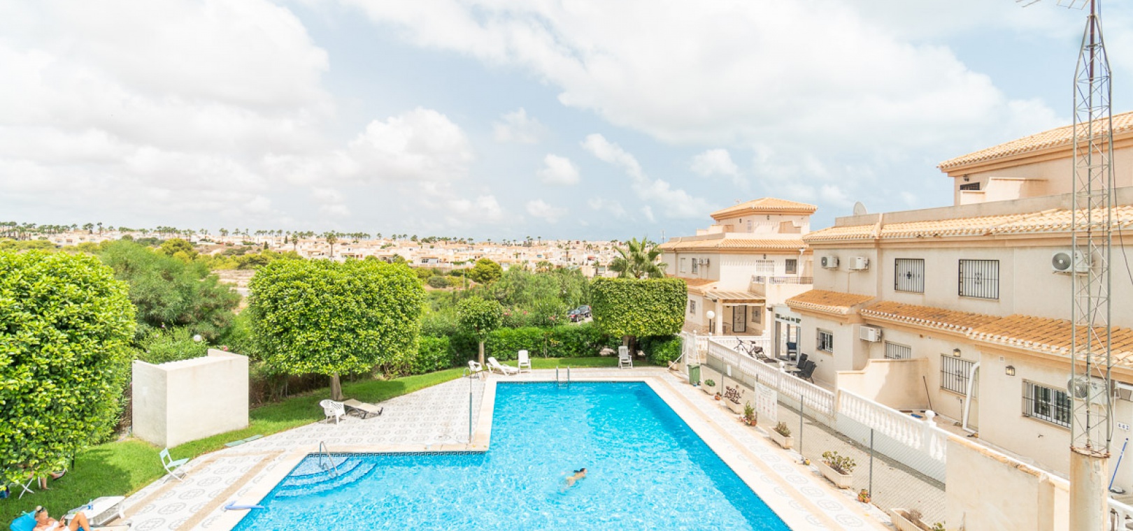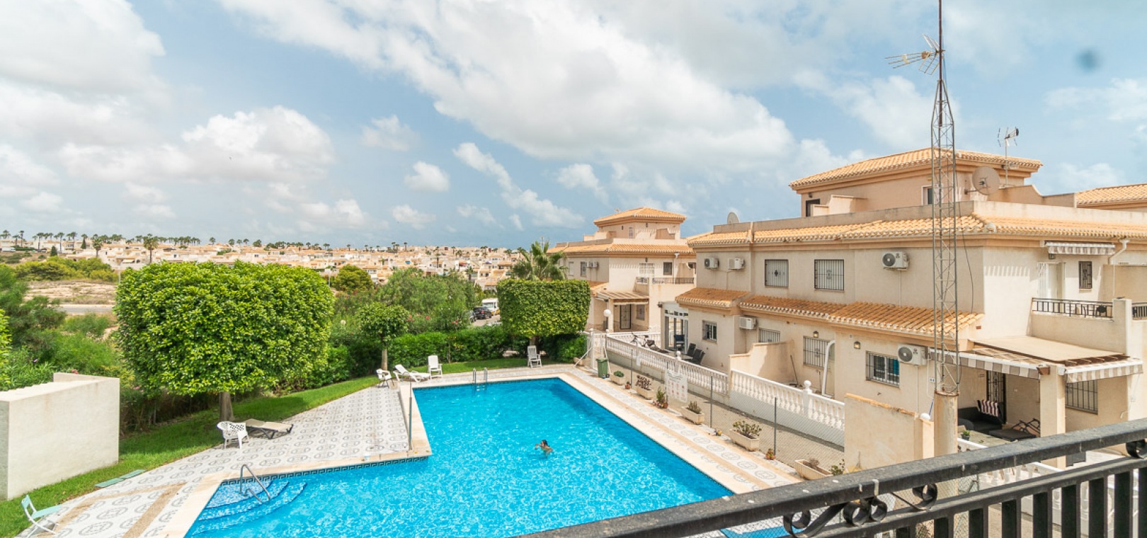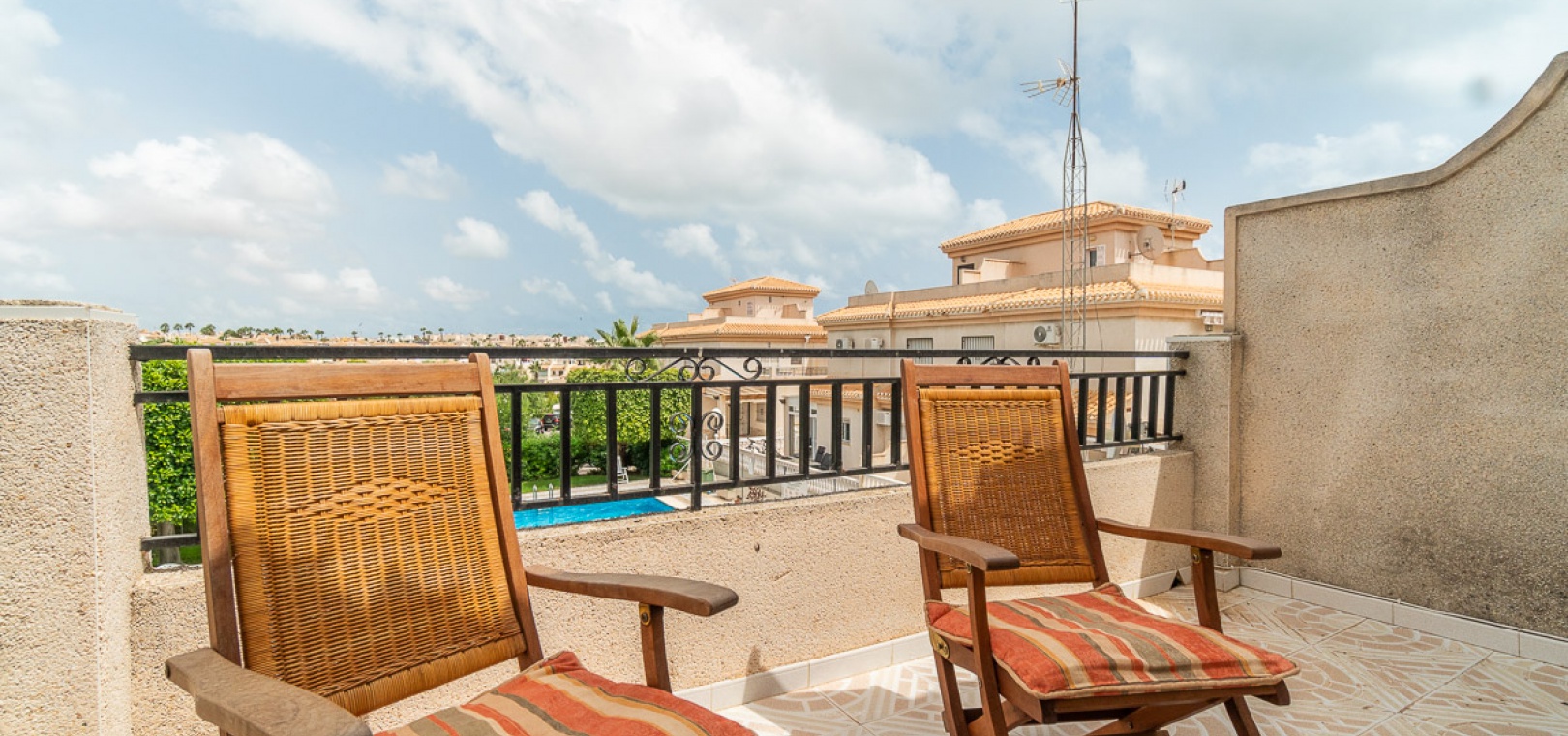 Internal stairs take up you to the private rooftop solarium with views over the communal swimming pool. There is a front and side garden with a BBQ area, a glazed in front terrace with a sun awning & a communal swimming pool just infront of the property.