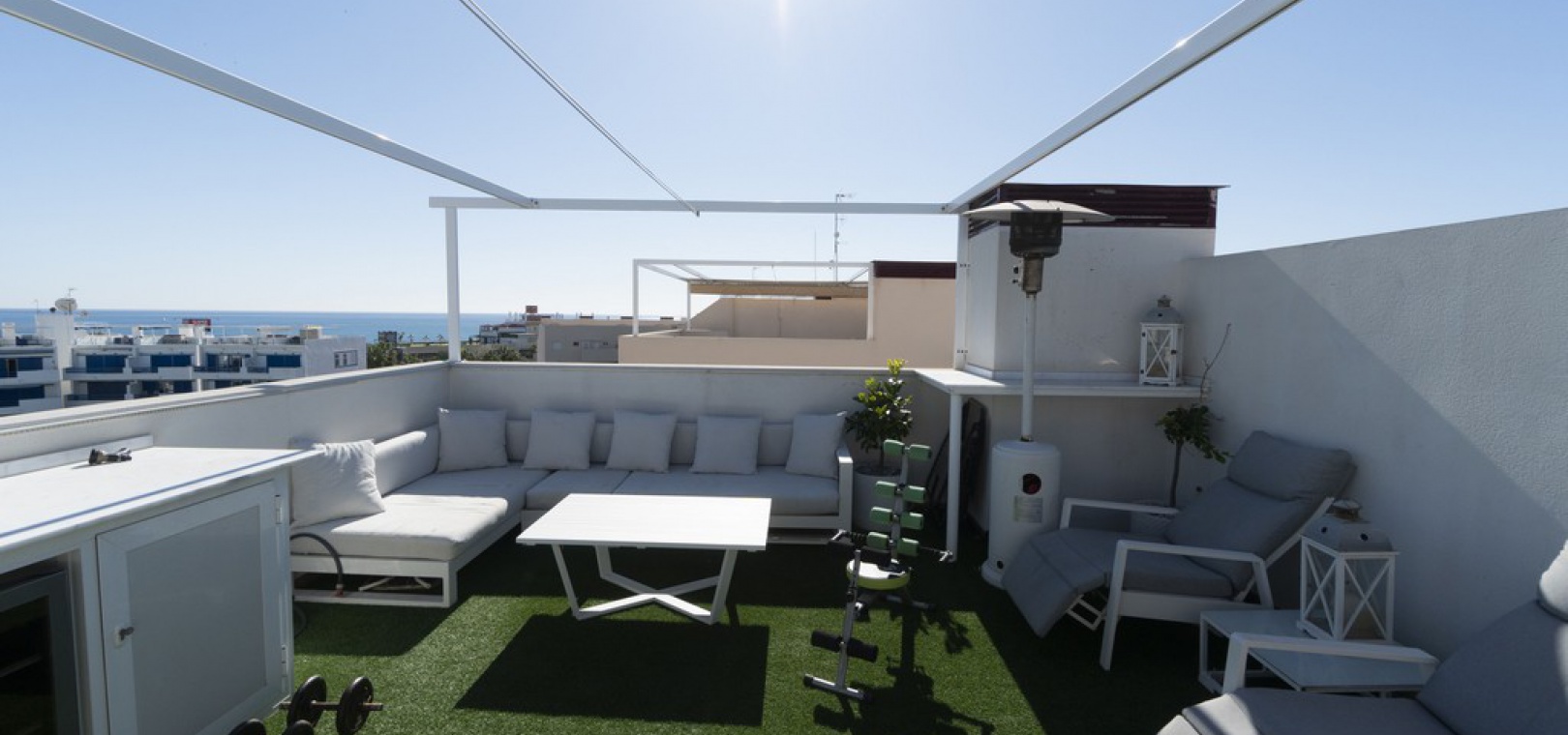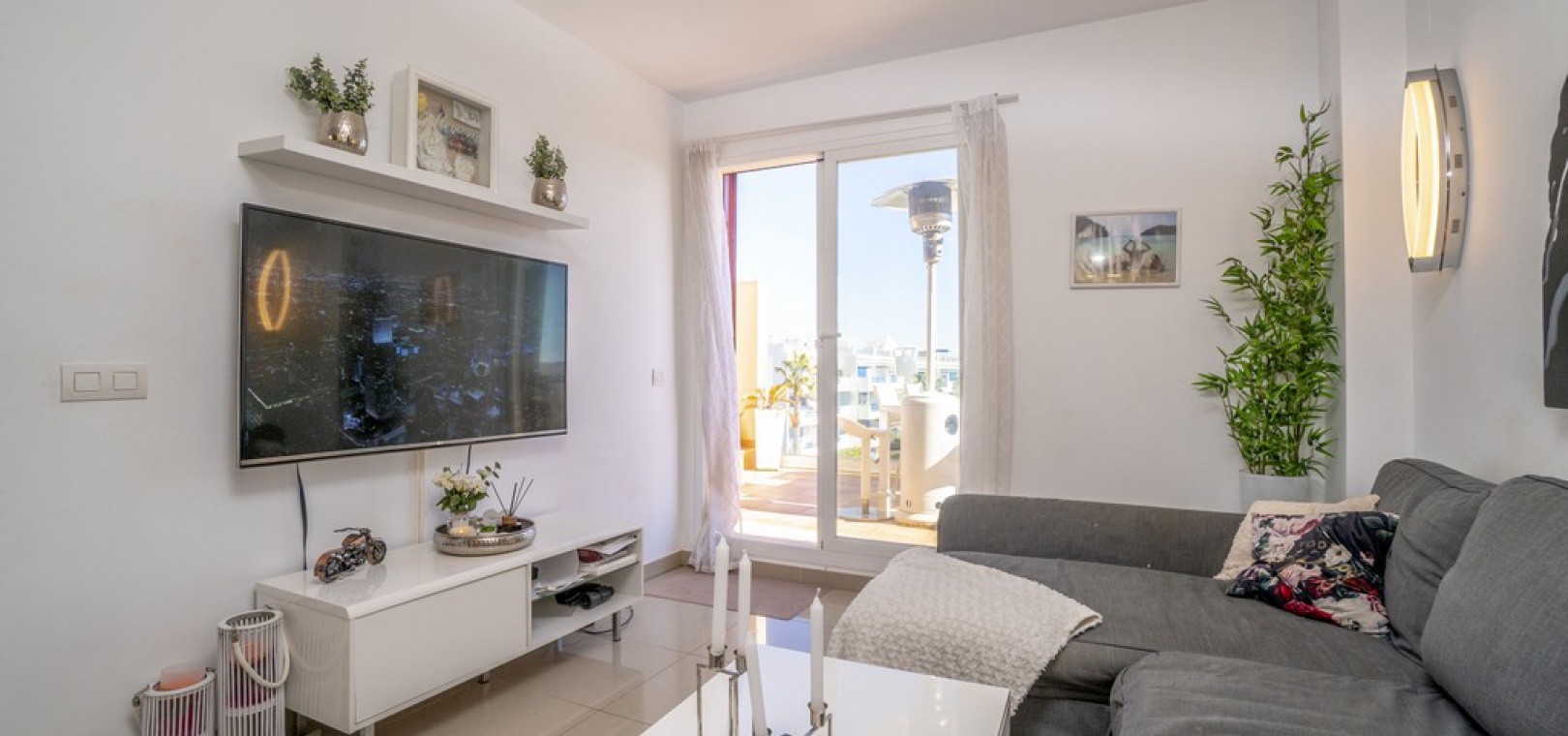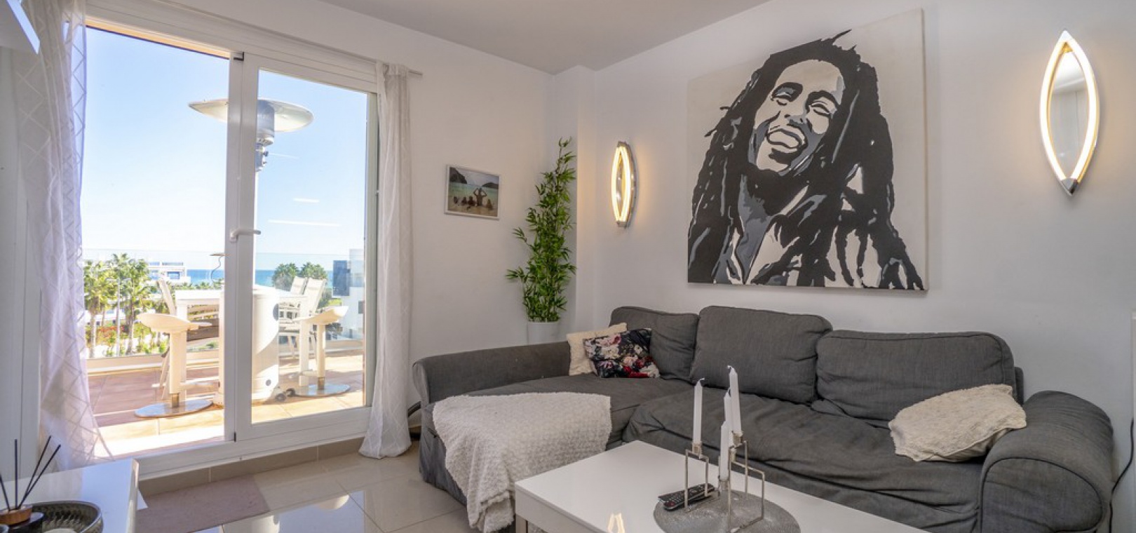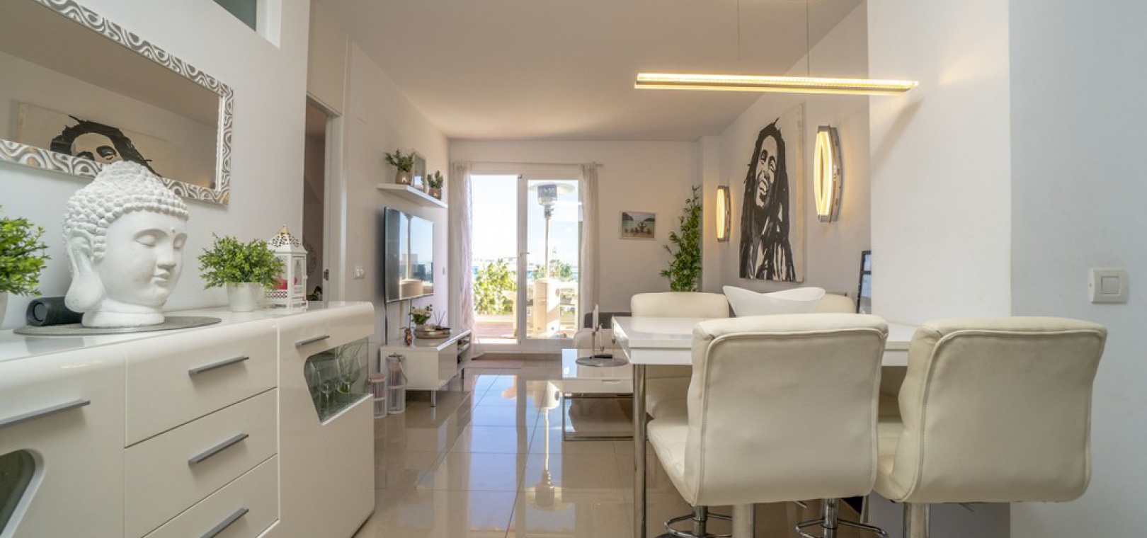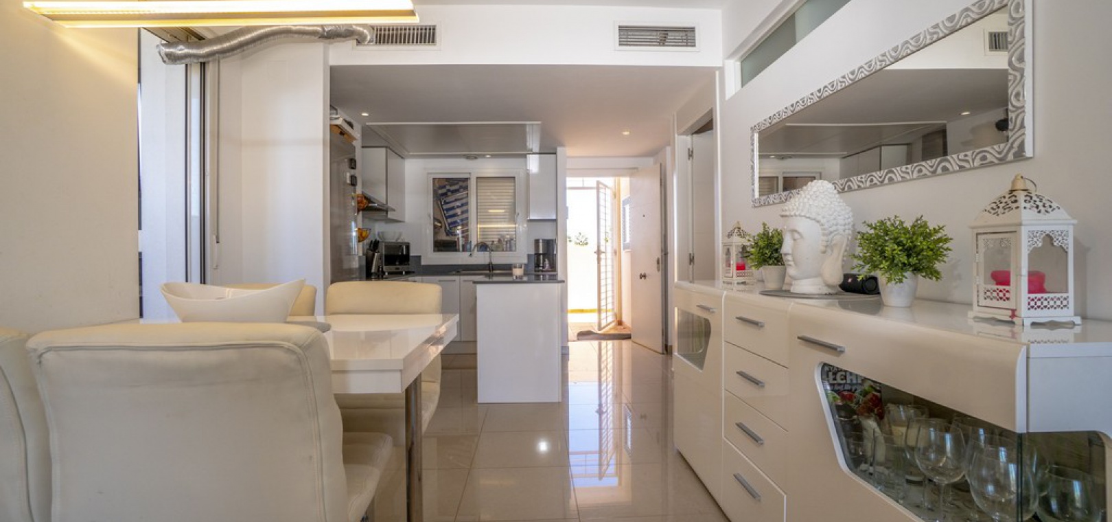 Lounge / dining, open plan fully fitted kitchen, 2 x double bedrooms both with fitted wardrobes & the master bedroom with an en-suite shower room, balcony off of the lounge with steps up to the large 35m2 private solarium which has great views over the local area & down to the sea.