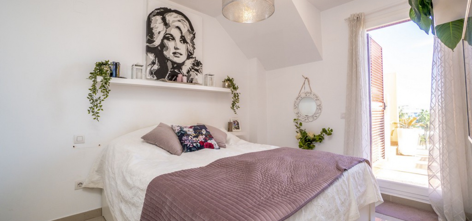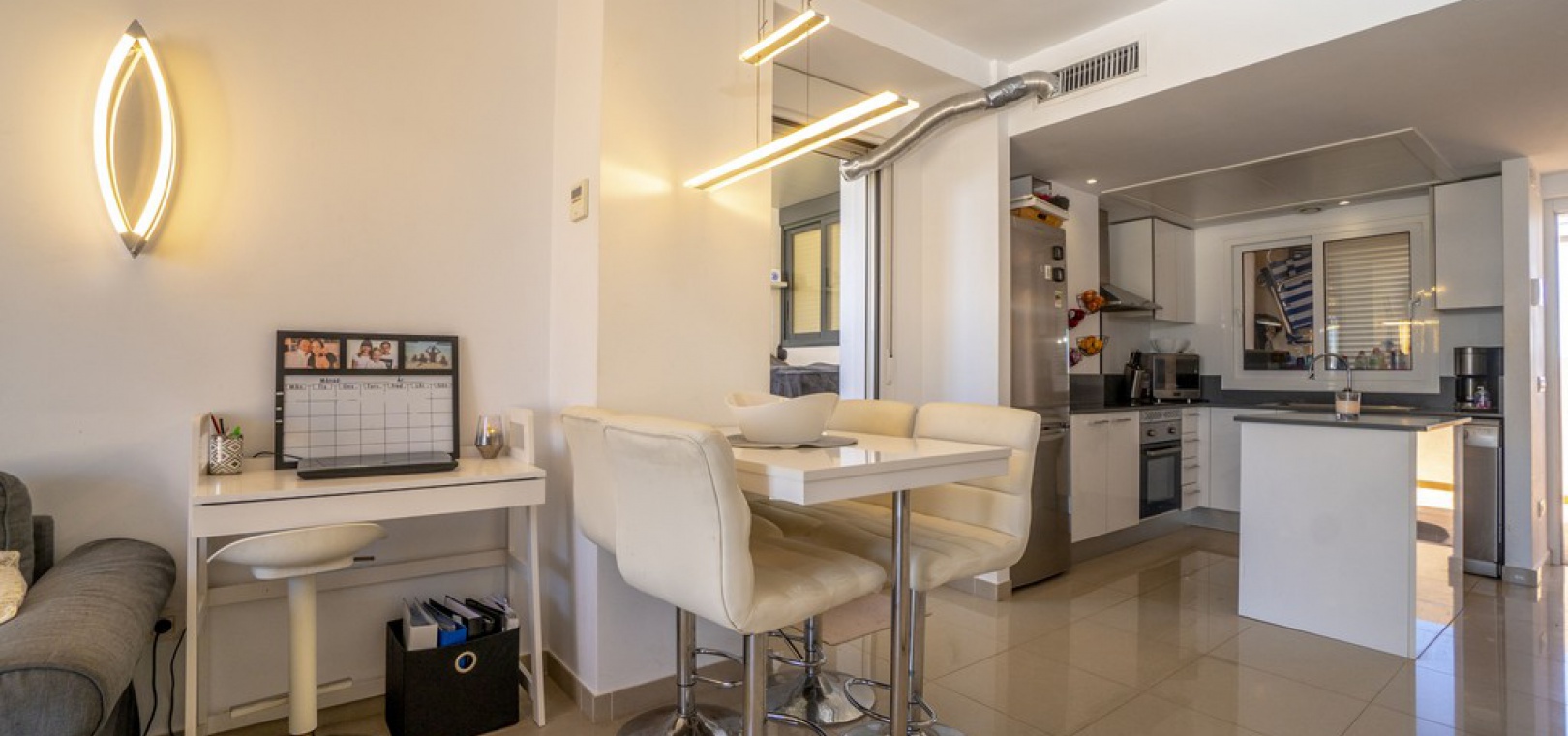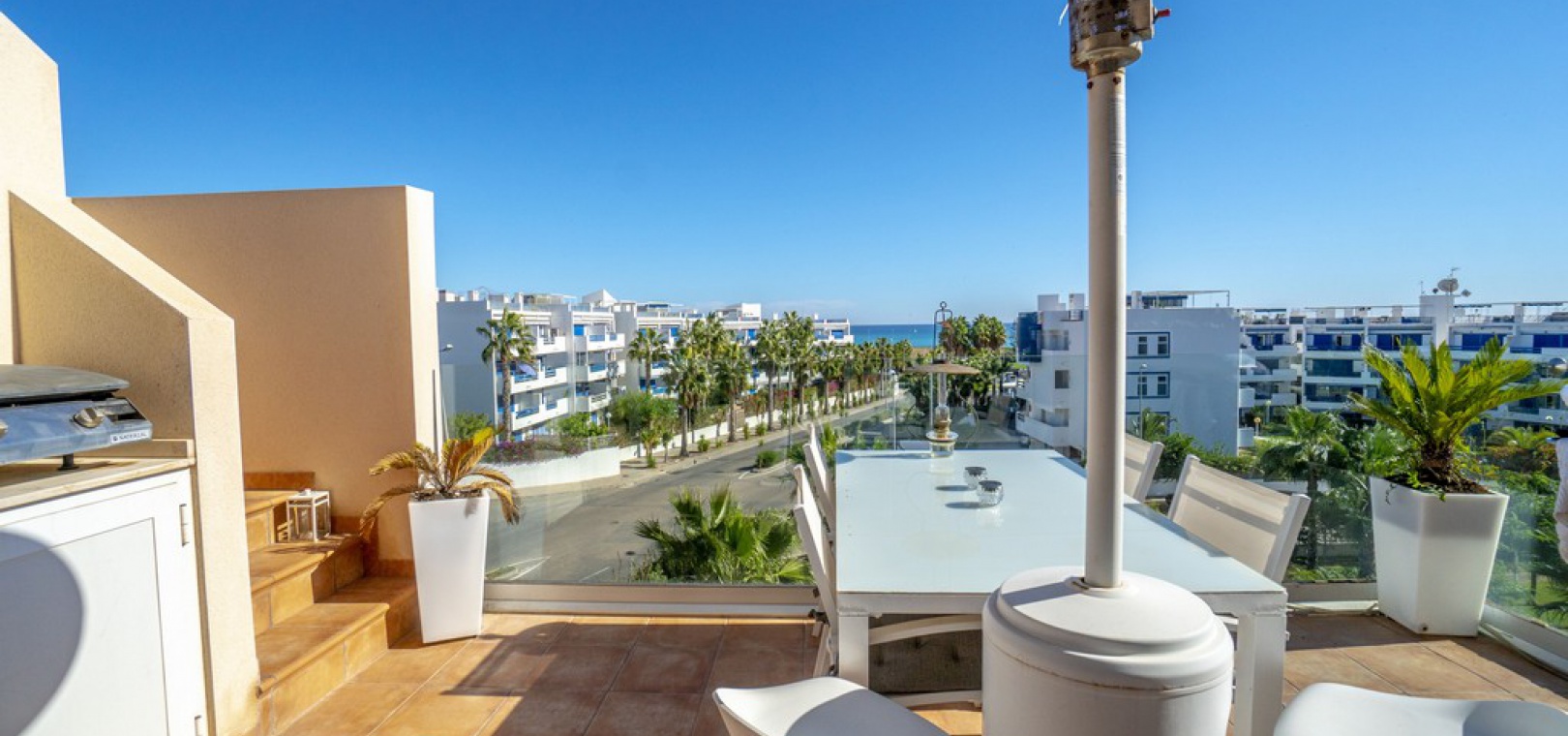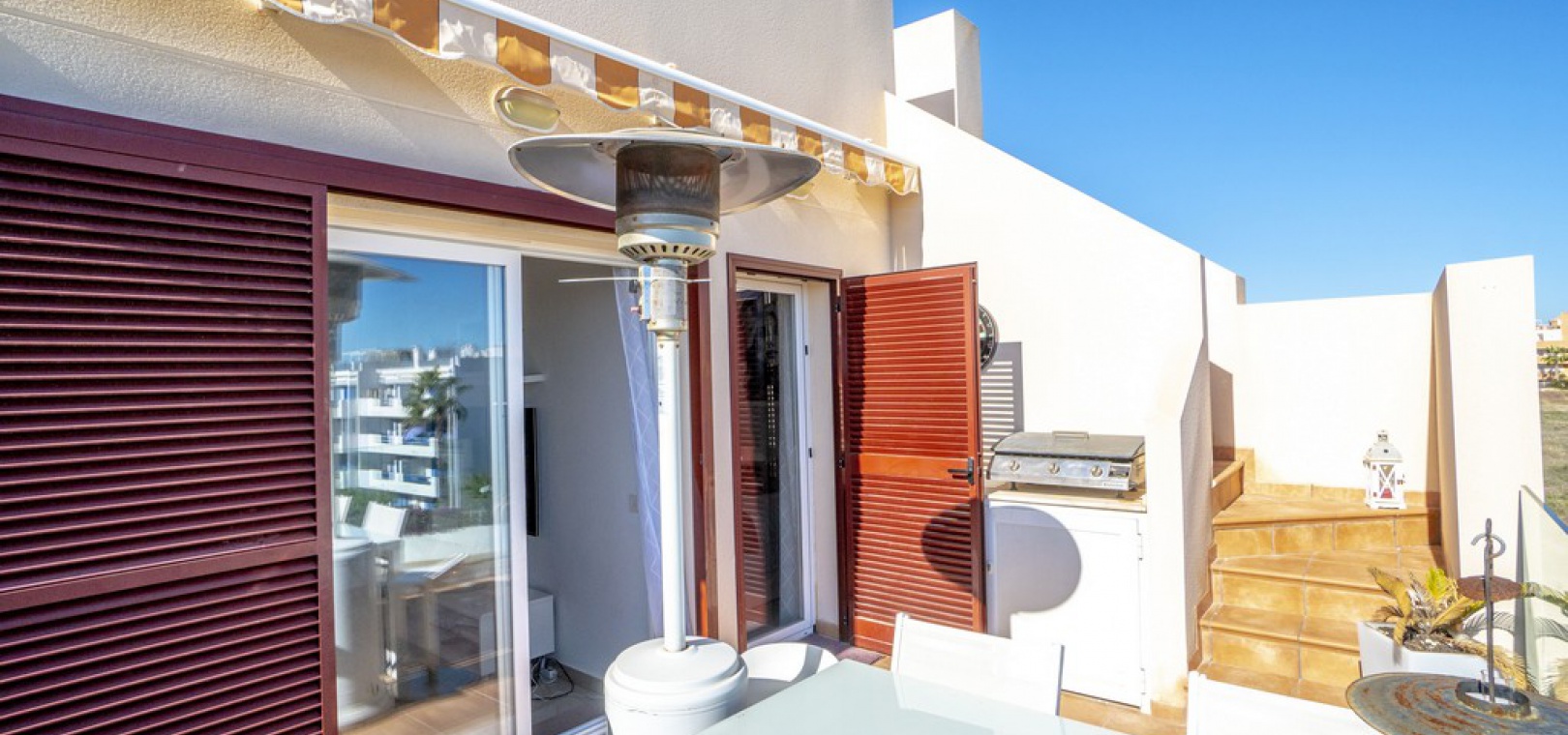 A South East facing 2 bed 2 bath top floor apartment with views down to the sea located in the modern secure gated complex of La Quinta, Playa Flamenca, Costa Blanca.