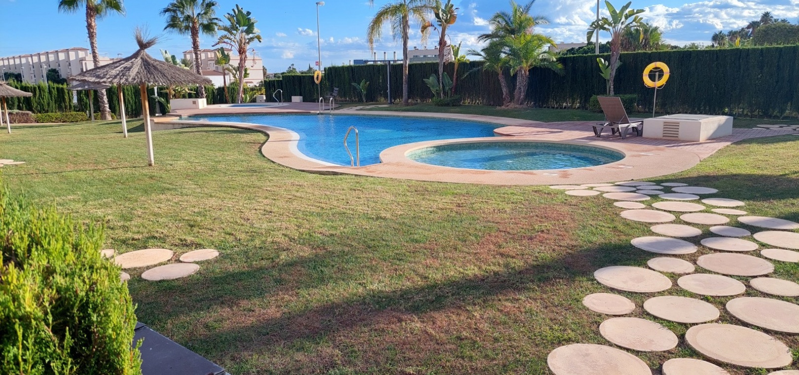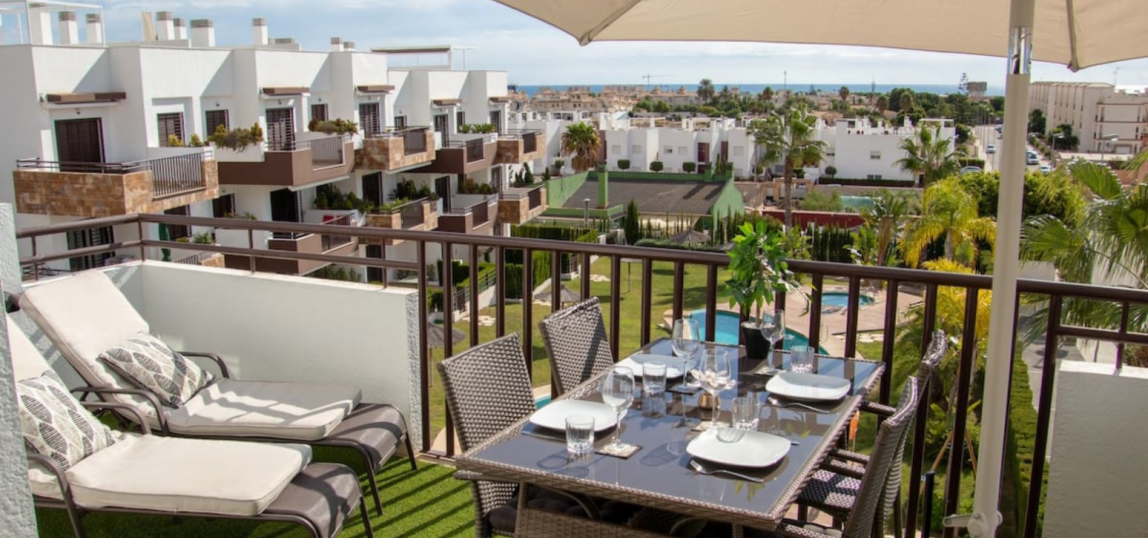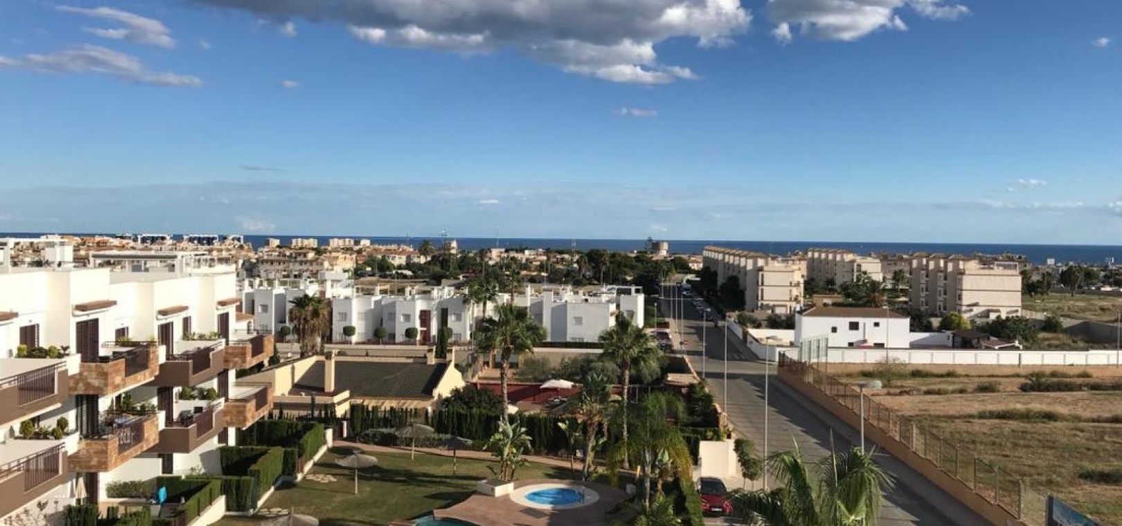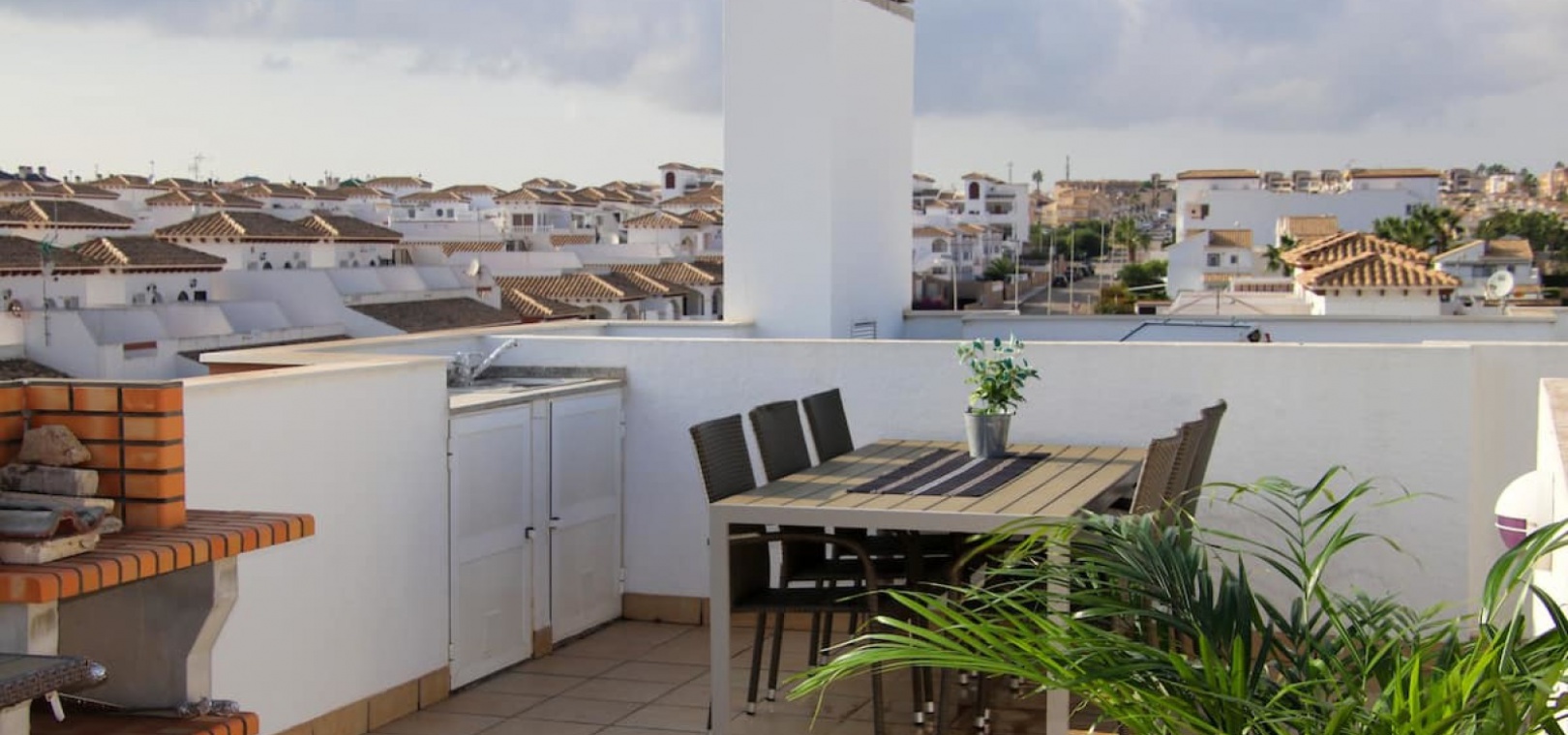 A 2 bed 2 bath modern style top floor corner apartment with a private rooftop solarium & views to the communal swimming pool located in Res. Silene, Punta Prima, Costa Blanca.