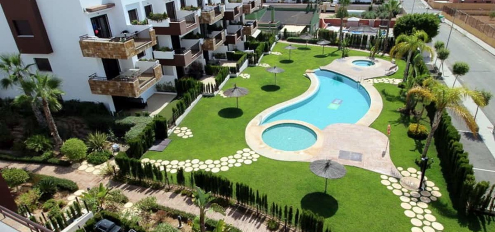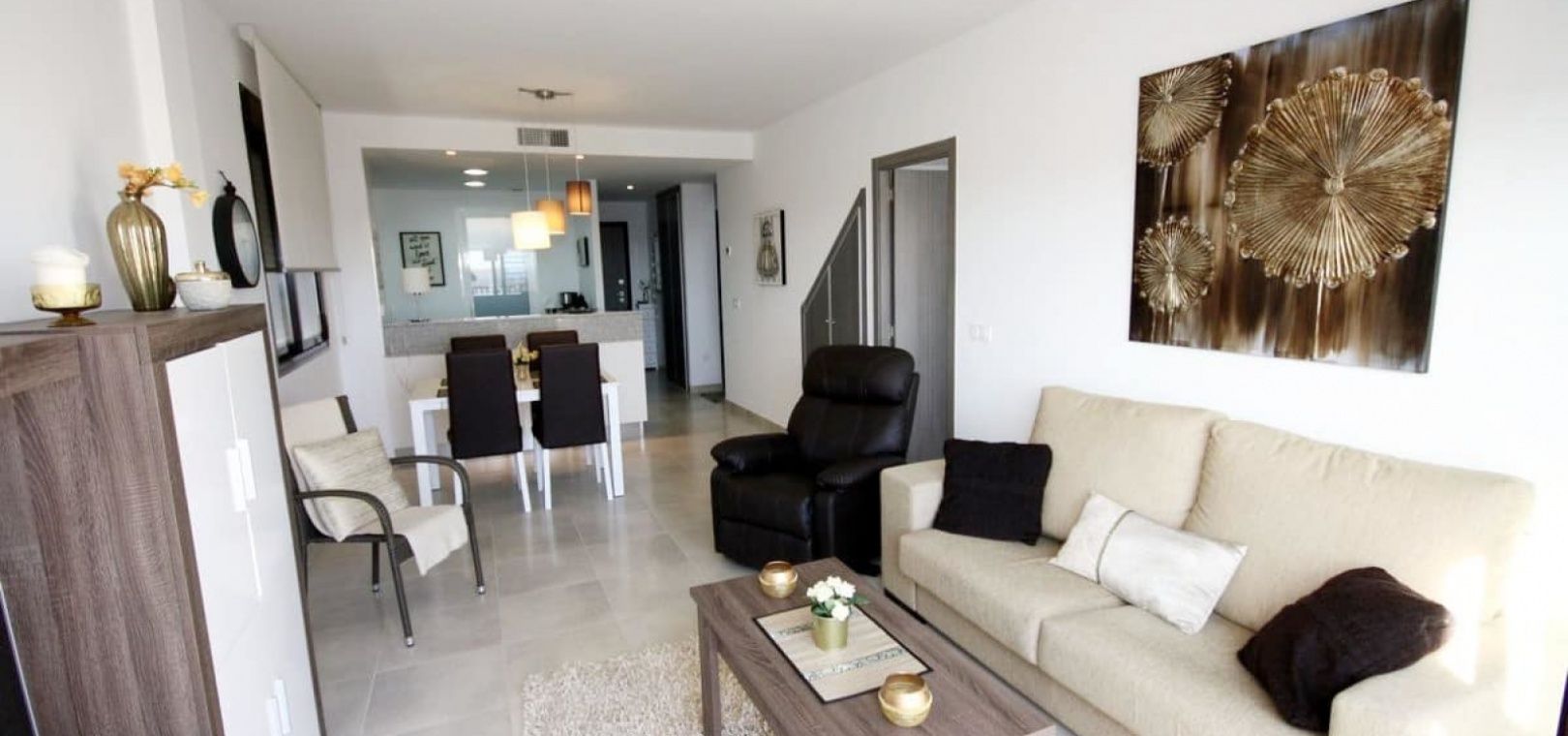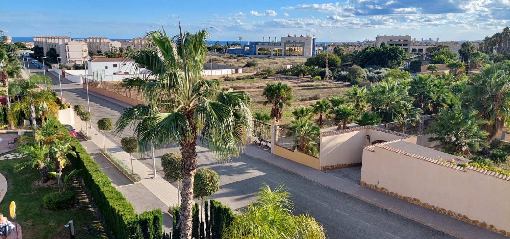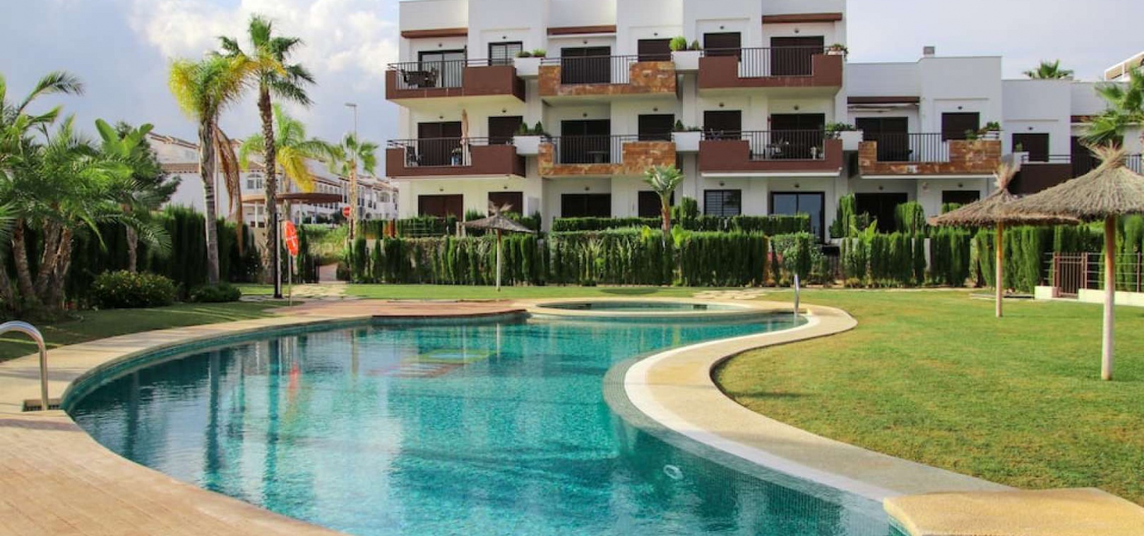 A 2 bed 2 bath modern style top floor corner apartment with a private rooftop solarium & views to the communal swimming pool located in Res. Silene, Punta Prima, Costa Blanca.