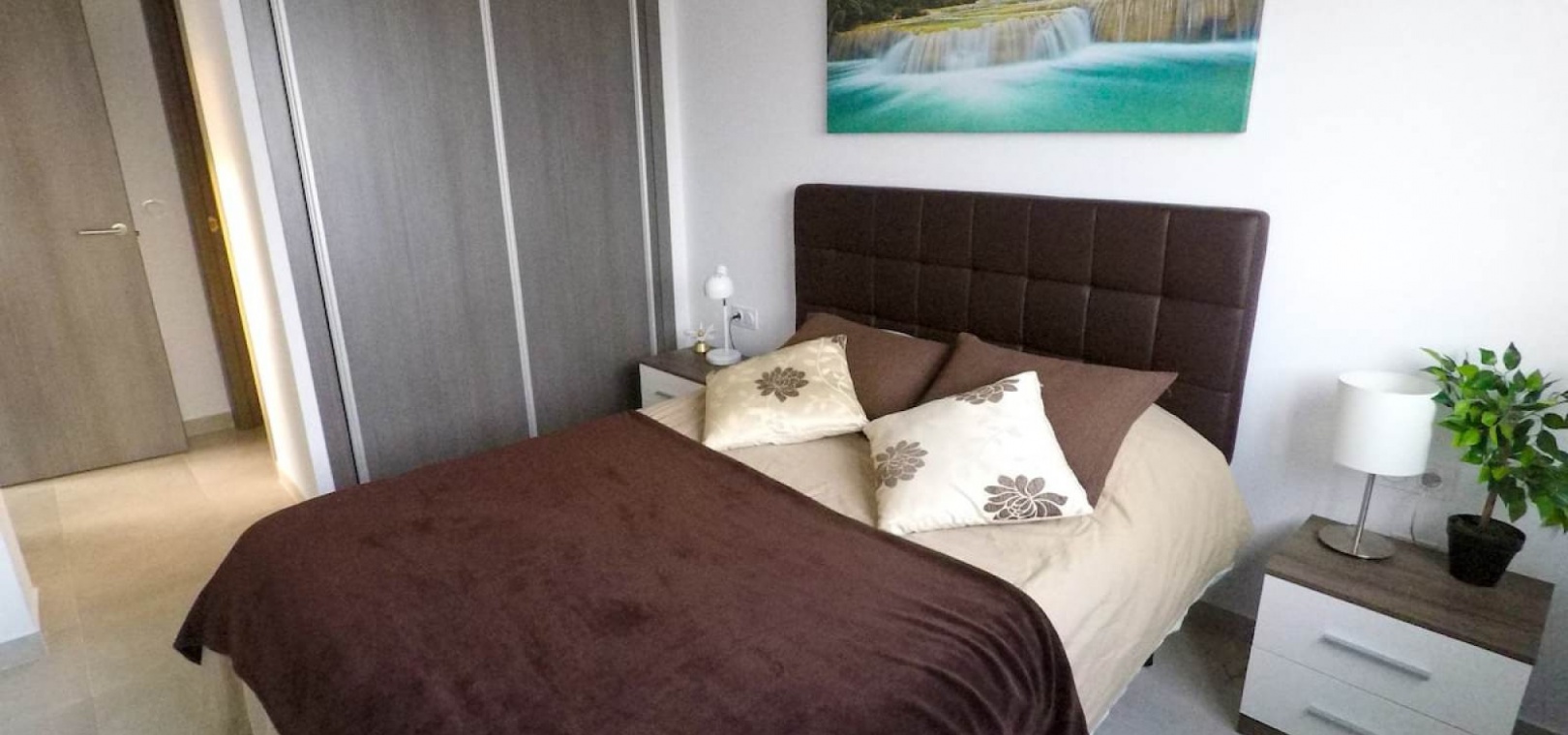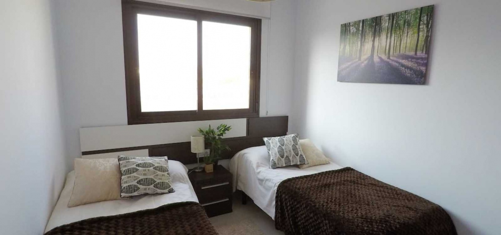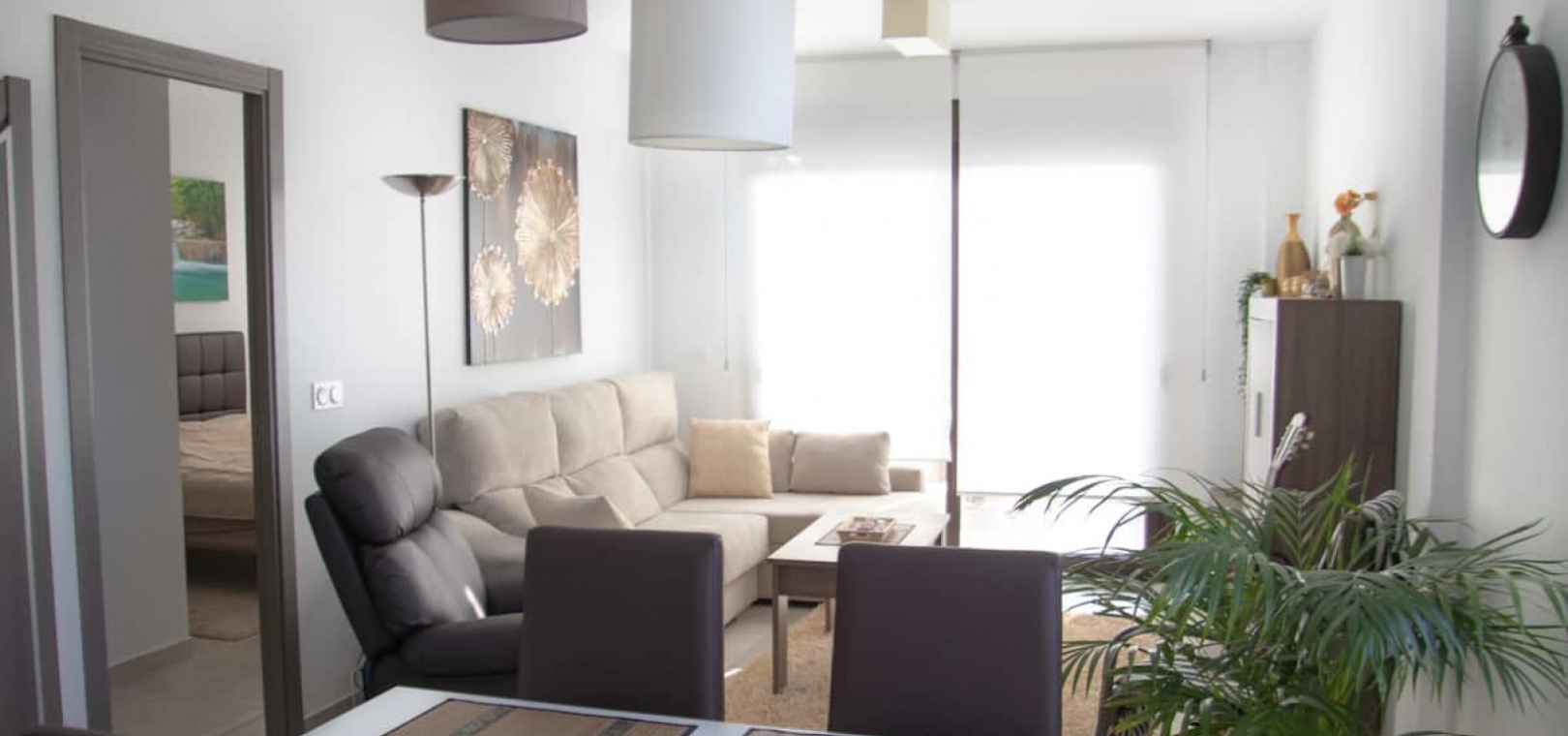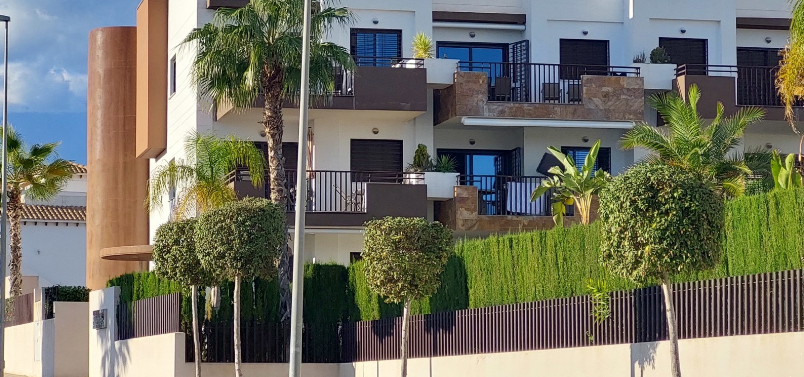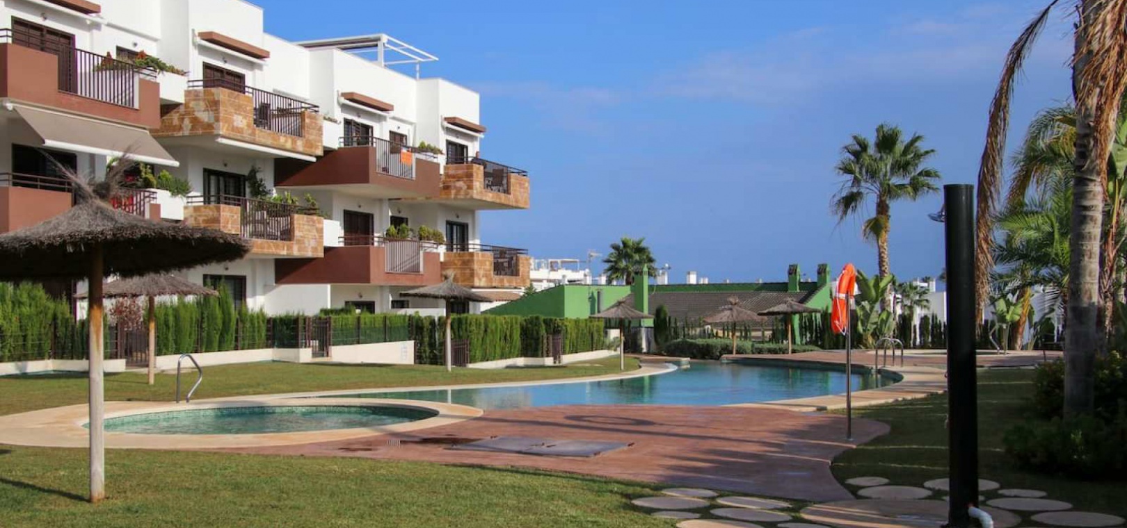 A 2 bed 2 bath modern style top floor corner apartment with a private rooftop solarium & views to the communal swimming pool located in Res. Silene, Punta Prima, Costa Blanca.