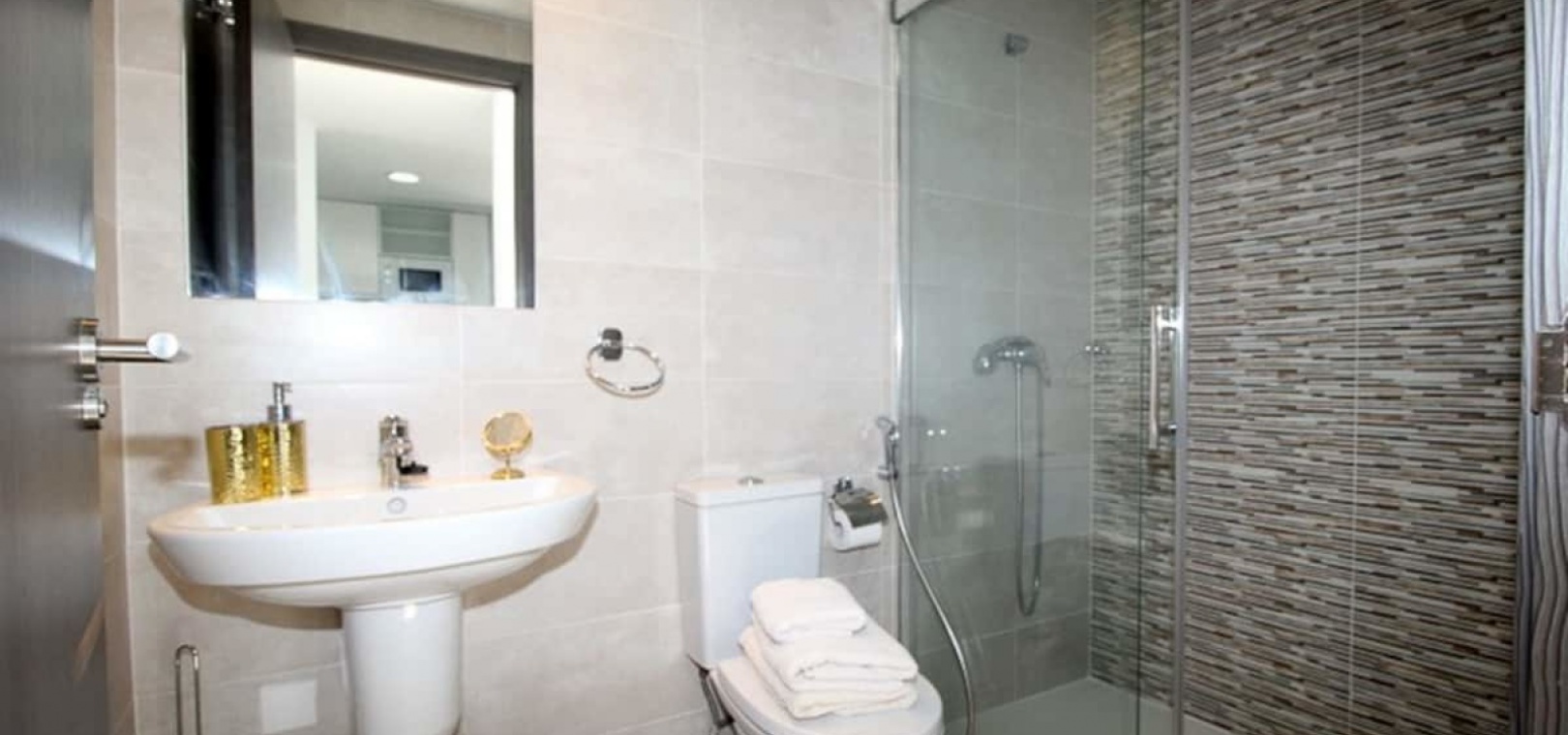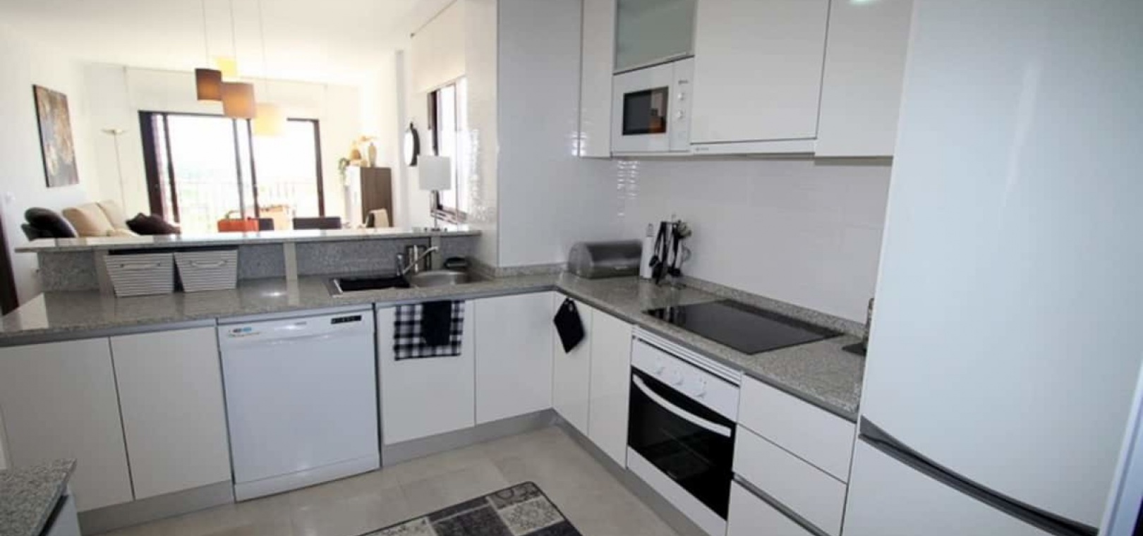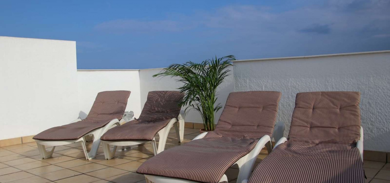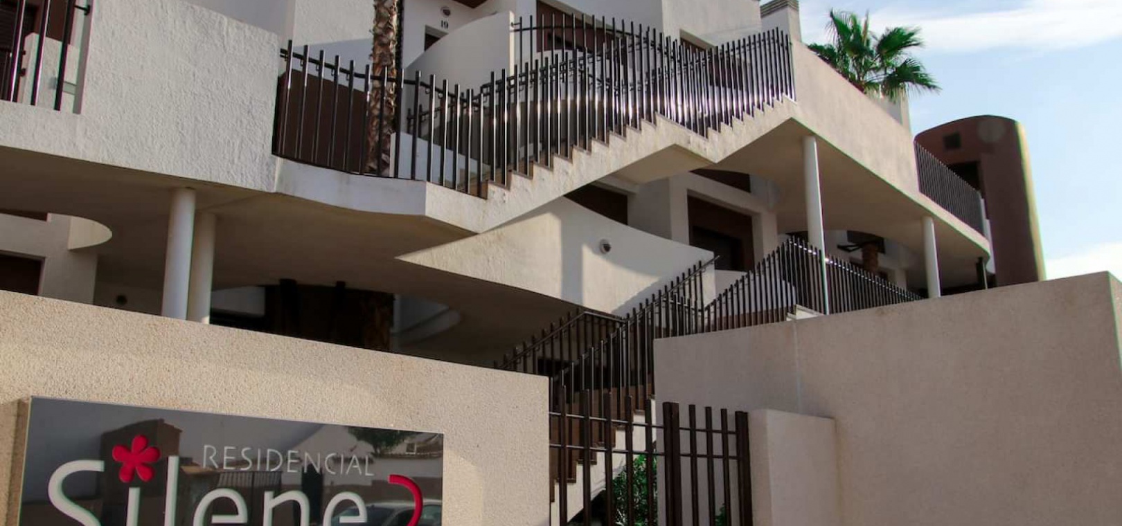A 2 bed 2 bath modern style top floor corner apartment with a private rooftop solarium & views to the communal swimming pool located in Res. Silene, Punta Prima, Costa Blanca.