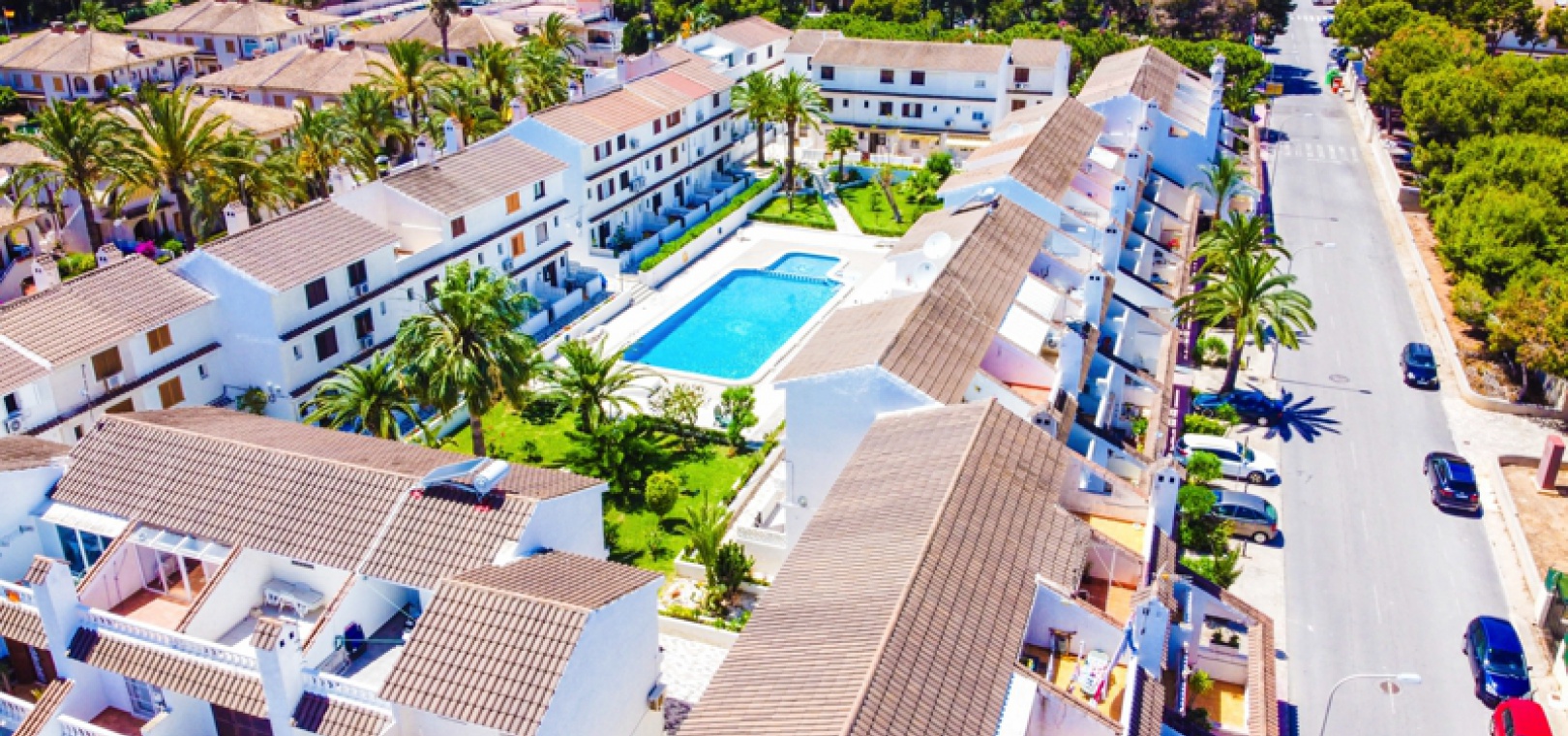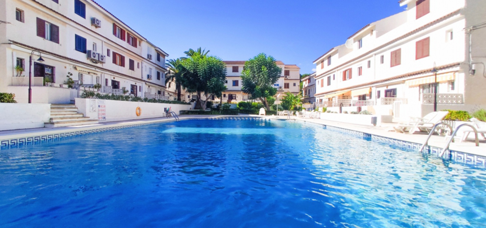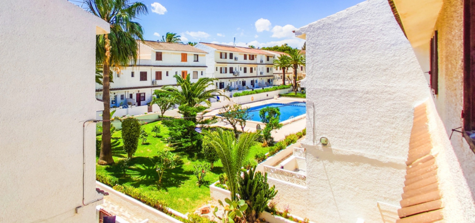 The property has a front garden and a front terrace. The communal swimming pool is just behind the property