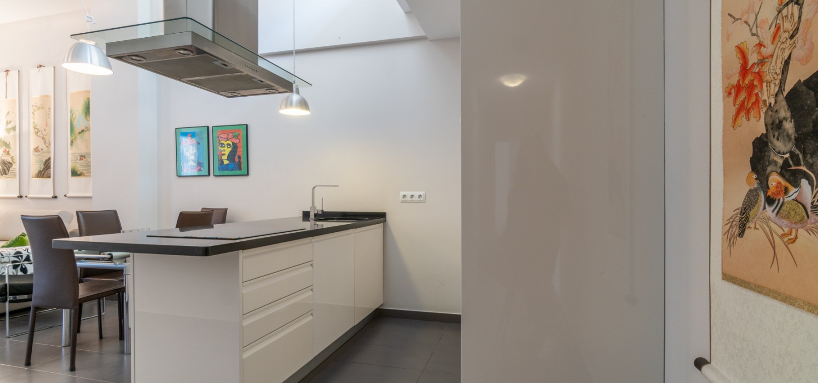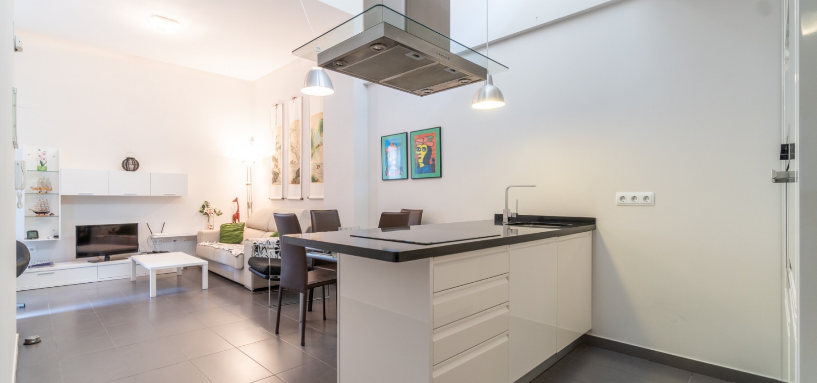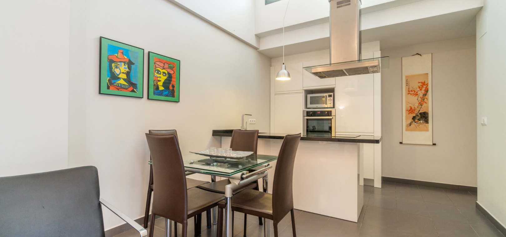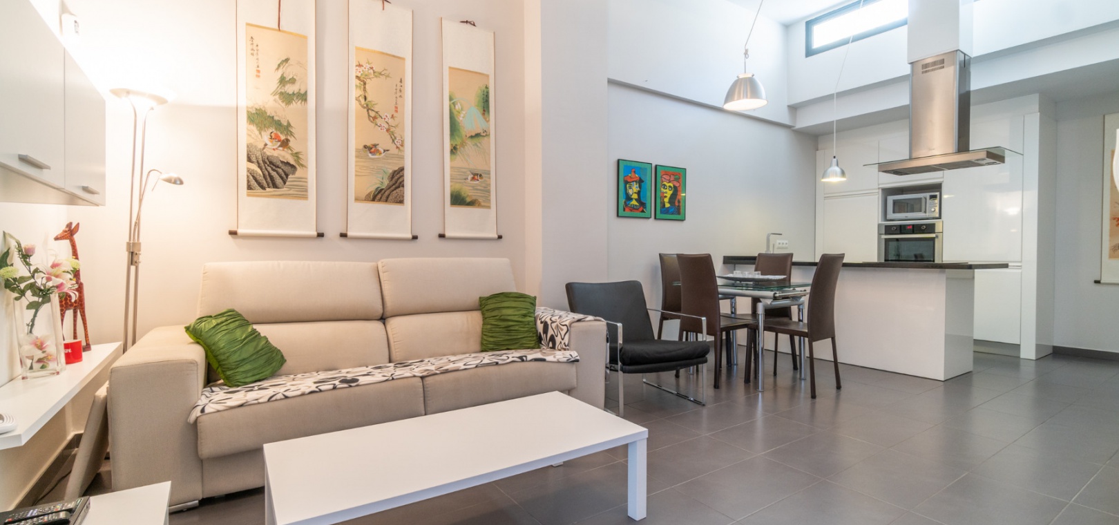 Lounge / diner & an open plan modern kitchen with double height ceilings, 2 x double bedrooms with fitted wardrobes, the master bedroom has an en-suite shower room, 1 x family bathroom, a 28m2 private rooftop solarium, a front terrace & front garden, a communal swimming pool just behind the property, communal parking, part furnished & much more.