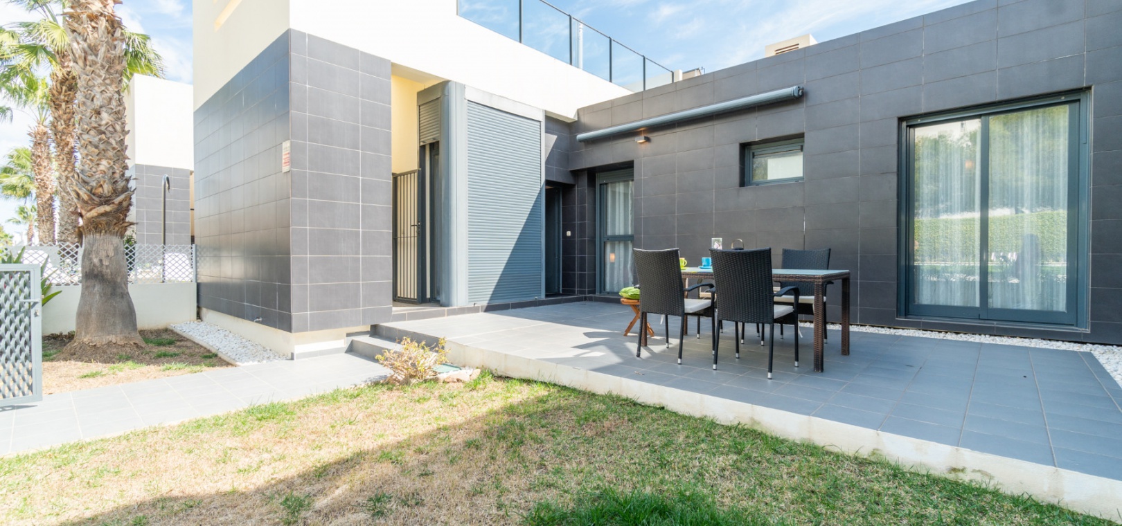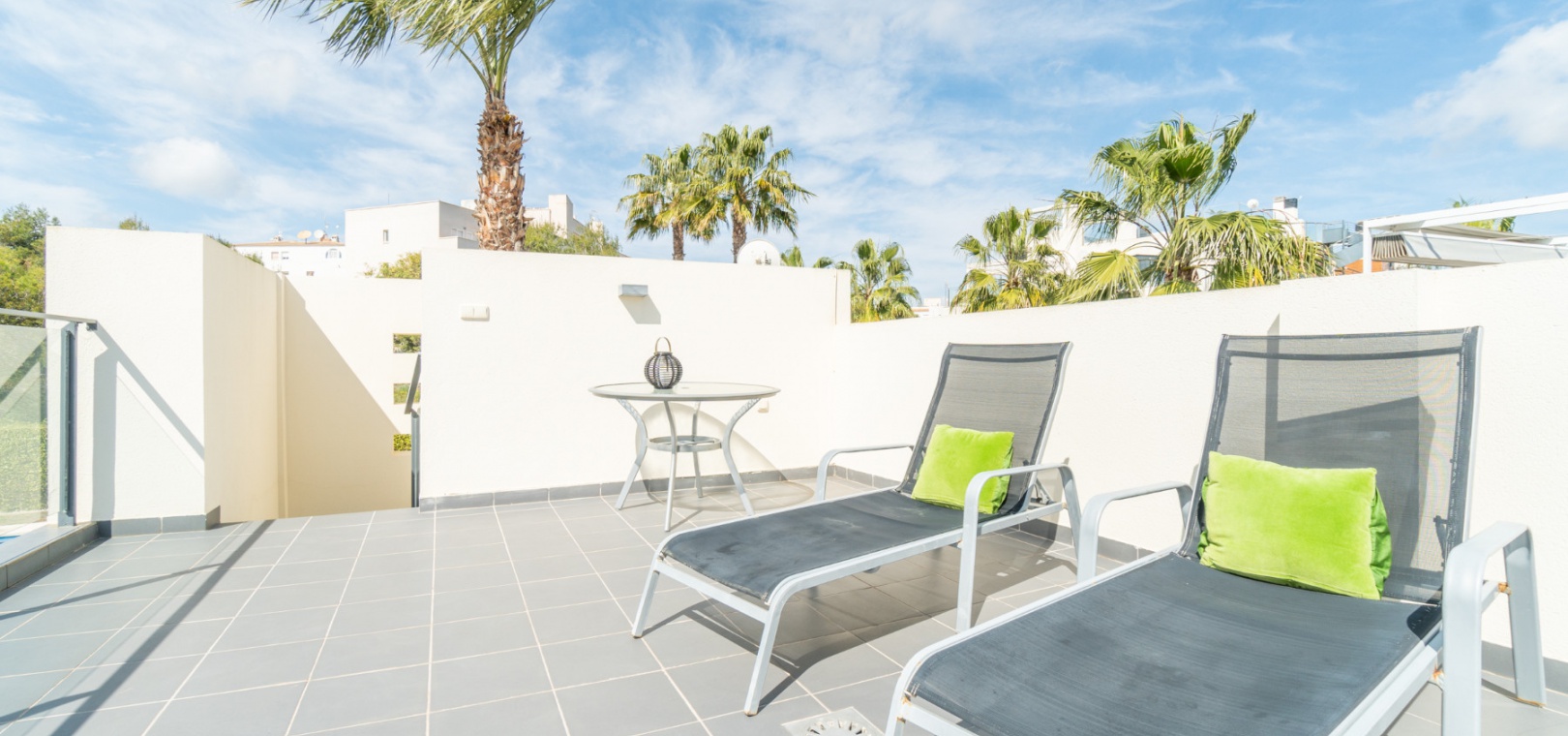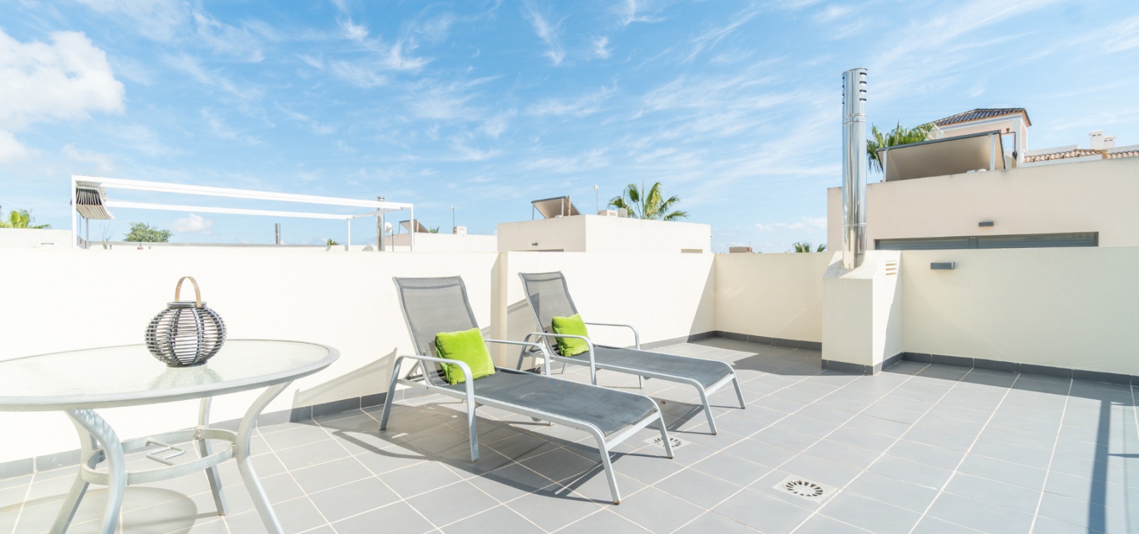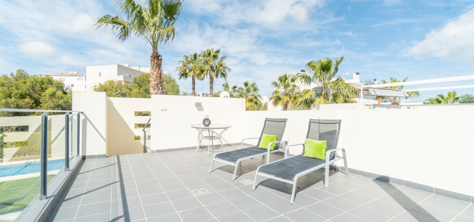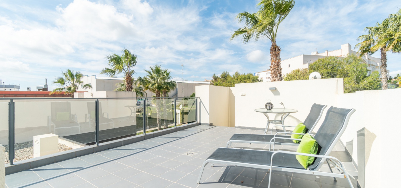 A 2 bed 2 bath modern style bungalow with a private rooftop solarium located in La Fuente, Villamartin, Costa Blanca.