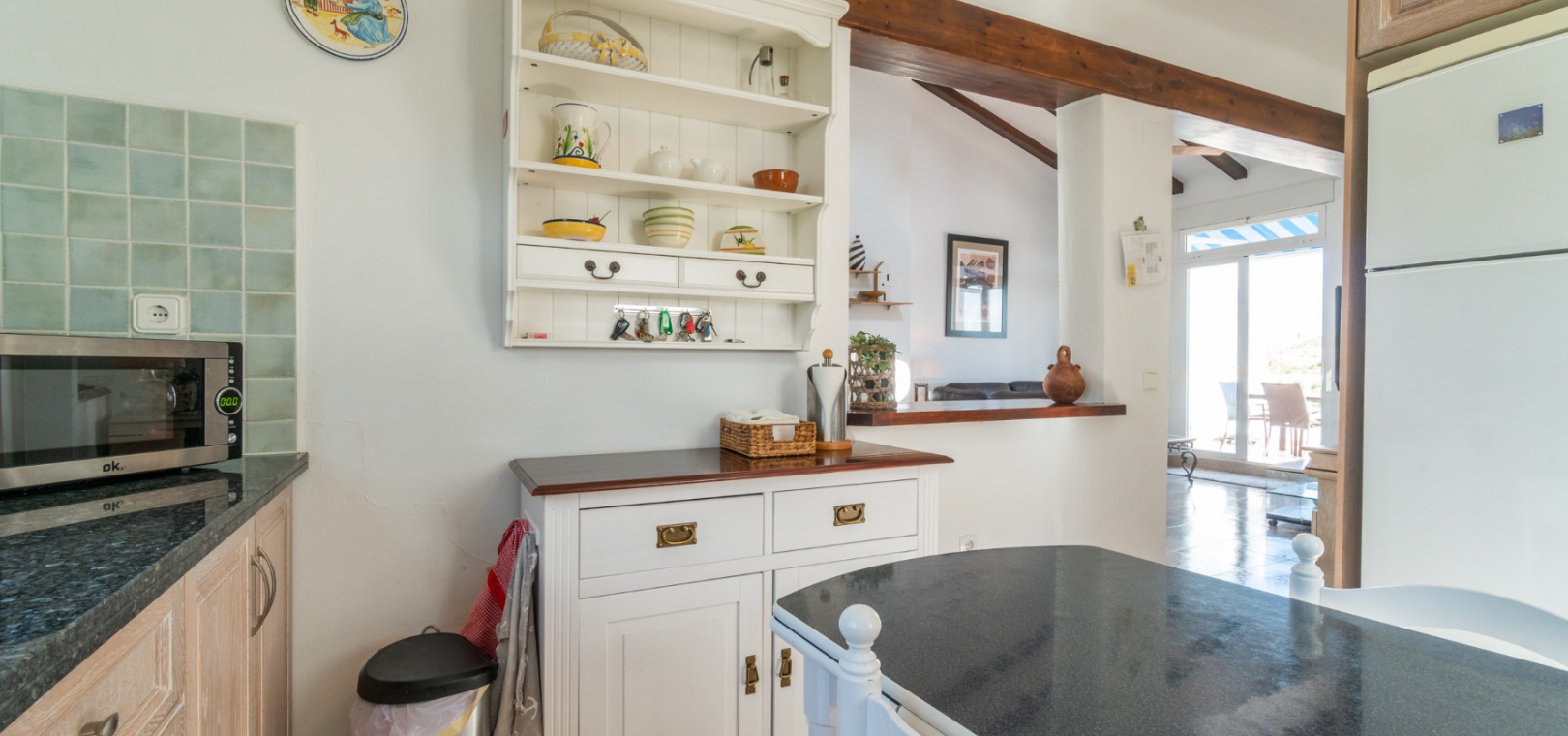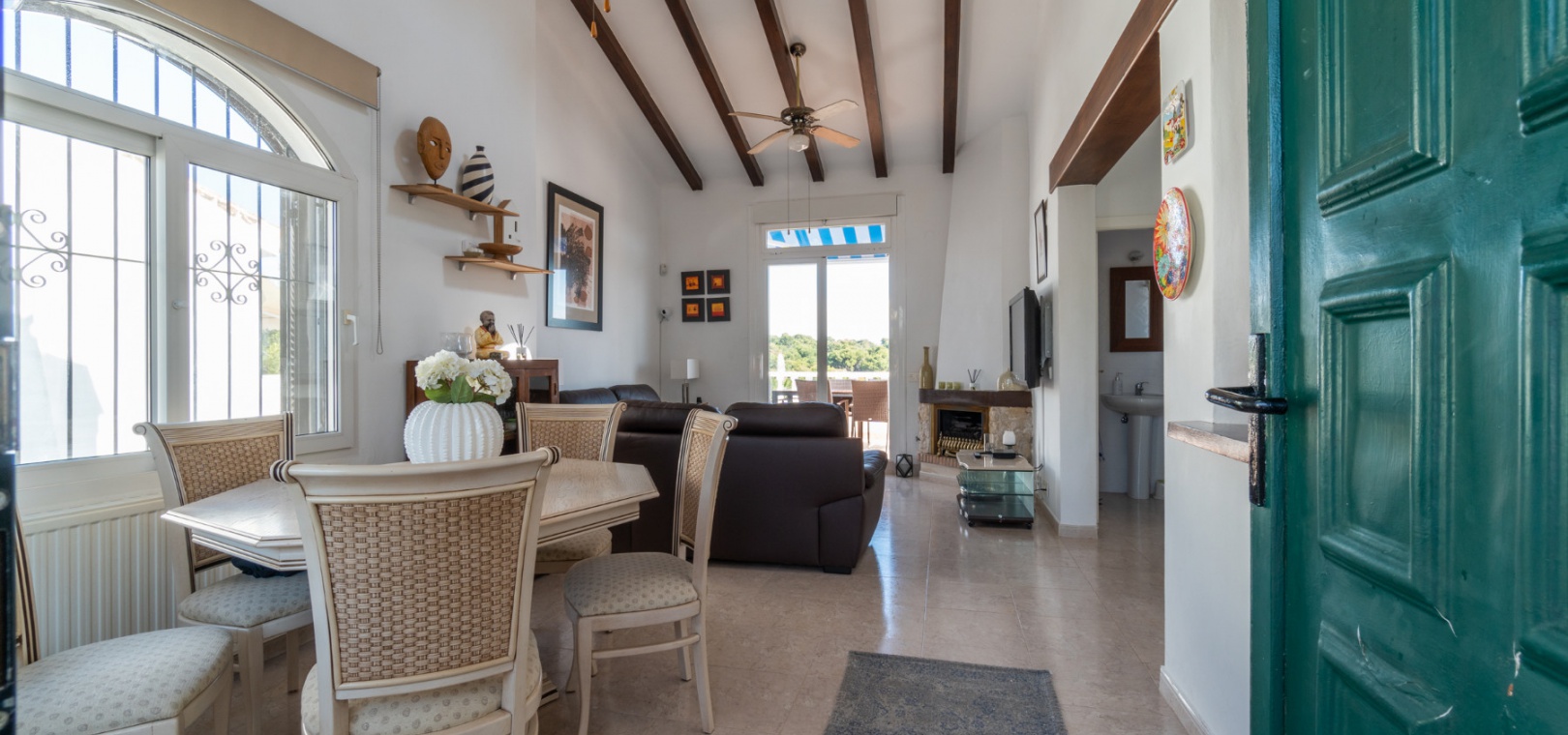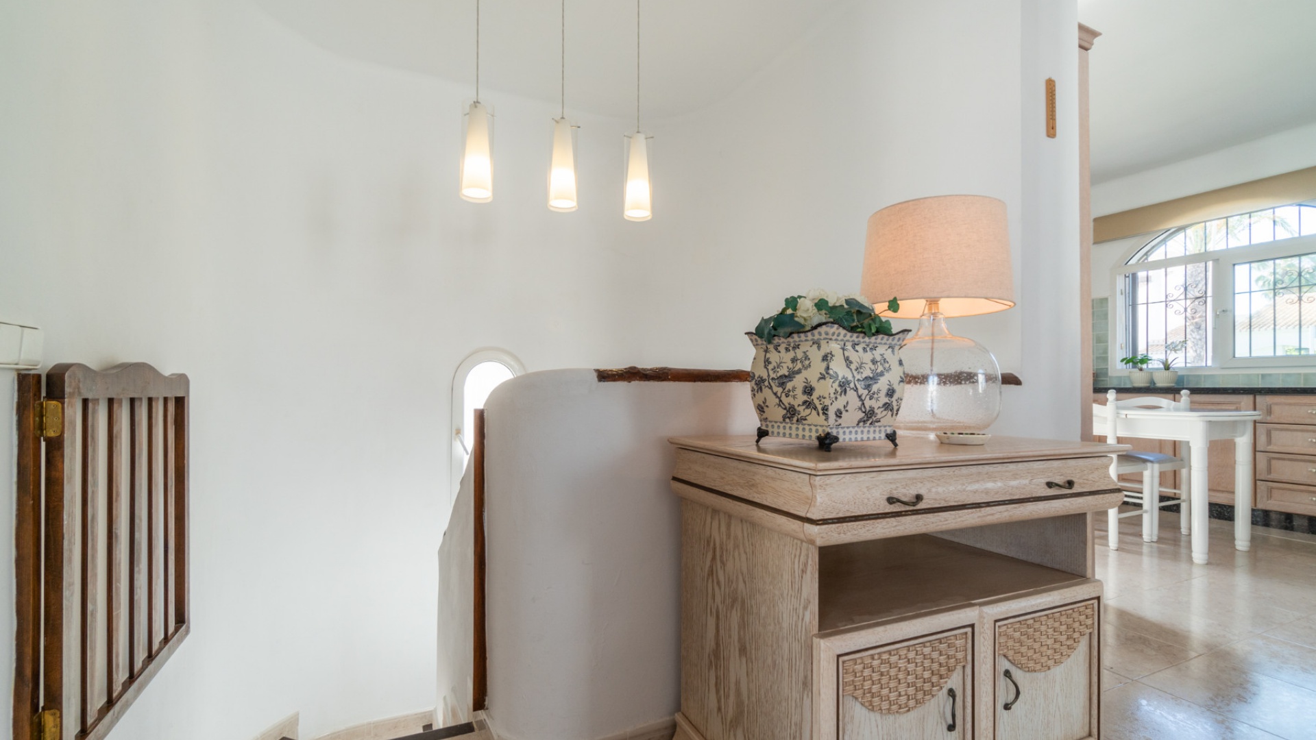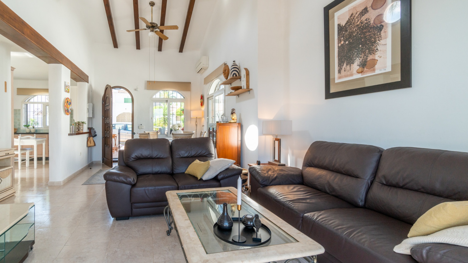 Entering through the front door, you will find yourself in the living and dining room. The ceiling is 2.5 times normal ceiling height, slanting upwards to the big and original wooden beams with 2 x ceiling fans. To the right of the main entrance is a spacious kitchen with marble worktops. On this floor you also have a guest toilet and a storage room.