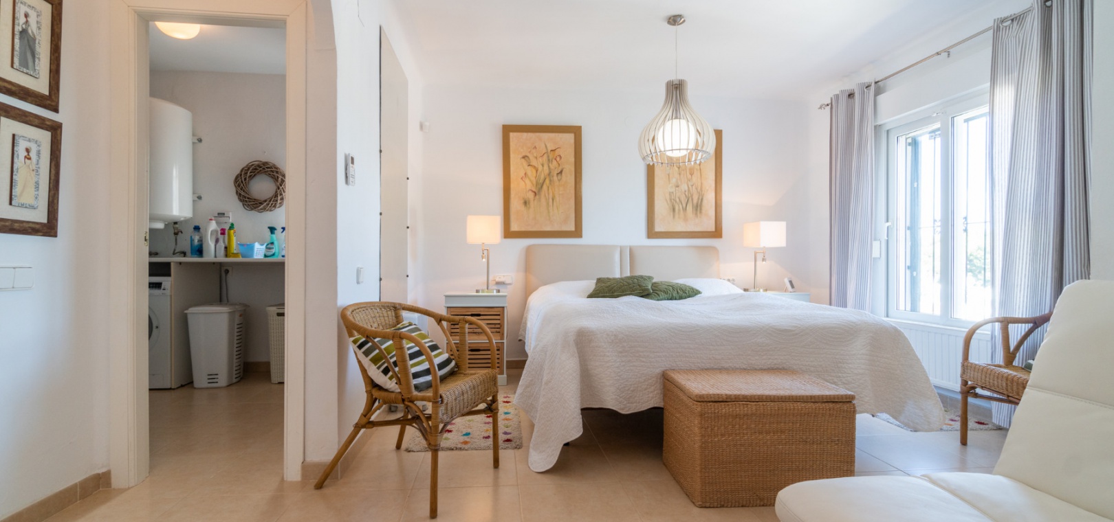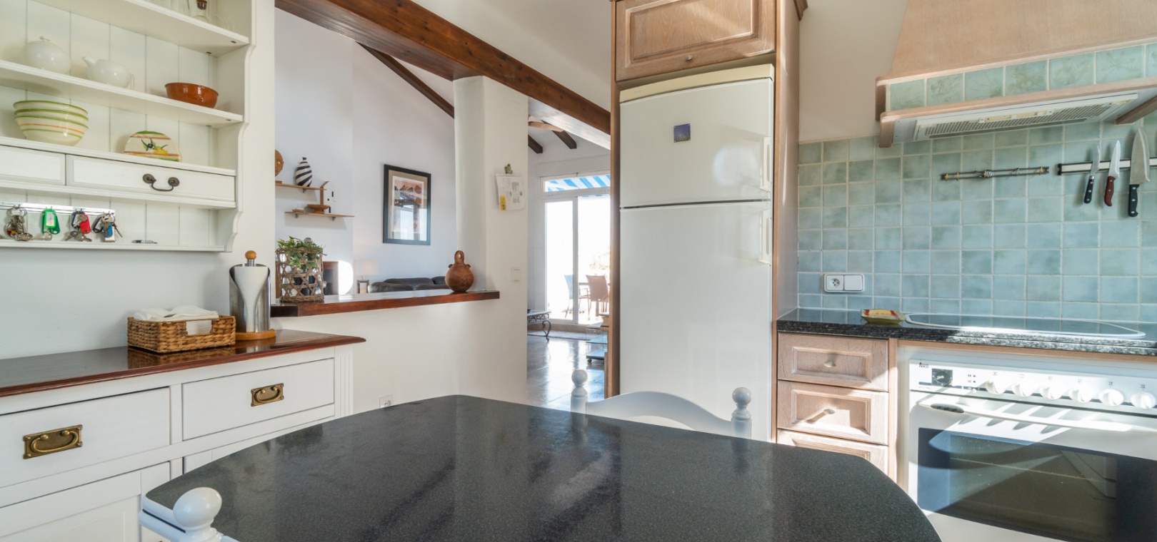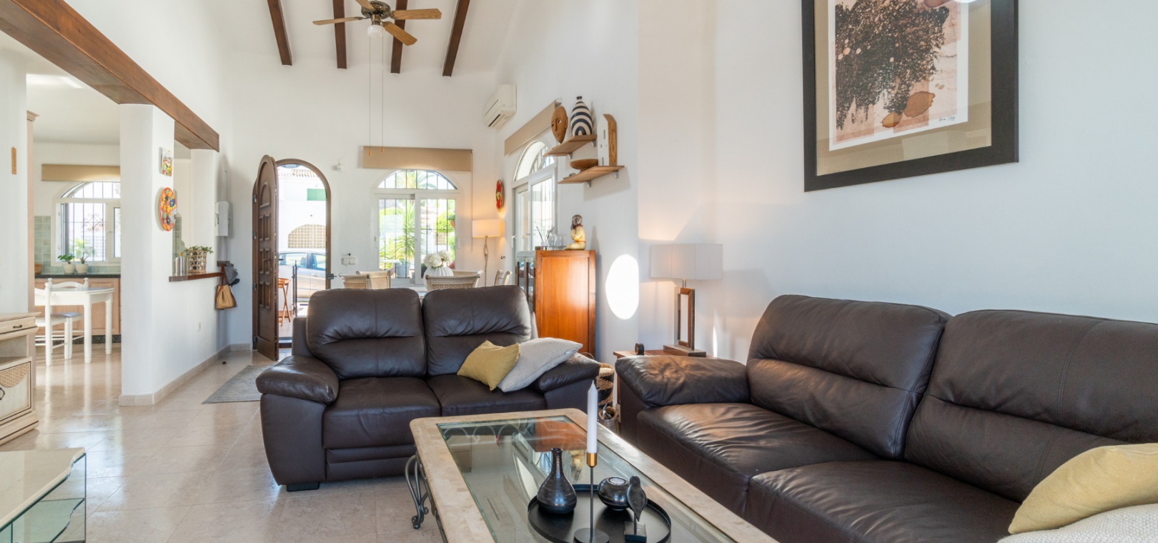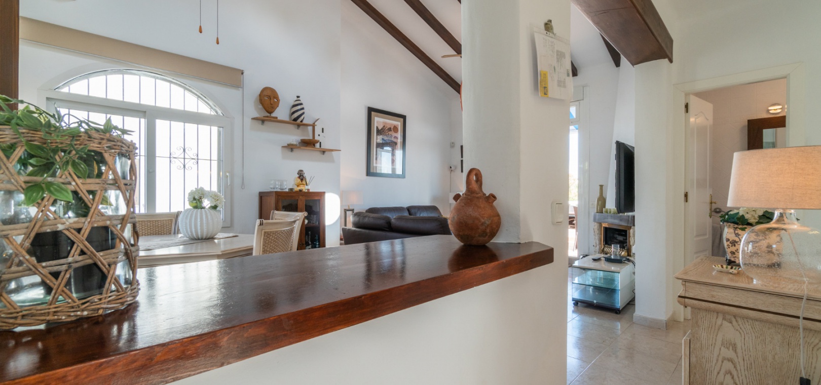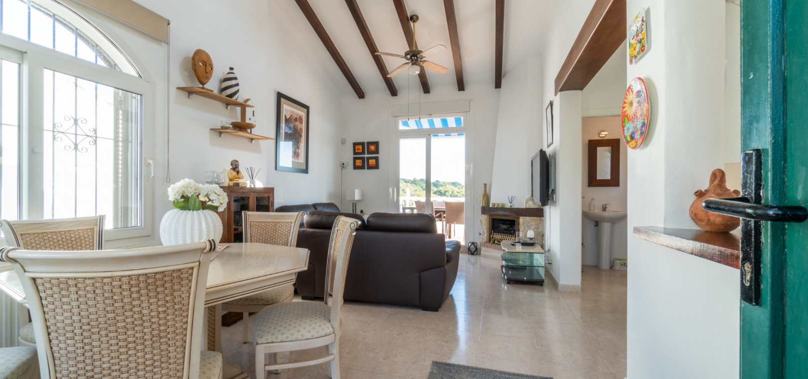 Entering through the front door, you will find yourself in the living and dining room. The ceiling is 2.5 times normal ceiling height, slanting upwards to the big and original wooden beams with 2 x ceiling fans. To the right of the main entrance is a spacious kitchen with marble worktops. On this floor you also have a guest toilet and a storage room.
