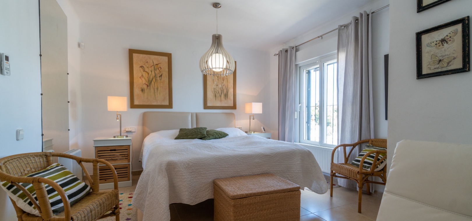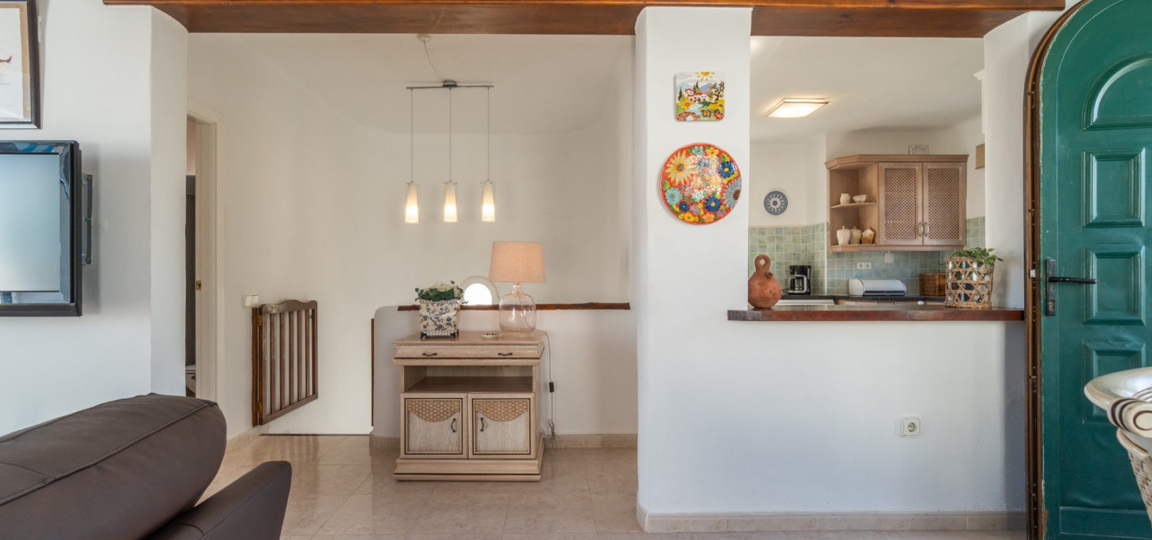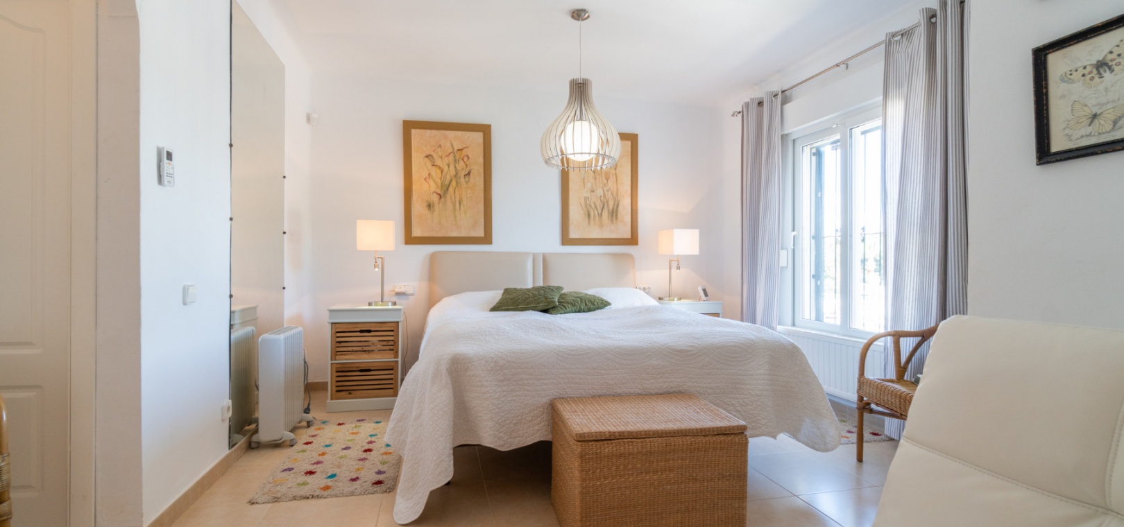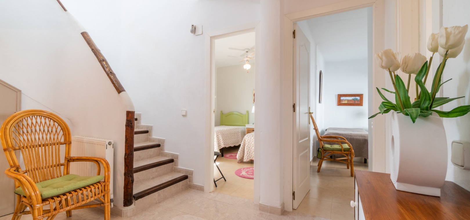 Entering through the front door, you will find yourself in the living and dining room. The ceiling is 2.5 times normal ceiling height, slanting upwards to the big and original wooden beams with 2 x ceiling fans. To the right of the main entrance is a spacious kitchen with marble worktops. On this floor you also have a guest toilet and a storage room.