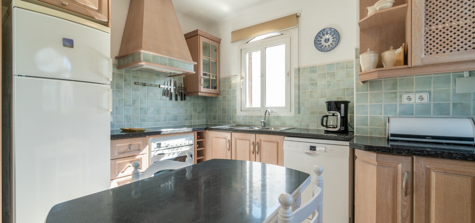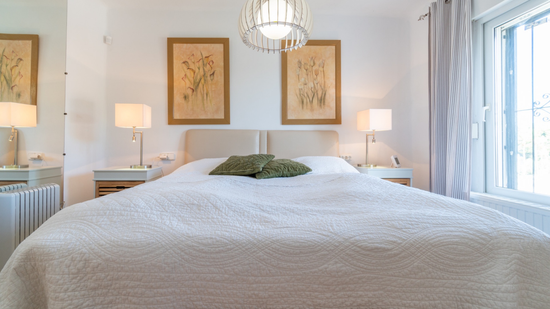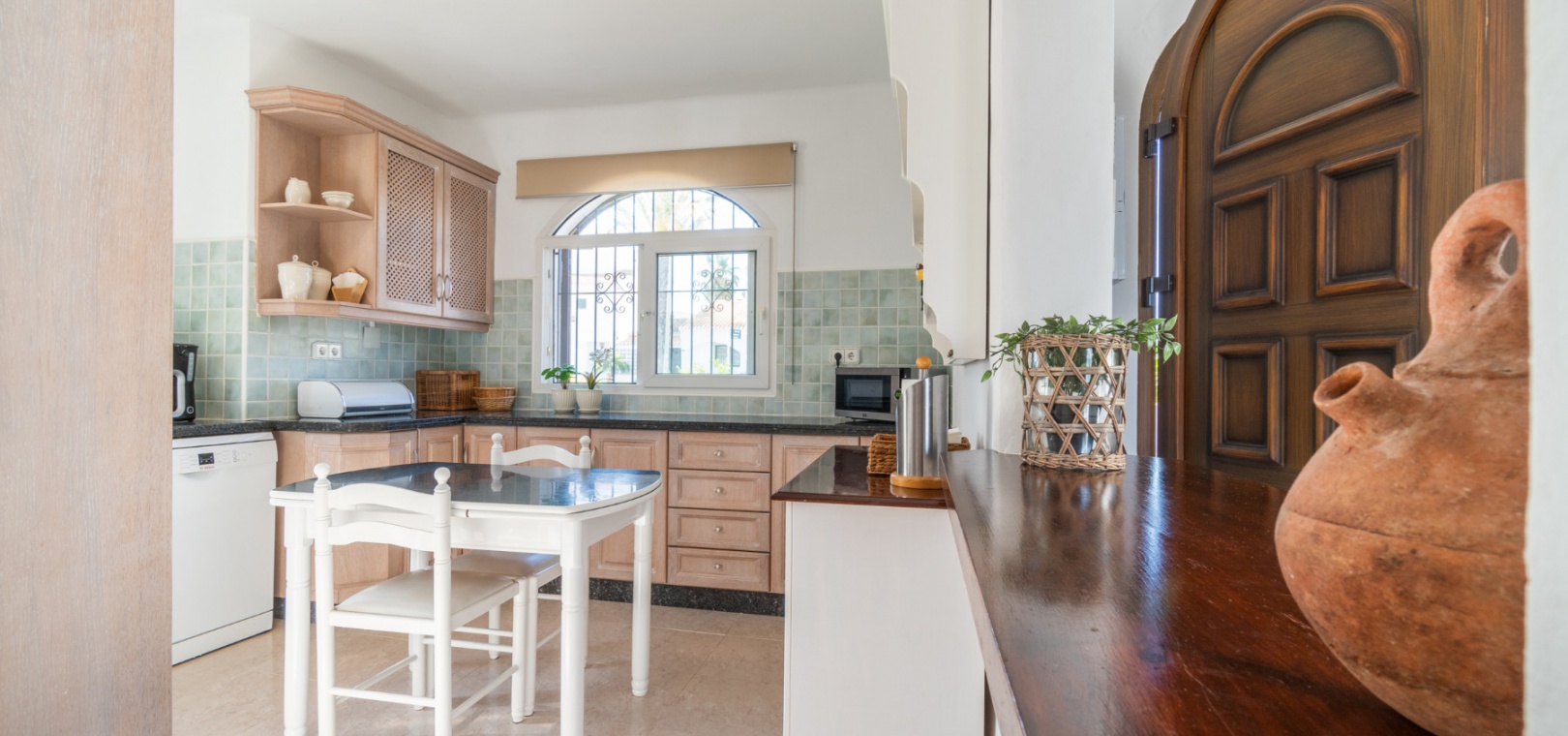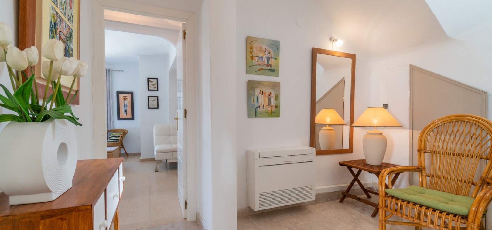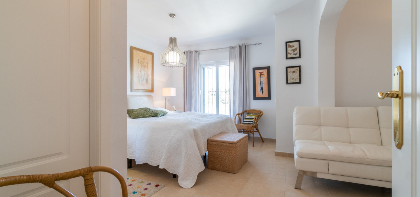 Entering through the front door, you will find yourself in the living and dining room. The ceiling is 2.5 times normal ceiling height, slanting upwards to the big and original wooden beams with 2 x ceiling fans. To the right of the main entrance is a spacious kitchen with marble worktops. On this floor you also have a guest toilet and a storage room.