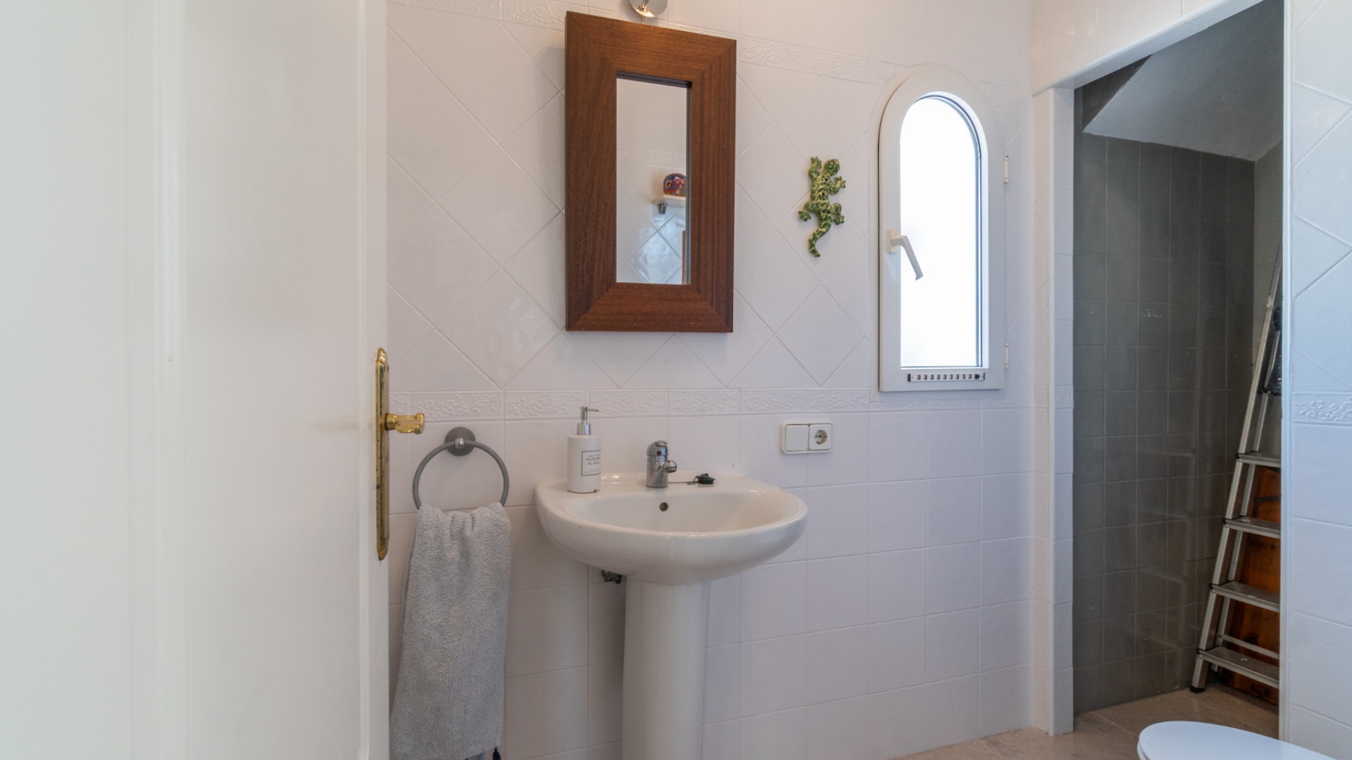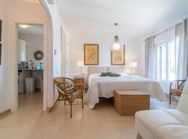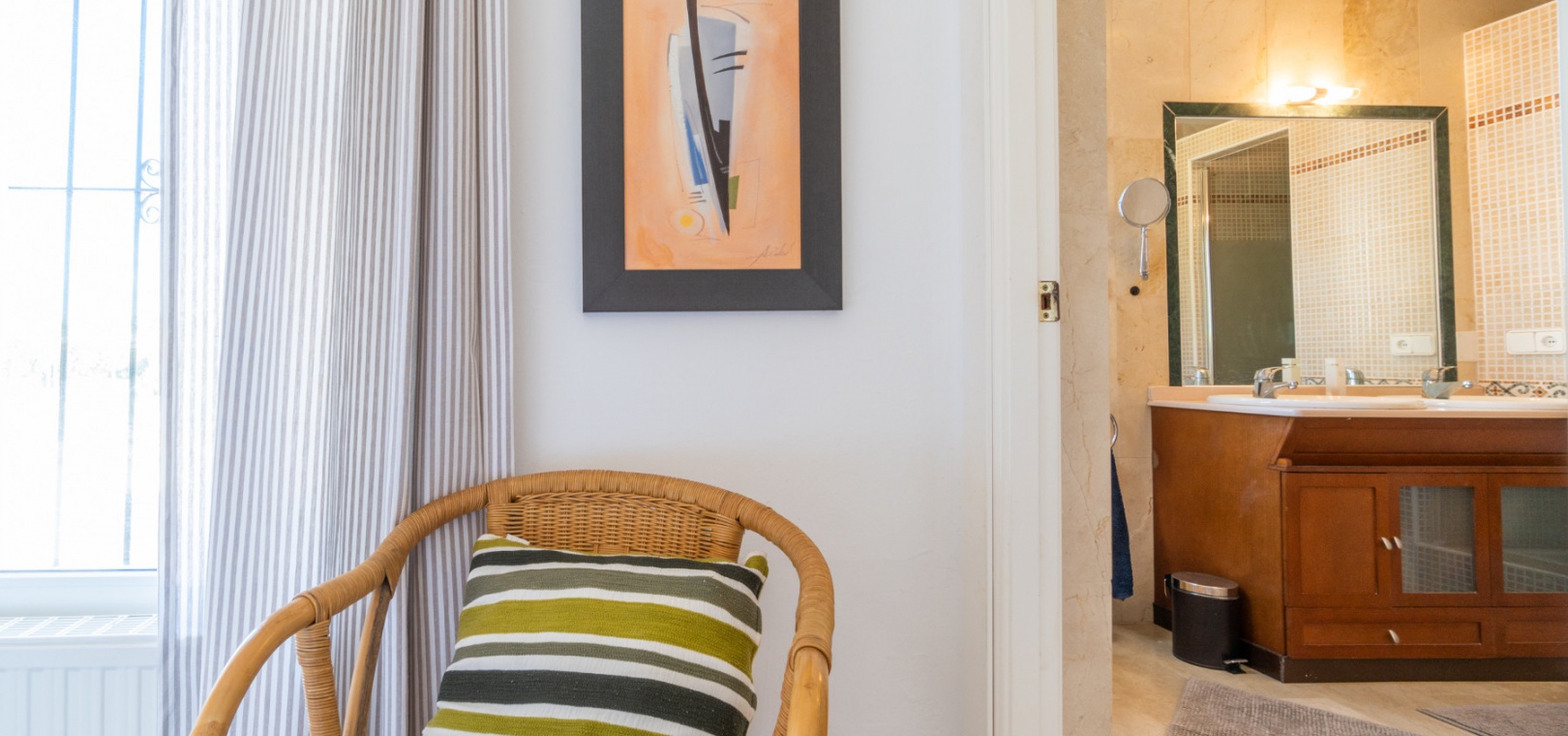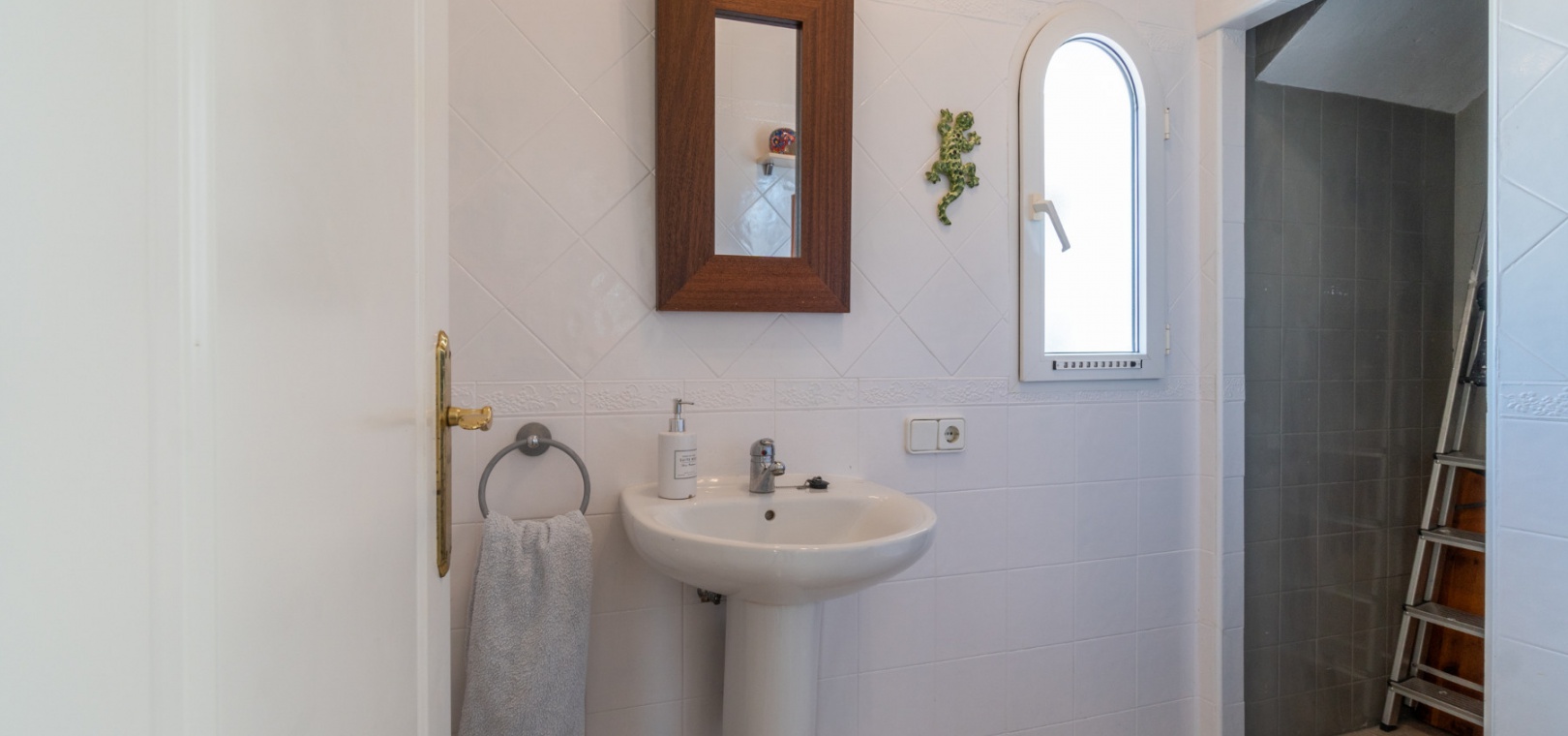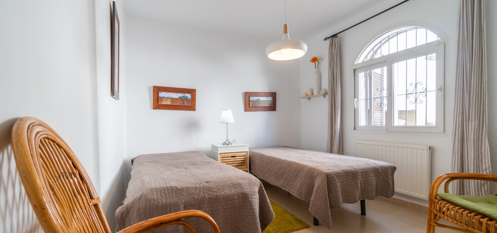 Entering through the front door, you will find yourself in the living and dining room. The ceiling is 2.5 times normal ceiling height, slanting upwards to the big and original wooden beams with 2 x ceiling fans. To the right of the main entrance is a spacious kitchen with marble worktops. On this floor you also have a guest toilet and a storage room.