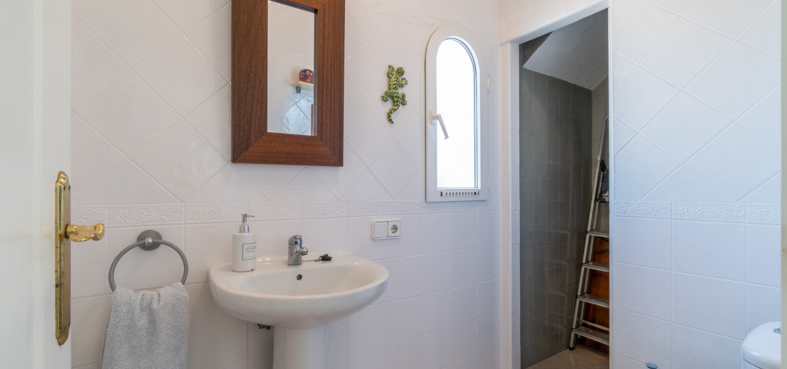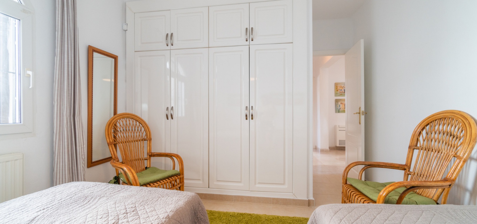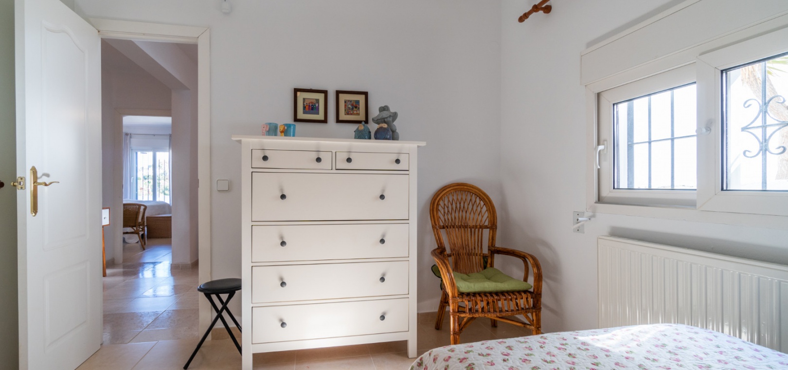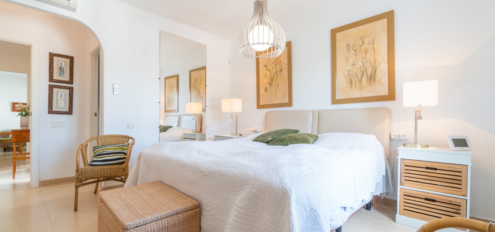 Entering through the front door, you will find yourself in the living and dining room. The ceiling is 2.5 times normal ceiling height, slanting upwards to the big and original wooden beams with 2 x ceiling fans. To the right of the main entrance is a spacious kitchen with marble worktops. On this floor you also have a guest toilet and a storage room.