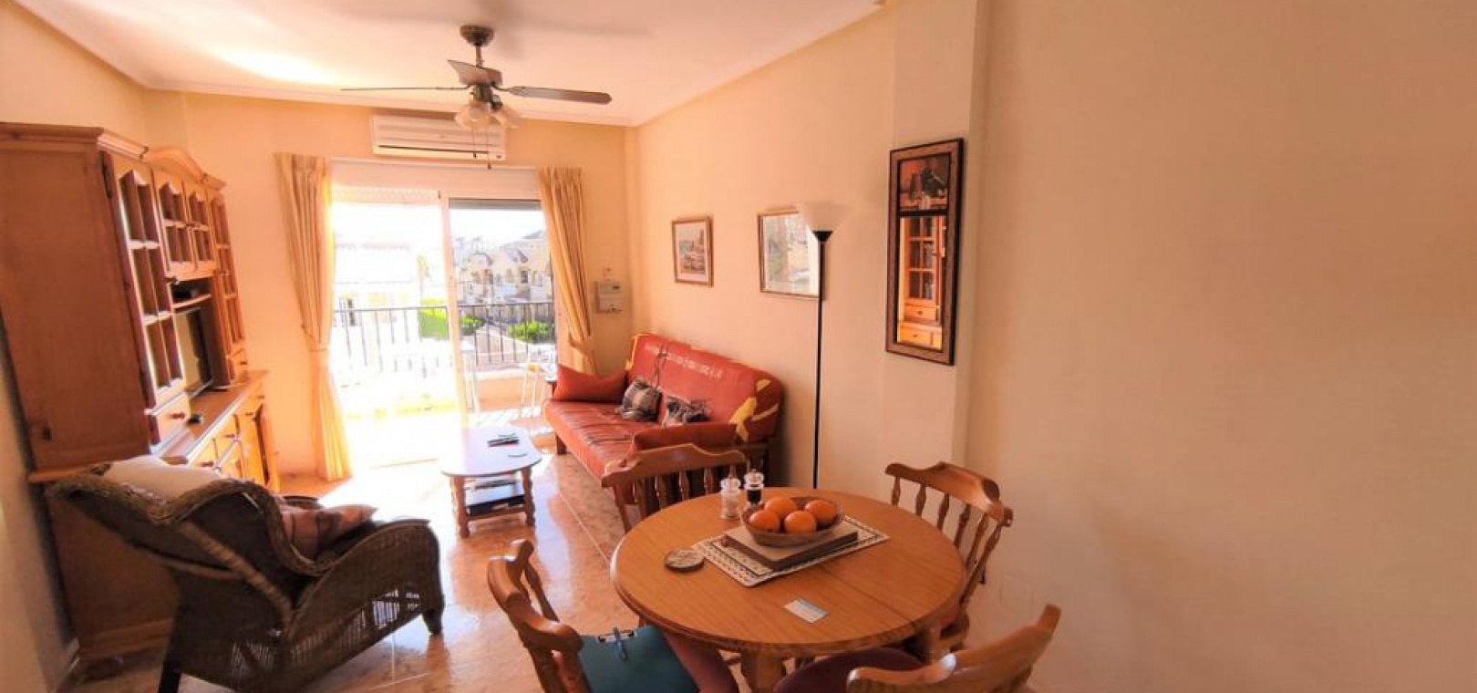 Lounge/diner with hot and cold A/C & a ceiling fan, separate fully fitted kitchen, 1 x double bedroom with fitted wardrobes & ceiling fan, 1 x twin bedroom with views to the communal swimming pool, 1 x family shower room, balcony, private rooftop solarium, communal swimming pool & much more.