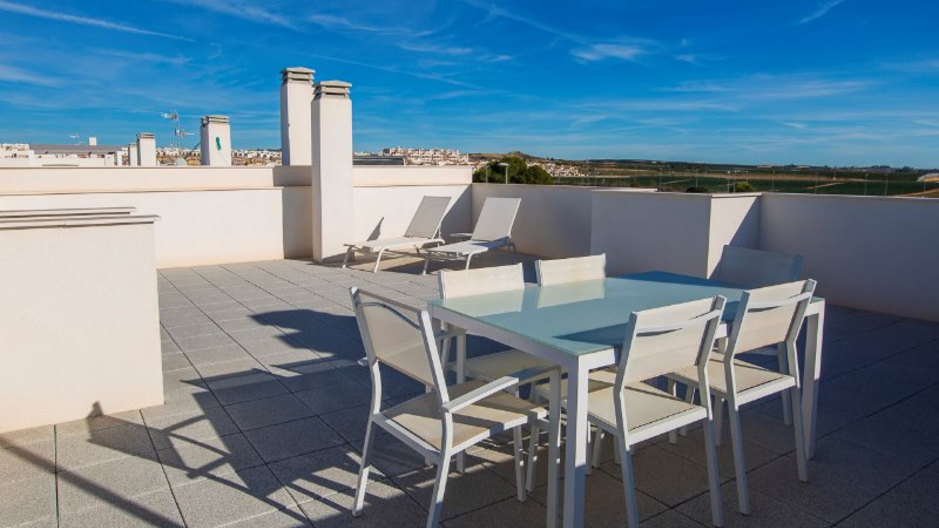 Spacious living room, large open plan fully equipped kitchen, 3 bedrooms with fitted wardrobes, the main one with en-suite shower room, 1 family bathroom with shower, large terrace, private garden or solarium, off-street parking, beautiful communal gardens, beautiful gardens community. swimming pool and much more.