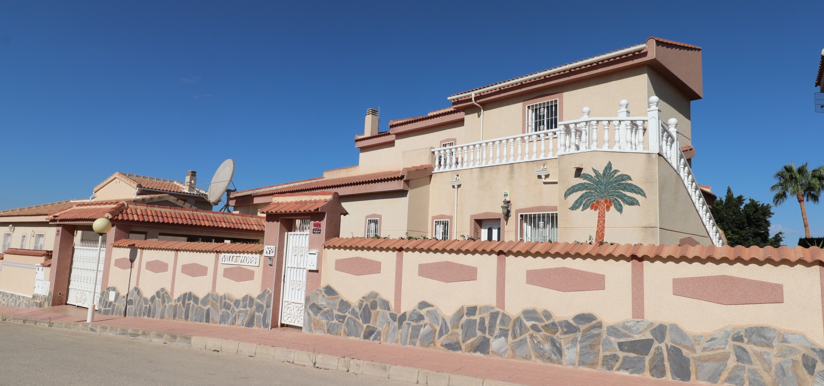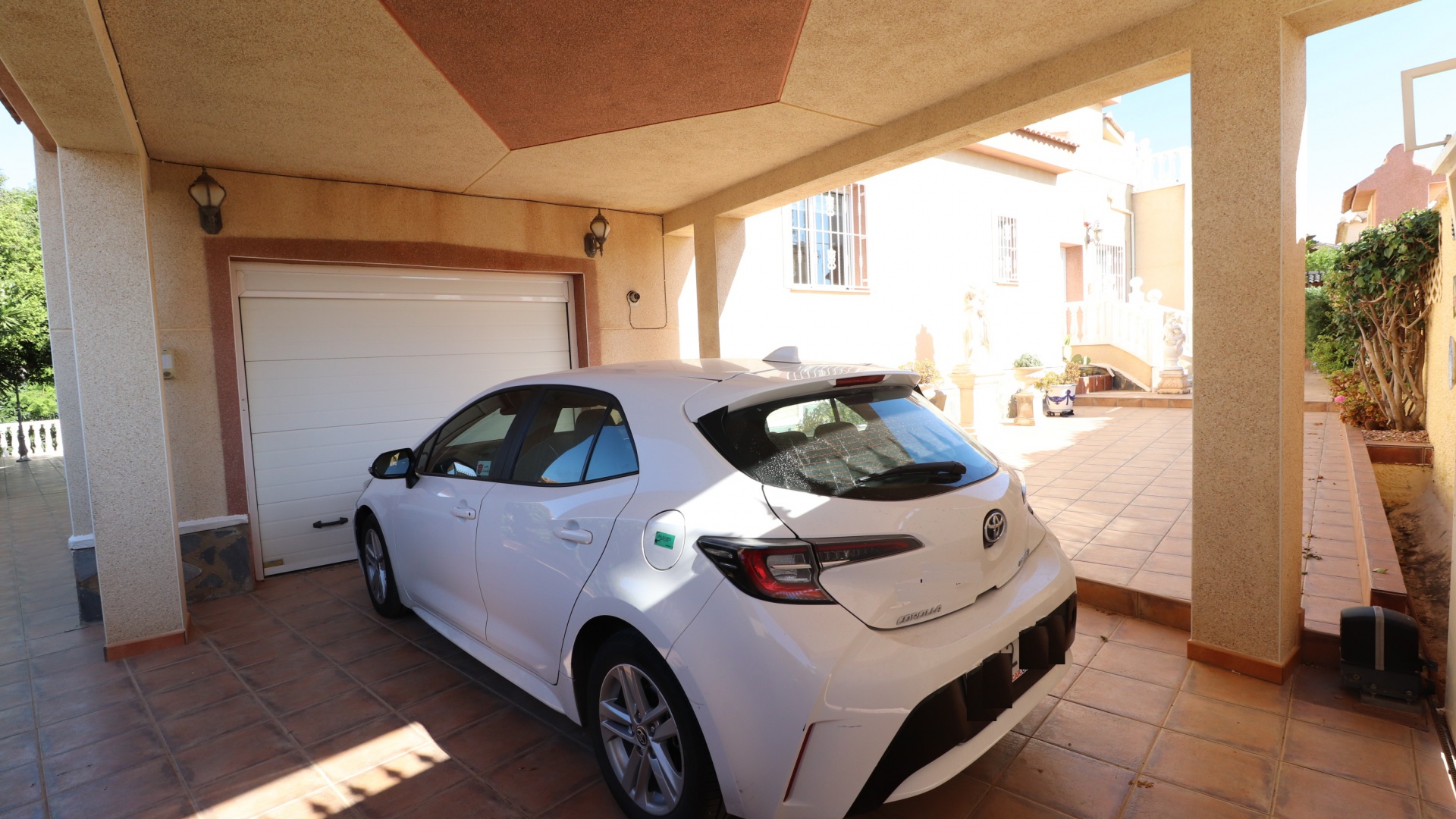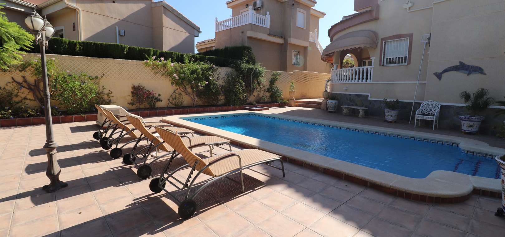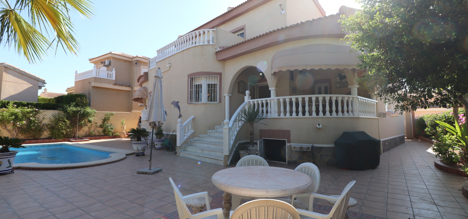 This Beautiful & Traditional Four Bedroom Detached Villa in La Marquesa is located in a prominent position on a desirable golf course, between Rojales and Ciudad Quesada. Within a few minutes drive of the nearest amenities on the course itself, bars, restaurants, shops, supermarkets and more... Guardamar beach is also just a 10/15 minutes drive away. This extremely spacious property of some 234m2 comprises on the ground floor of a lovely entrance via the first covered terrace, great for eating al fresco; main family lounge/dining room; second living space, currently used as a TV room with access out to the second covered terrace, overlooking the private pool; a separate fully fitted kitchen with breakfast bar and direct access out to the terrace; one double master bedroom with en suite corner bath and shower room; and a cloakroom. External stairs from the terrace leads to the first floor, which has two independent rooms, both with access to a Jack & Jill shower room; and an office... Outside set across this fantastic 800m2 plot is a beautifully landscaped garden, mainly tiled with a good variety of plants and trees throughout, ample off road parking, to include a permanent car port, plenty of outdoor dining room, sunbathing space, 10 x 4 swimming pool and an outside toilet, a true garden to enjoy the Spanish lifestyle! Extras included are fitted wardrobes, air conditioning throughout, grills, ceiling fans, separate utility room, central heating, electric gates and storage room... Great property for a great price!